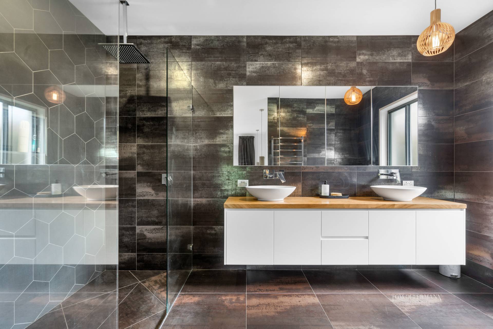 - About: Custom design & build – completed 2015; high ceilings; wide wooden pivot front door with custom stainless steel feature handles; hallway with black shelving/console & spotted gum feature wall; monochromatic palette throughout; grey slate-look tiles; VJ walls most rooms; aircon/fans; insect screens; living with large recess for TV; dining w copper pendants & skylight w VJ shaft; media room w dble doors, shelving & daybed; storeroom adjoins; 4-carpeted bedrooms - king master with roman blinds & wispy linen curtains; walk-in robe; mocha carpet; white washed timber look feature wall; ensuite mocha tiles with copper thread/hexagon shape in dble shower; timber topped 2-basin cabinetry; south wing 3-bedrooms with built-in robes; family bathroom with mocha décor as previous, free standing bath tub; laundry adjacent with access to drying area