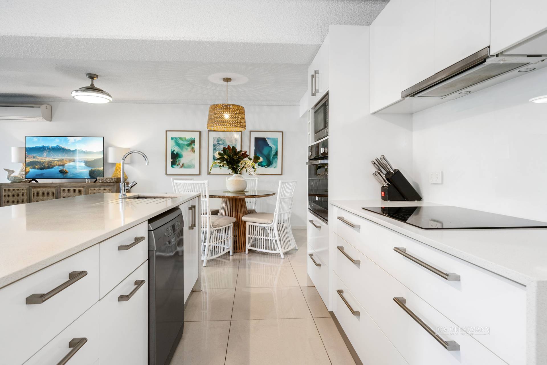 The galley-style contemporary kitchen with stone-topped cabinetry including island/breakfast bar is fully equipped, just in case you wish to cook today's catch of tailor or whiting.