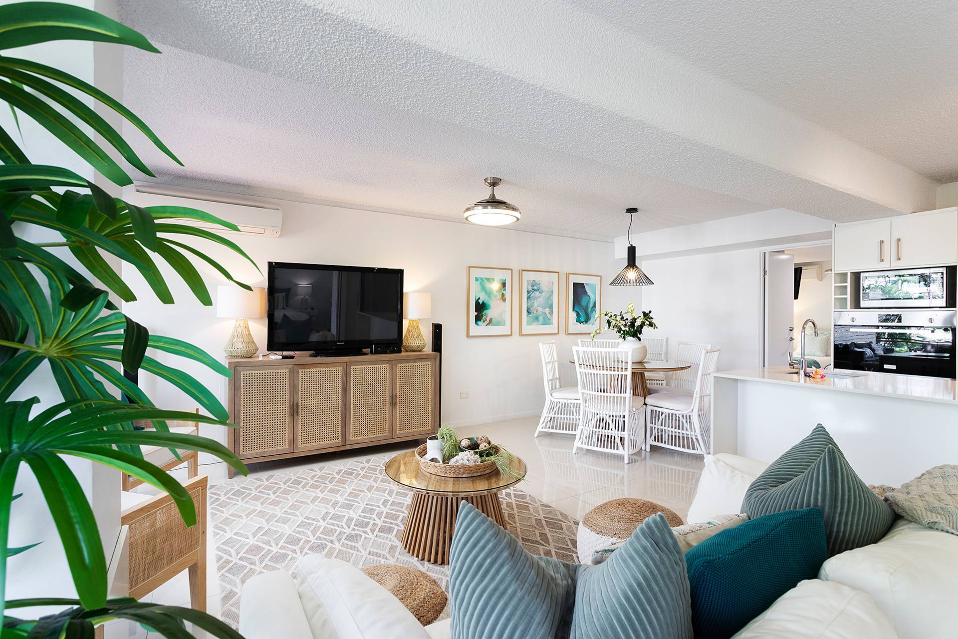 On the ground level, it is easy to sigh when you open the door and peer beyond the hallway to the open-plan, sandy-hued tiled living space with its naturally bright beachy aesthetic and muted monochromatic palette. The perfect complement are high quality furnishings such as a sumptuous sofa, smart television and thoughtful lighting and accessories.