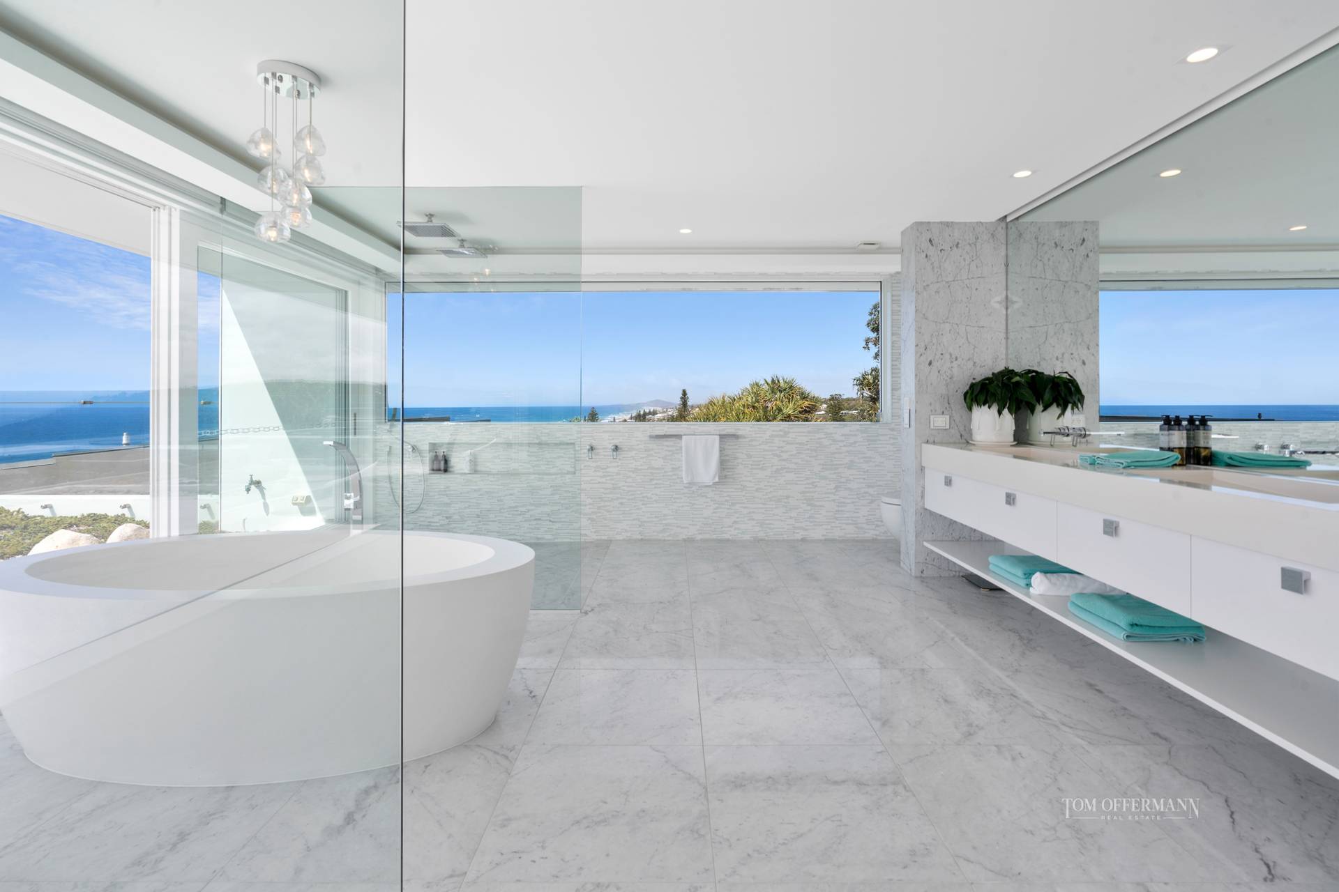 All bathrooms have Thassos lustre marble mosaic tiles, Italian Gessi tapware double LED rainwater showers, and custom-made stone wash planes.