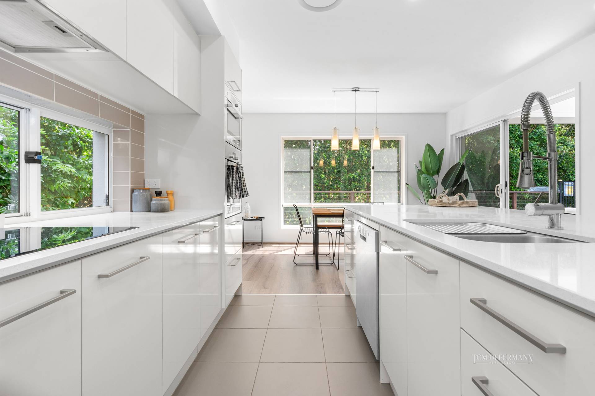 • Kitchen: L- shaped with mocha floor tiles; creamy stone-topped 2-pac cabinetry incl 2.5m island/breakfast bar, gooseneck sink tap & walk-in pantry; Bosch dishwasher, cooktop, oven & micro/convec oven; window splashback to garden view