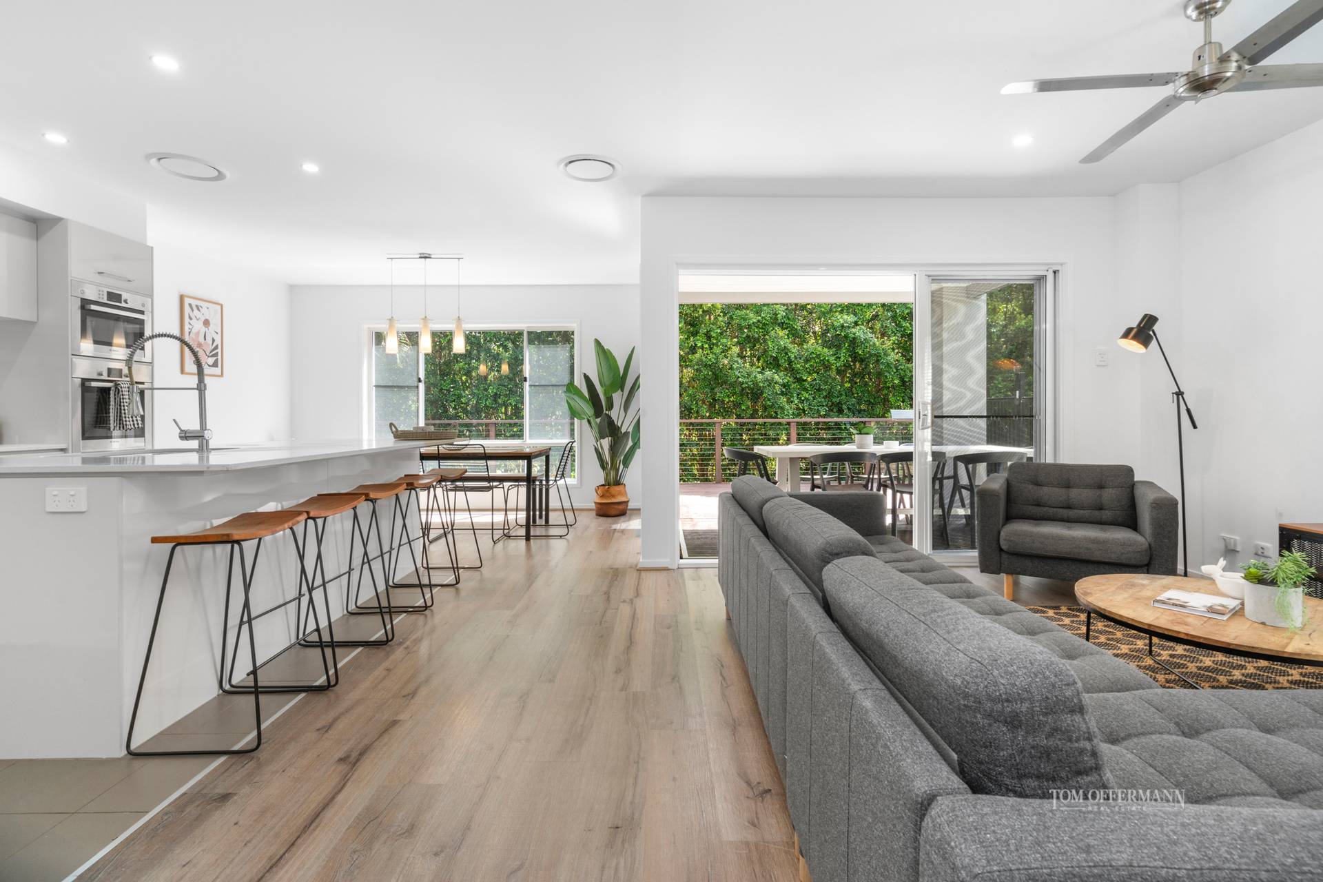 Naturally, nature was the inspiration for this custom-built residence with sub-tropical natives in the front garden and a monochromatic aesthetic which continues indoors from the portico into the hallway with lime-washed grey timber hued flooring.