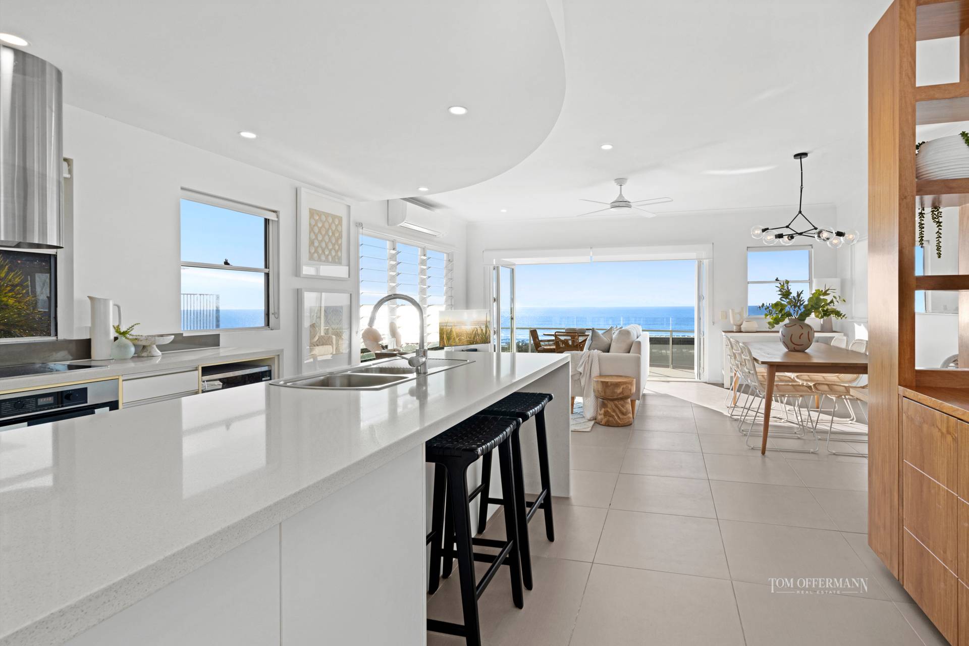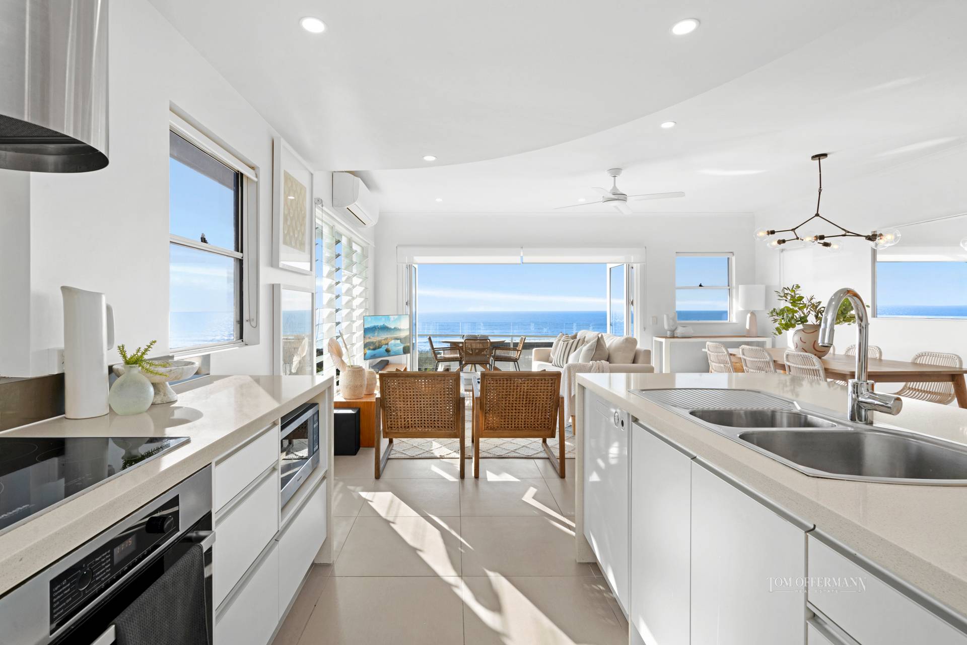 Entertaining alfresco or indoors is a joy when the open plan galley style kitchen with stone-topped white cabinetry including the semi-island/breakfast bar has every premium appliance to suit the enthusiastic cook. The dining area has custom timber cabinetry and a chandelier over the table, and after a meal with family and friends why not sink into a sofa enjoy the fresh sea breeze or cool off in the nearby pool.