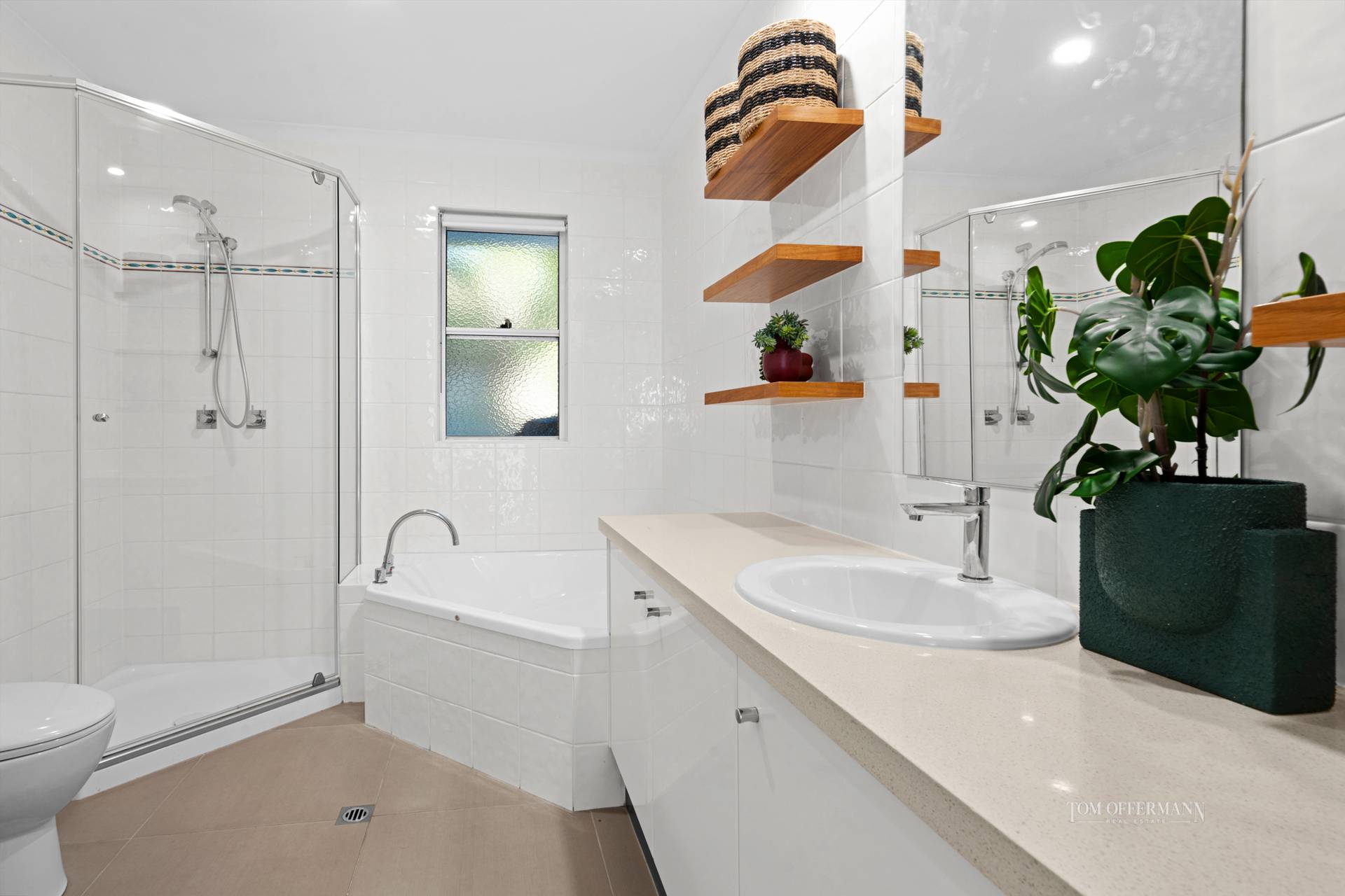 The family sized bathroom has a corner spa bath, separate shower, storage cupboard and white wall tiles with long creamy stone-topped cabinetry.