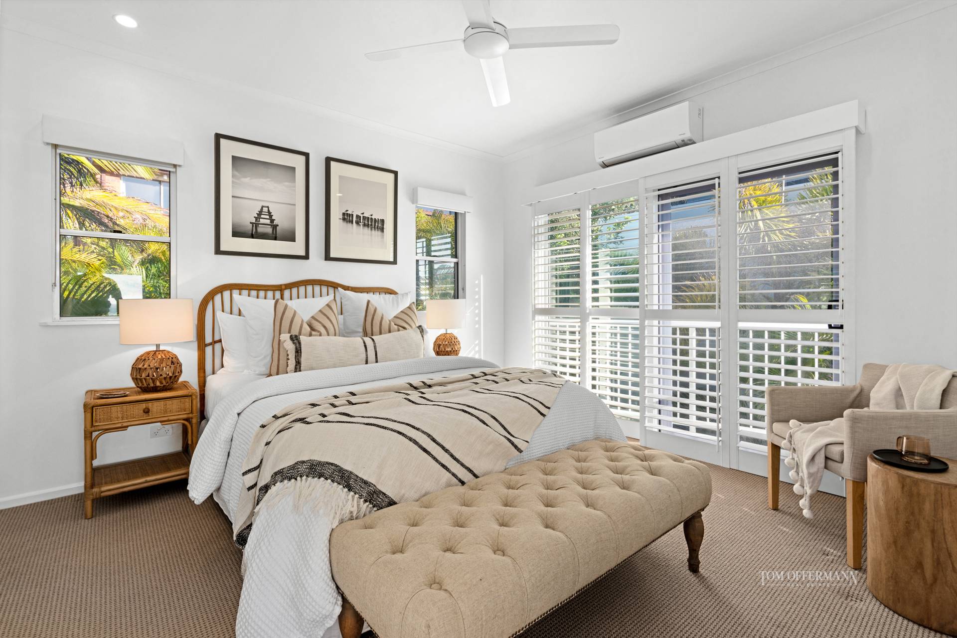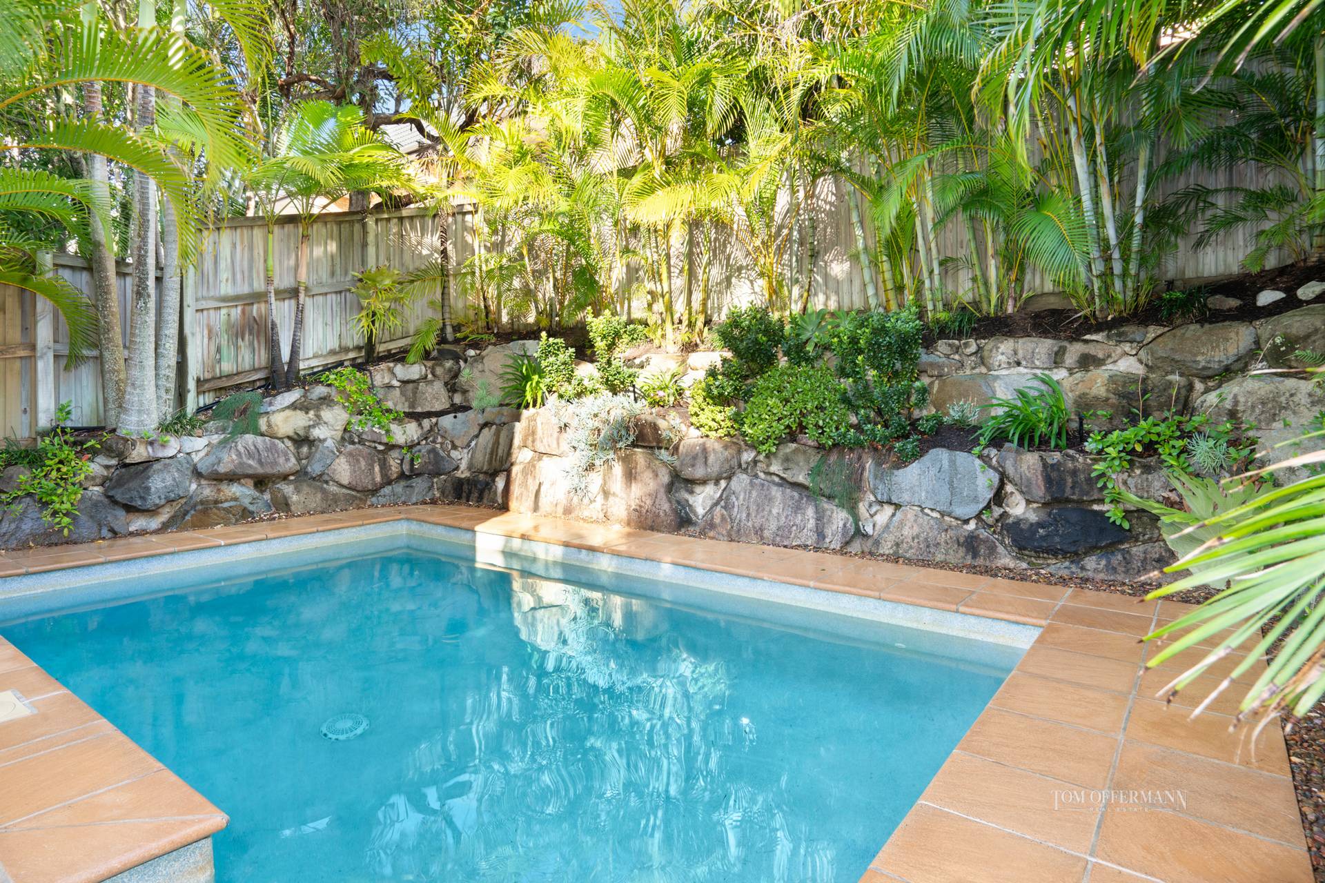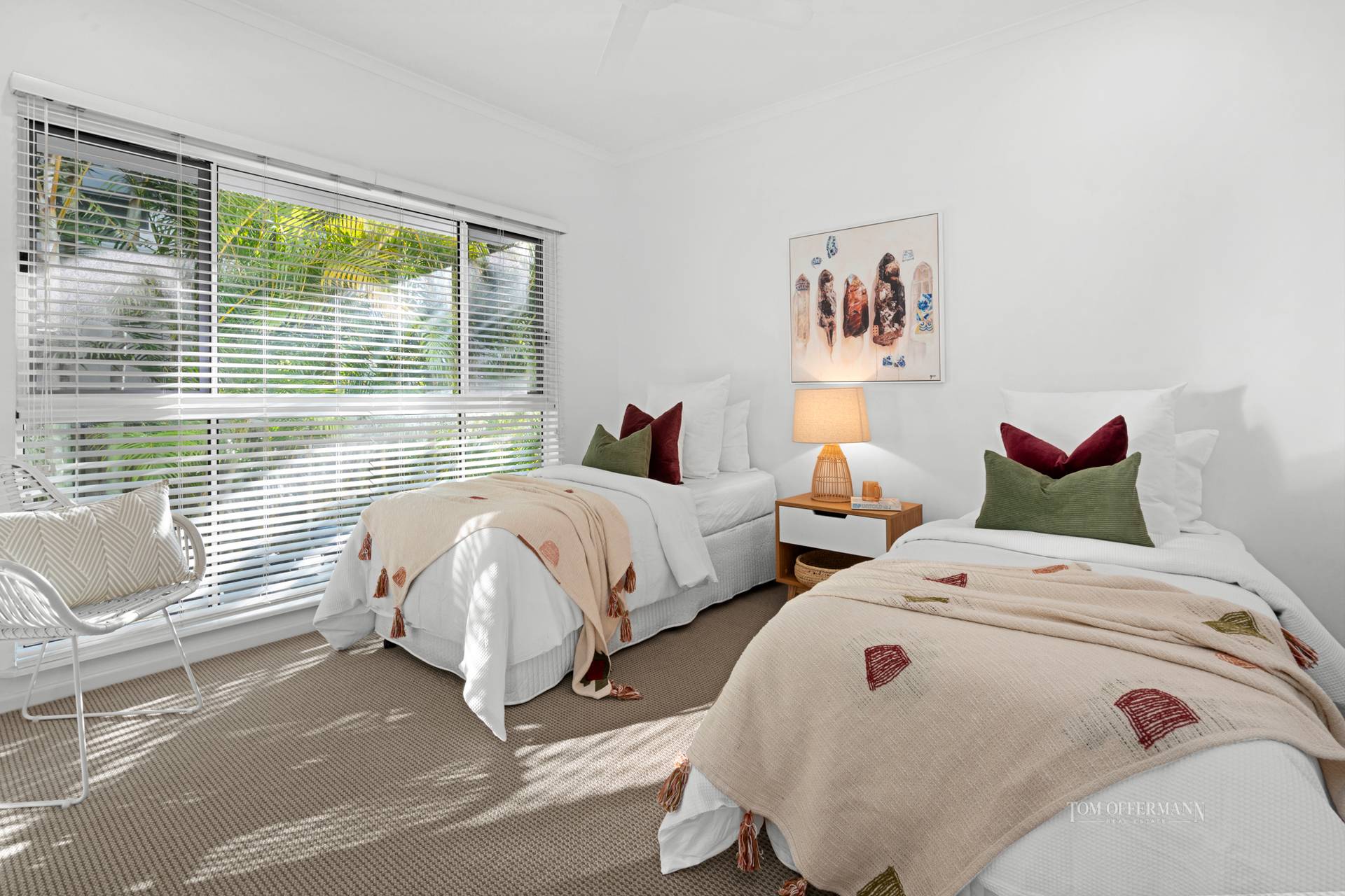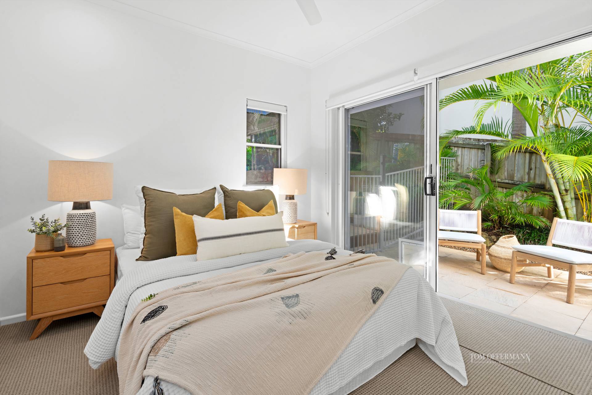 queen/twin carpeted bedrooms have built-in robes, high ceilings and blinds. One has a doggy-door as well as a door which accesses the pathway directly to the private tropically landscaped pool.