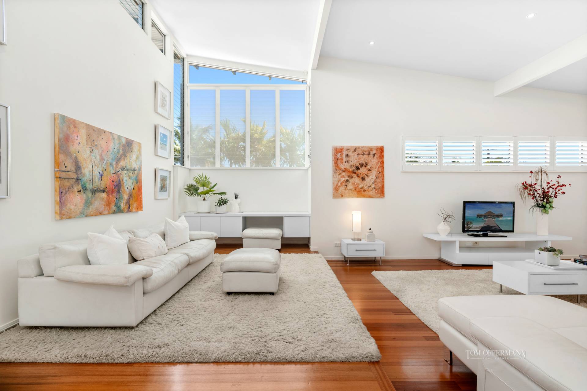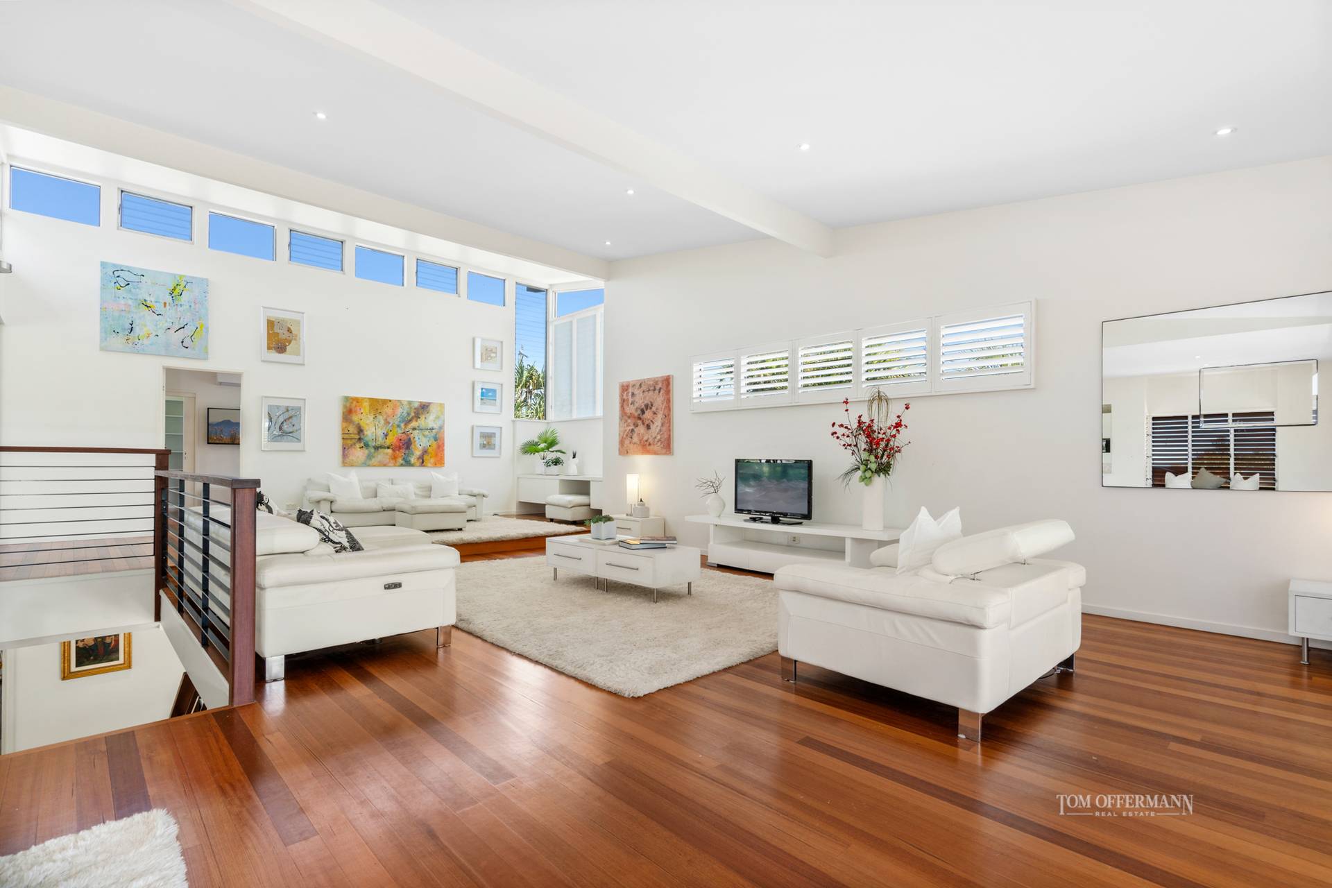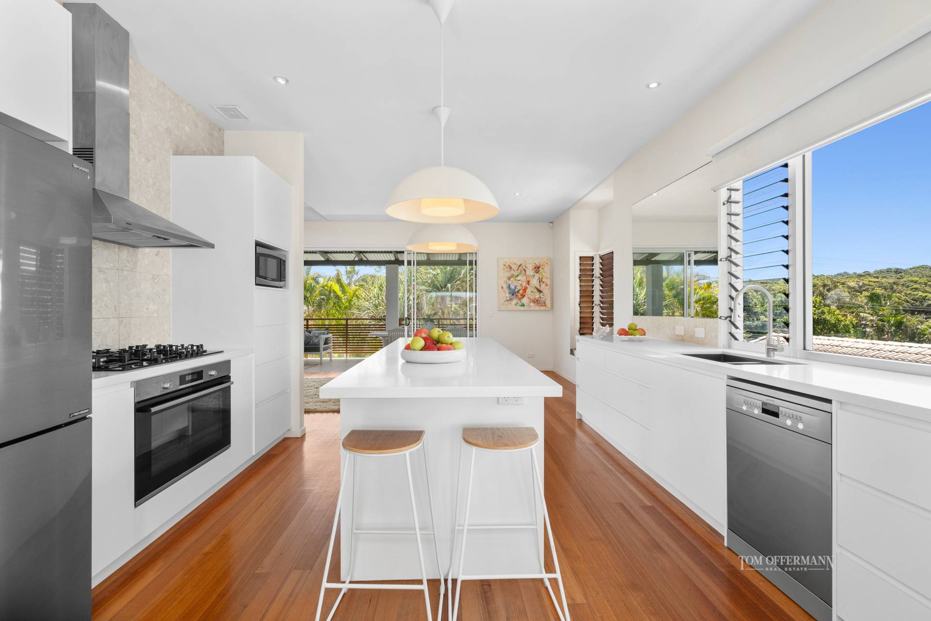 There are five bedrooms and two bathrooms, with the north-facing layout capturing warm natural light and refreshing sea breezes. Beautiful Tasmanian oak timber floors flow through out, combined with soaring ceilings and oversized windows.