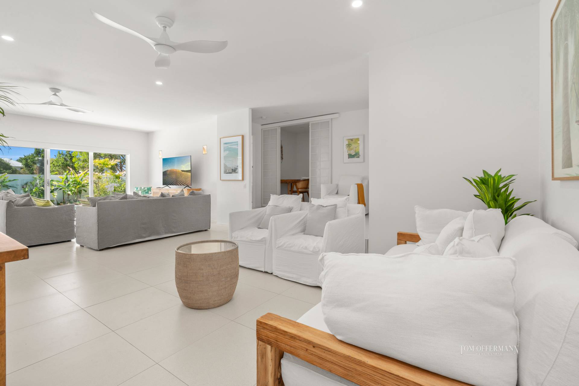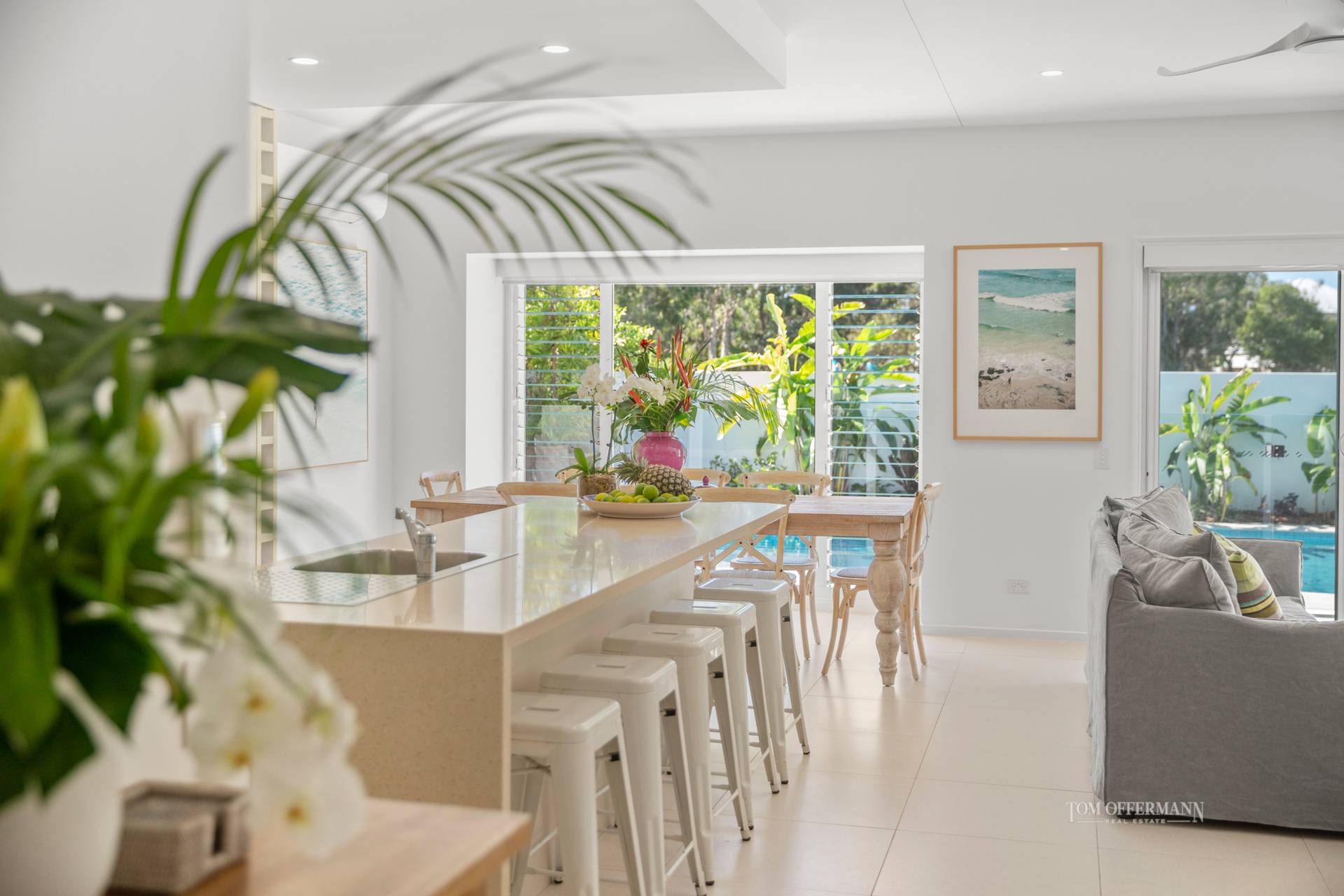 Note how the pastel sandy-hued tiled, over-generous open-plan living and dining spaces are drenched in bright natural light due to the north-easterly aspect, are complemented by a cool beachy aesthetic and sassy furniture, banks of plantation shutters and artworks adding pops of colour.