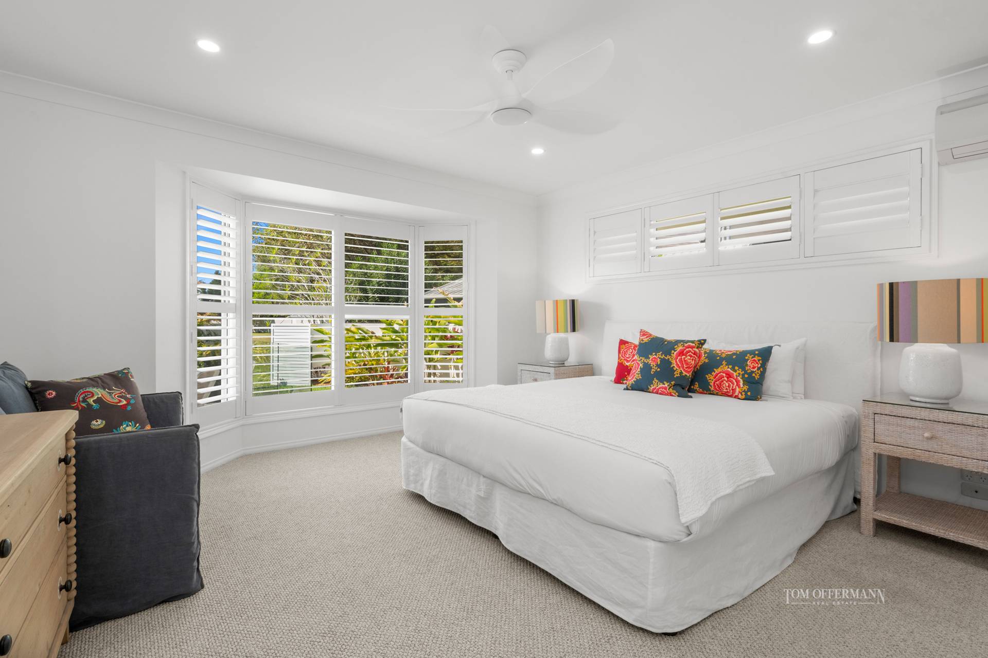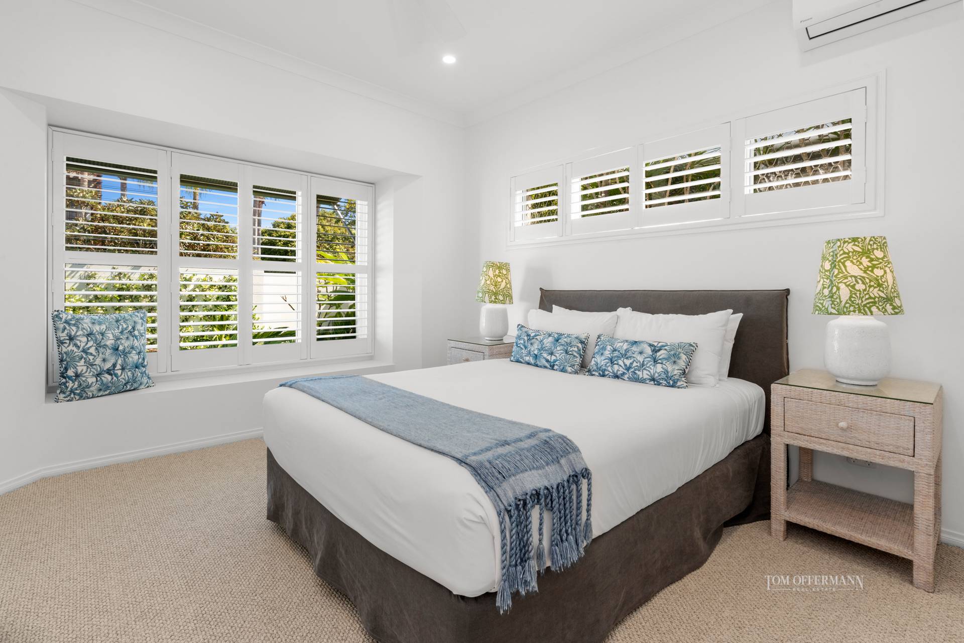 • About: pastel sand-toned tiles; leisure/study space w bi-folds; open plan living/dining; luxe coastal furniture, accessories & artworks; Smart TVs; outdoor terrace w 2 entertaining/relaxing options; 3 bedrooms – carpeted king master w massive walk-in robe, ensuite w cinnamon-hued tiles & bathtub + outlook to pool, garden & park; BBQ; queen bedroom w plantation shutters, day bed & built-in robes; twin bedroom w plantation shutters & built-in robe; laundry w LG dryer & Westinghouse washer; dble garage w storage; aircon/fans