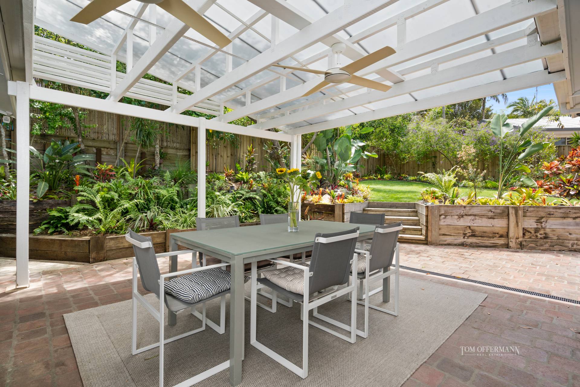 Also, off the indoor dining space is a delightfully generous paved, north-facing terrace, more an outdoor room with high all-white beams, fans and a translucent perspex roof and where cool alfresco lunches and dinners are a dream. Lawn adjoins and glorious landscaped gardens with bromeliads, ferns, fan palms, kangaroo paw and a feature melaleuca extend to the side of residence.