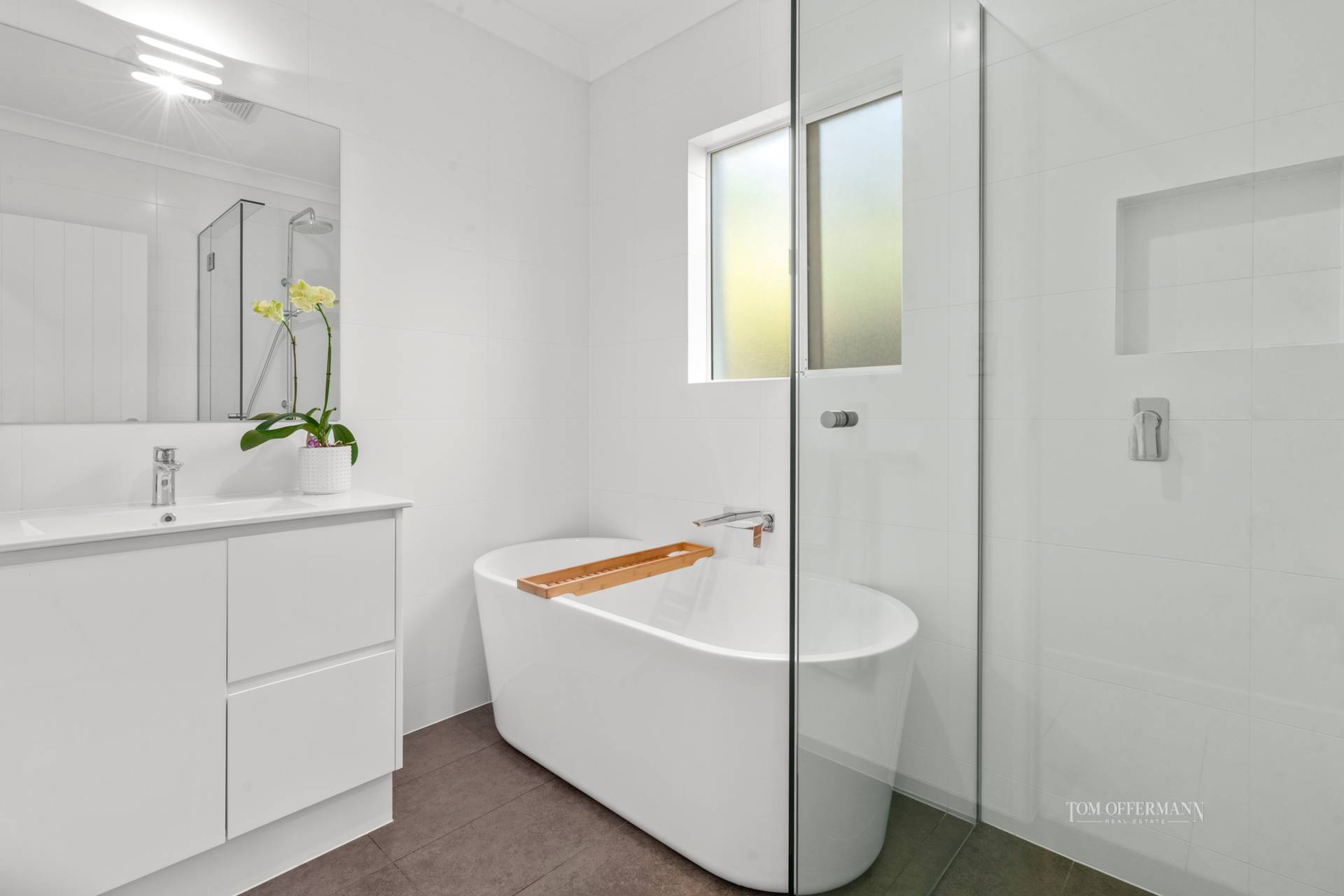 There are three carpeted bedrooms with built-in robes. The main king bedroom which opens to the undercover terrace has a white-tiled ensuite. Two queen bedrooms, looking out to gardens either on the east or west side share a bathroom with freestanding bath and there's a separate toilet. The laundry with linen storage has access to drying area and side garden, where there are water tanks and a shed.