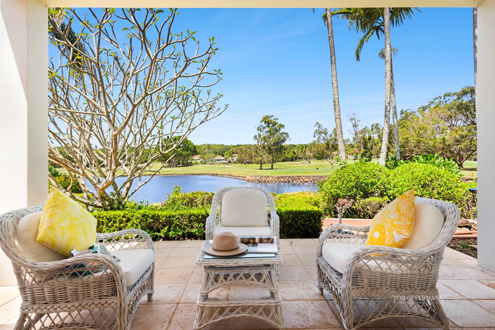 With its idyllic aspect and uninterrupted water and golf course views including the par 3, 13th green, entertaining on the terrace is a breeze from long lunches to sundowners watching the local fauna and birdlife on the course or admiring the flowering frangipanis in the rear garden.