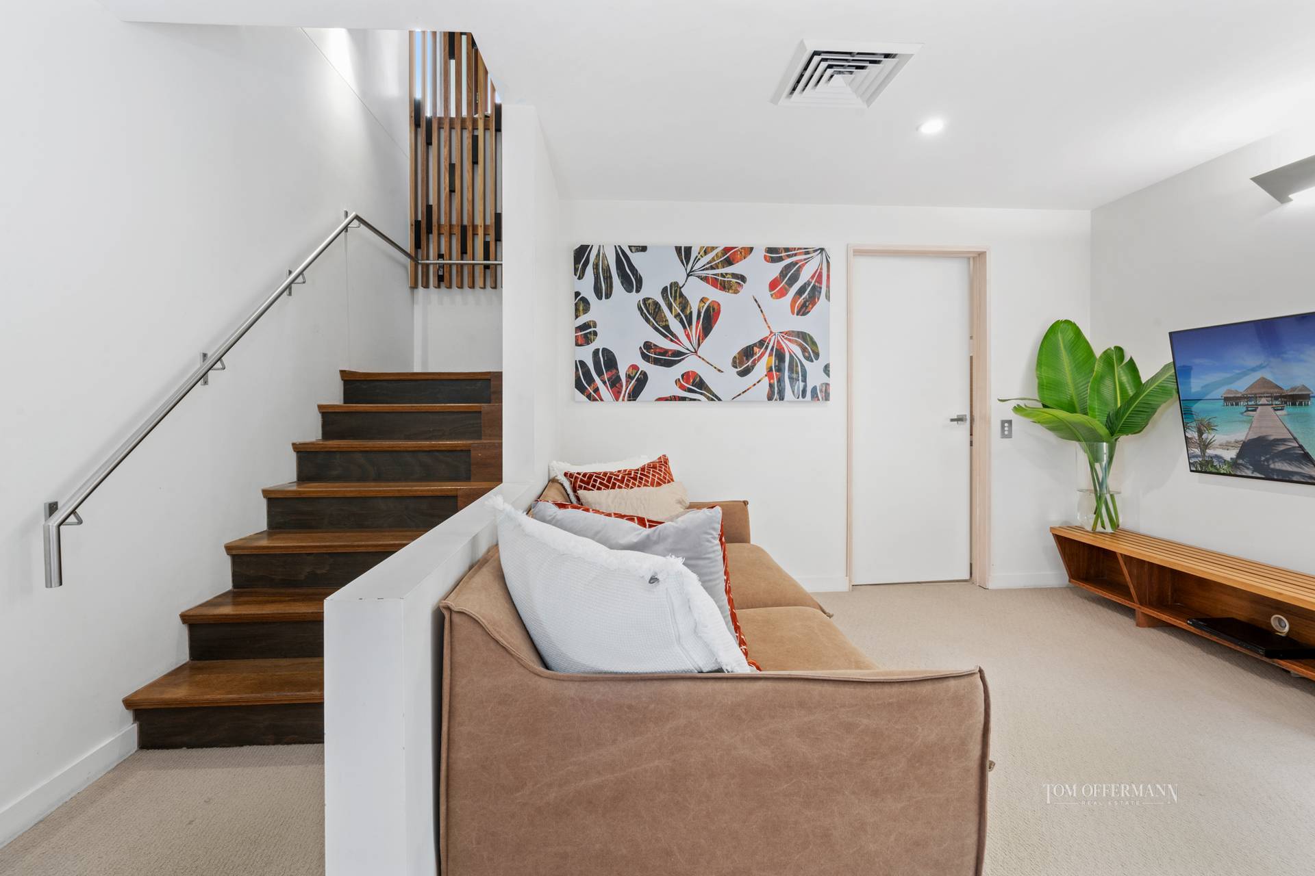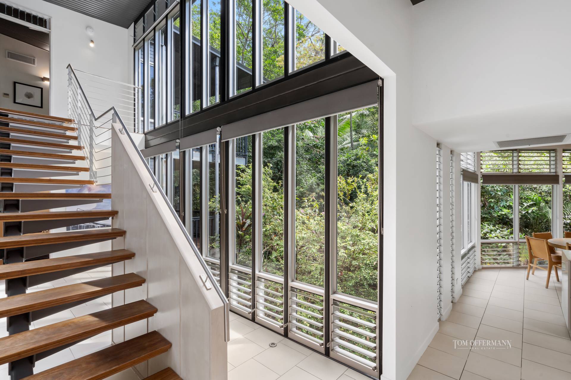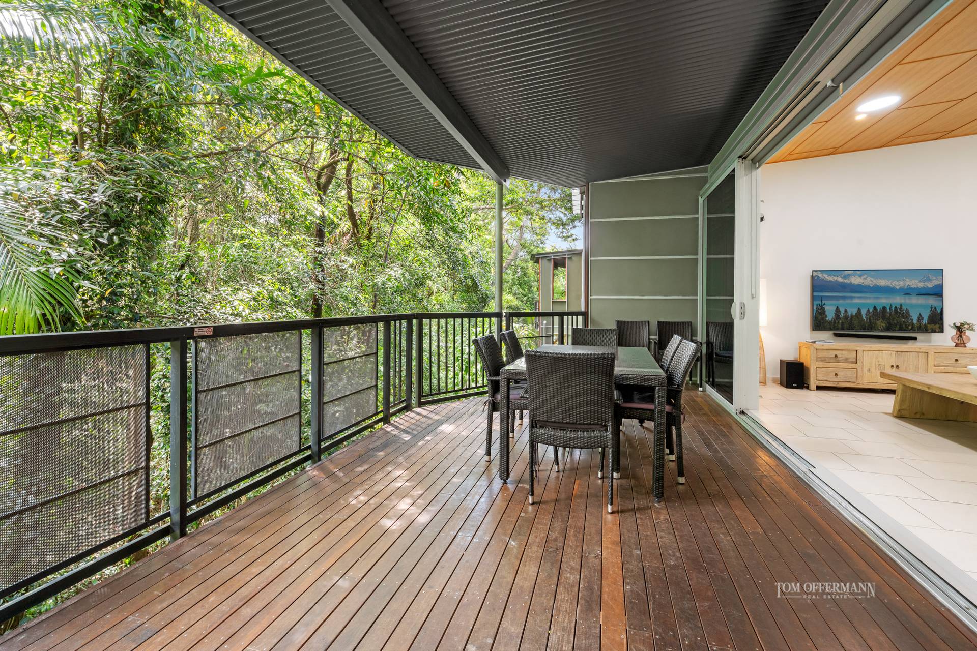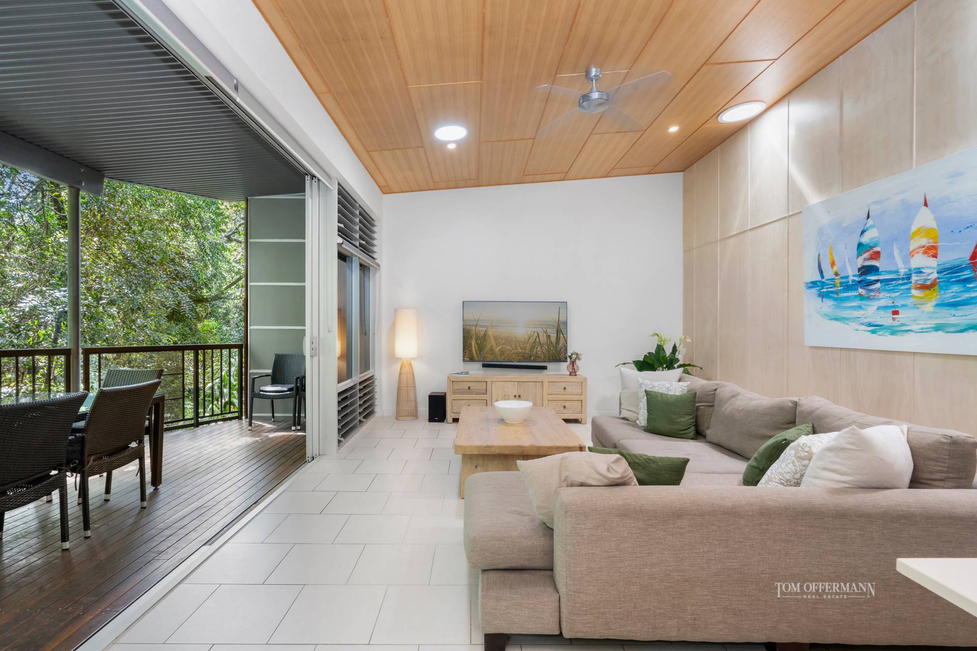 Thanks to expansive disappearing doors opening to west-facing long wide terraces, the open plan living areas benefit from abundant filtered natural light. The main alfresco undercover space with large rattan table and chairs suggests many entertaining options from barbeques to quiet moments recharging life's batteries. That's so easy when you're seemingly perched in the canopy of verdant rainforest plantings including palms, listening to choruses of birdsong and the trickling freshwater creek below.