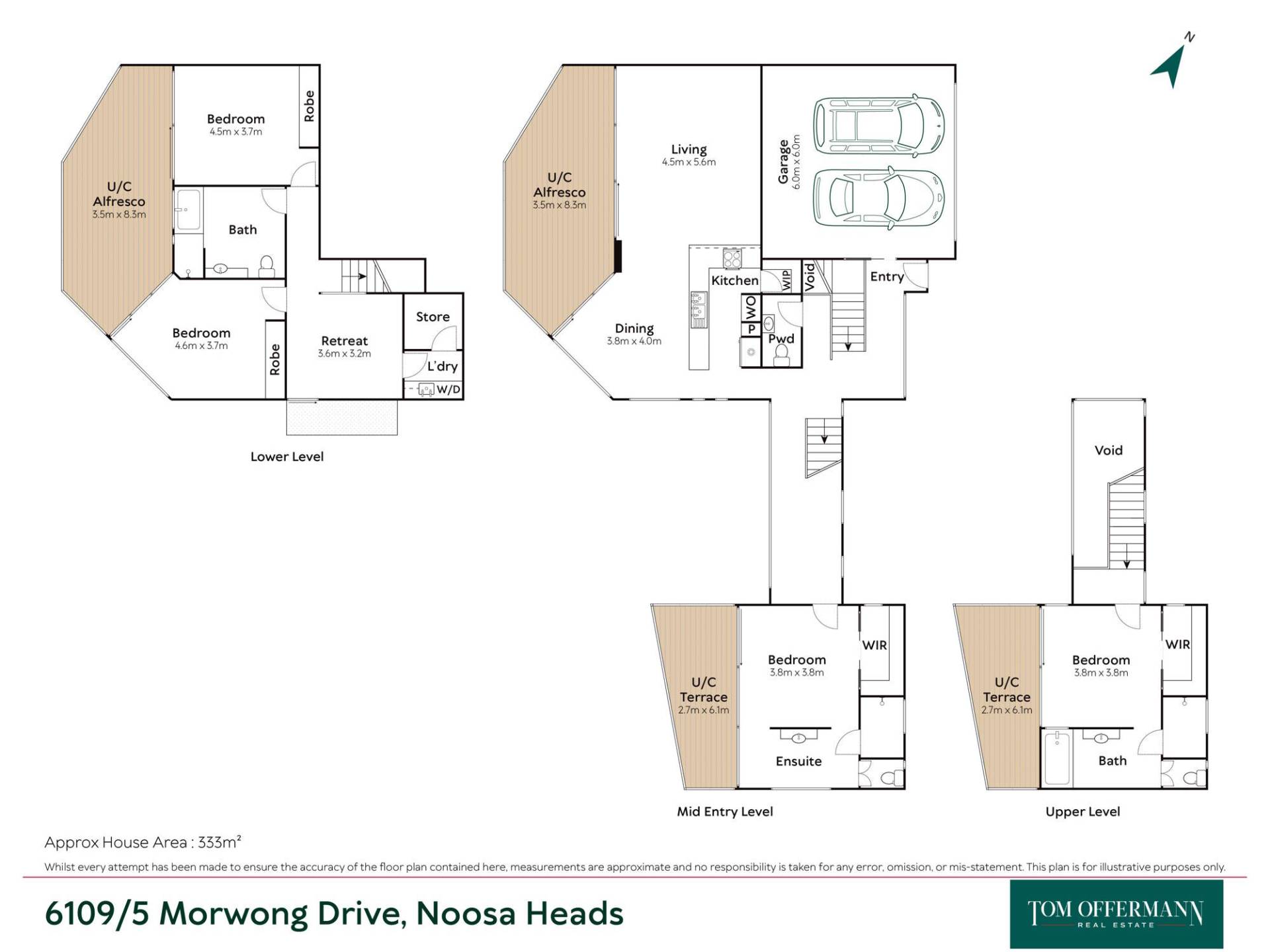 - Terraces: 4 undercover west facing – 3.5m x 8.5m off living/dining/bedroom on lower/ mid entry levels; 2.7m x 6.1m off premier bedroom suites on mid entry & upper levels