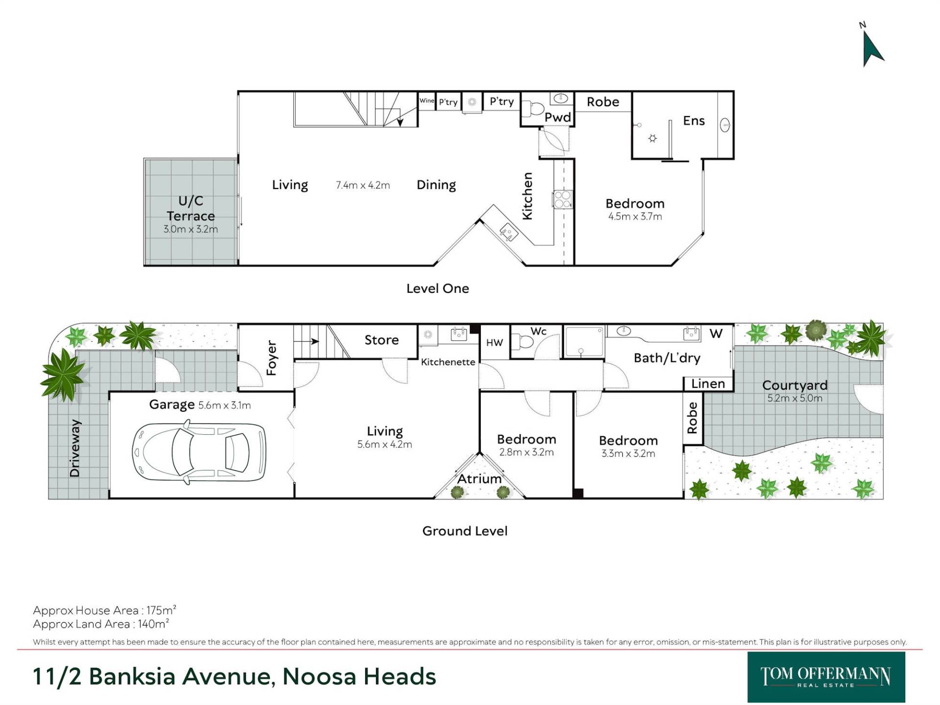 • Terrace: private 5.2x5m north facing rear courtyard w gated access to leafy reserve leading to Noosa Drive & Pinaroo Park; 3x3.2m upper terrace overlooking resort pool