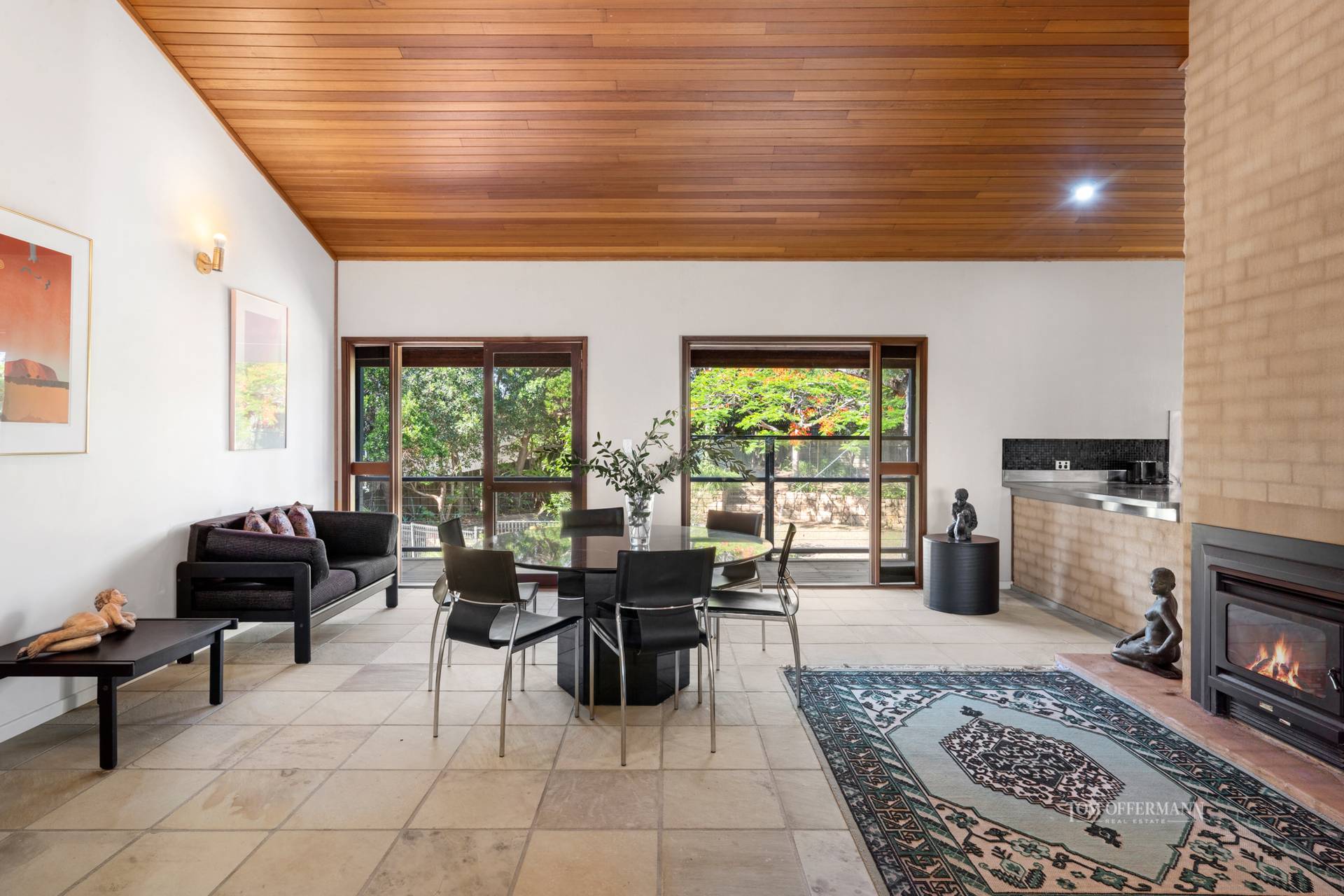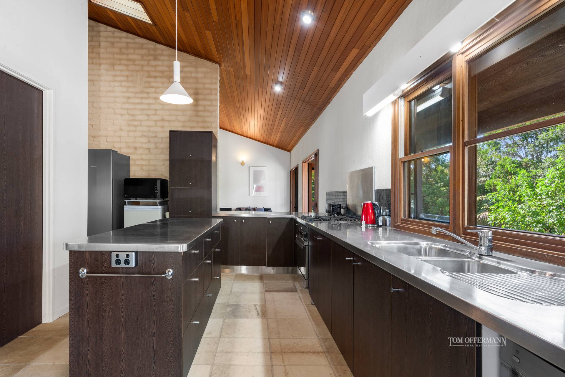 walls, sash windows, skylight, and raked timber lined ceilings are present;