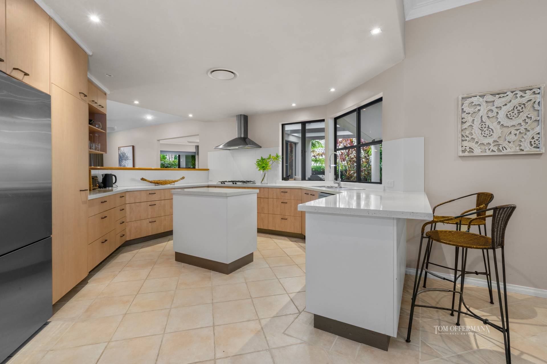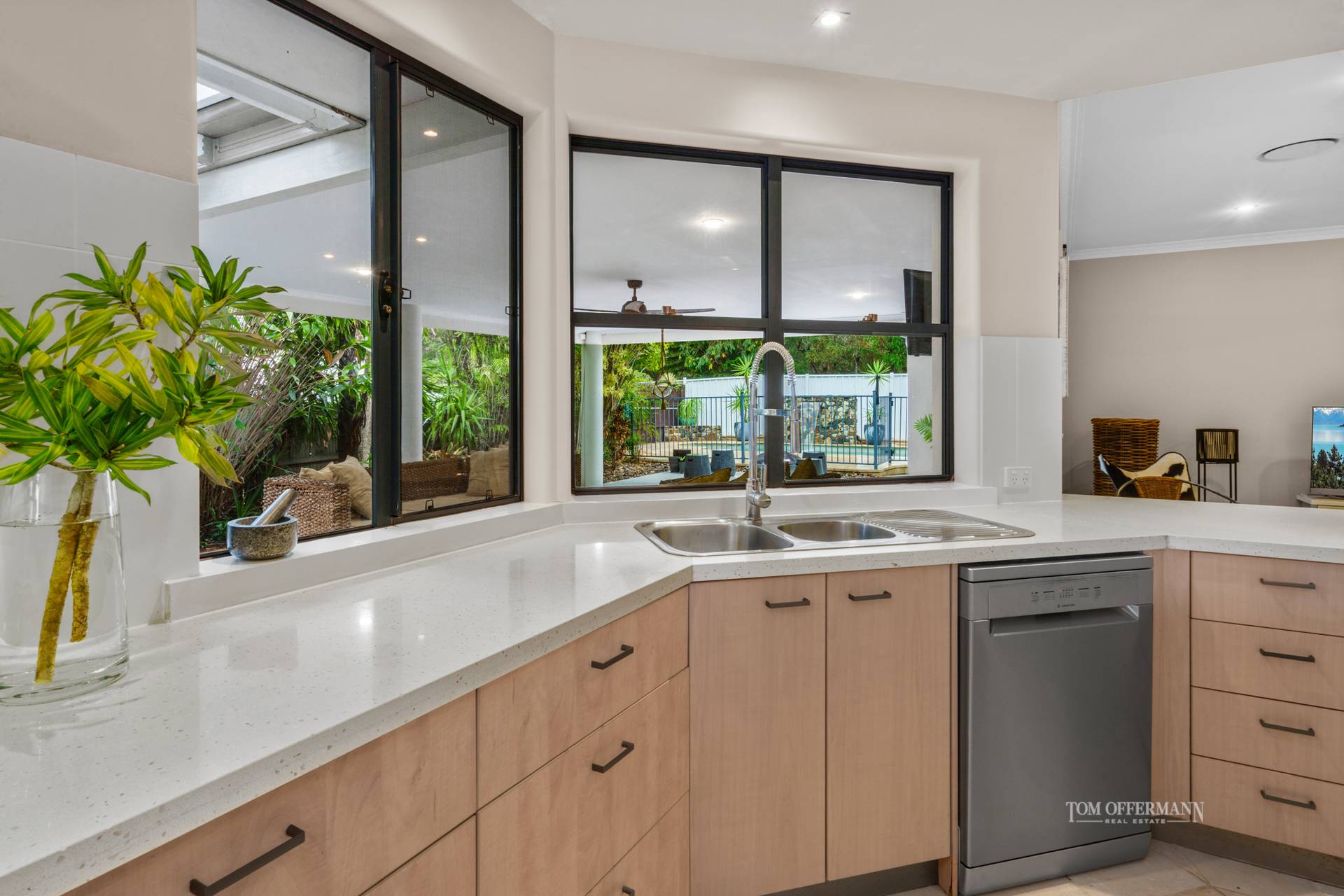 • An open-plan kitchen adorned with stone benchtops and ample storage