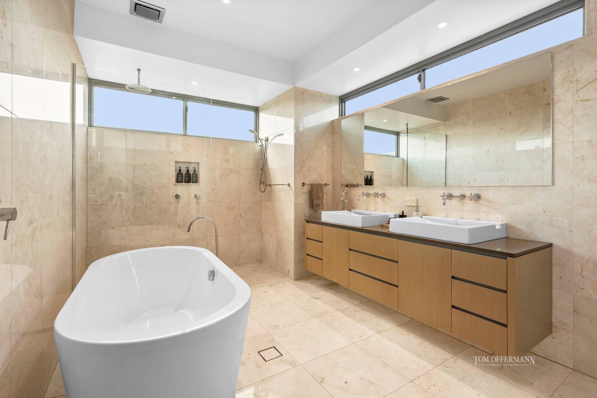 cabinetry, travertine tiles, and rain head drencher showers. Adjacent is a