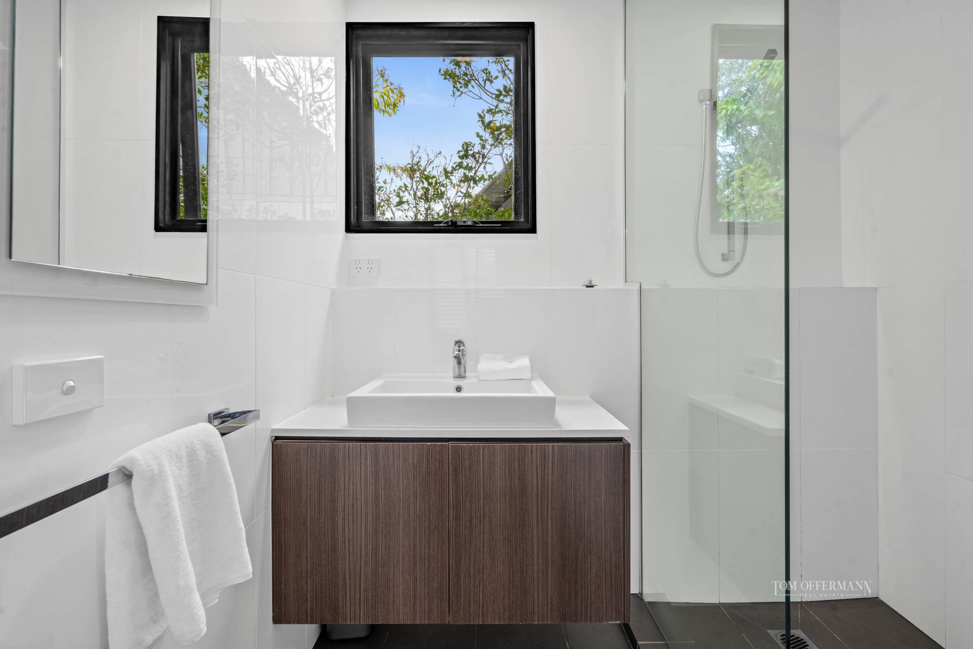 On the upper level, two large bedrooms have white & grey-tiled ensuites to match the downstairs aesthetic, built-in robes and air-conditioning. Downstairs on the ground level is a laundry combo with a very handy store room. Some owners have built in a third sleep out and bathroom to this area which is also a feasible value add.