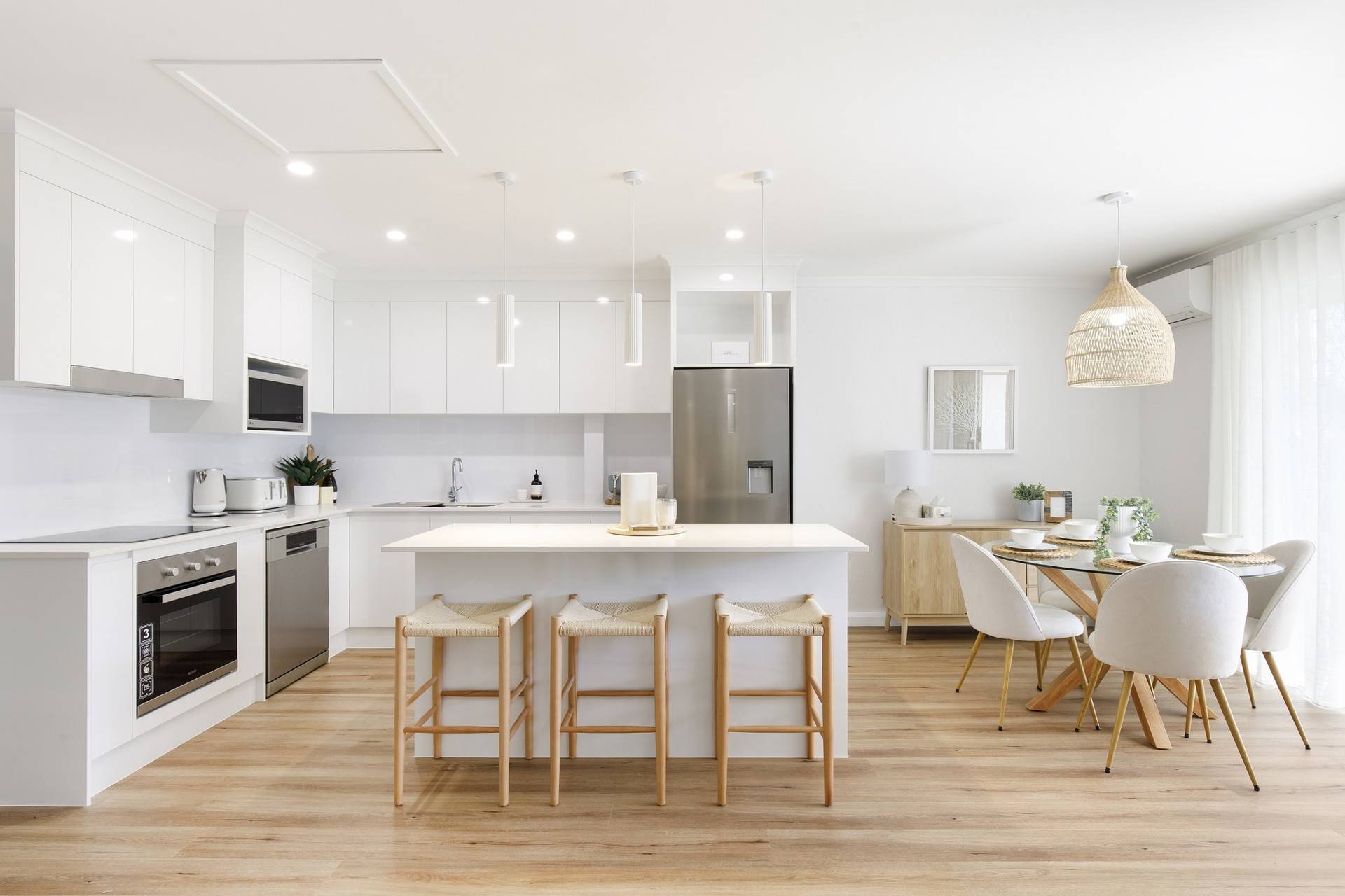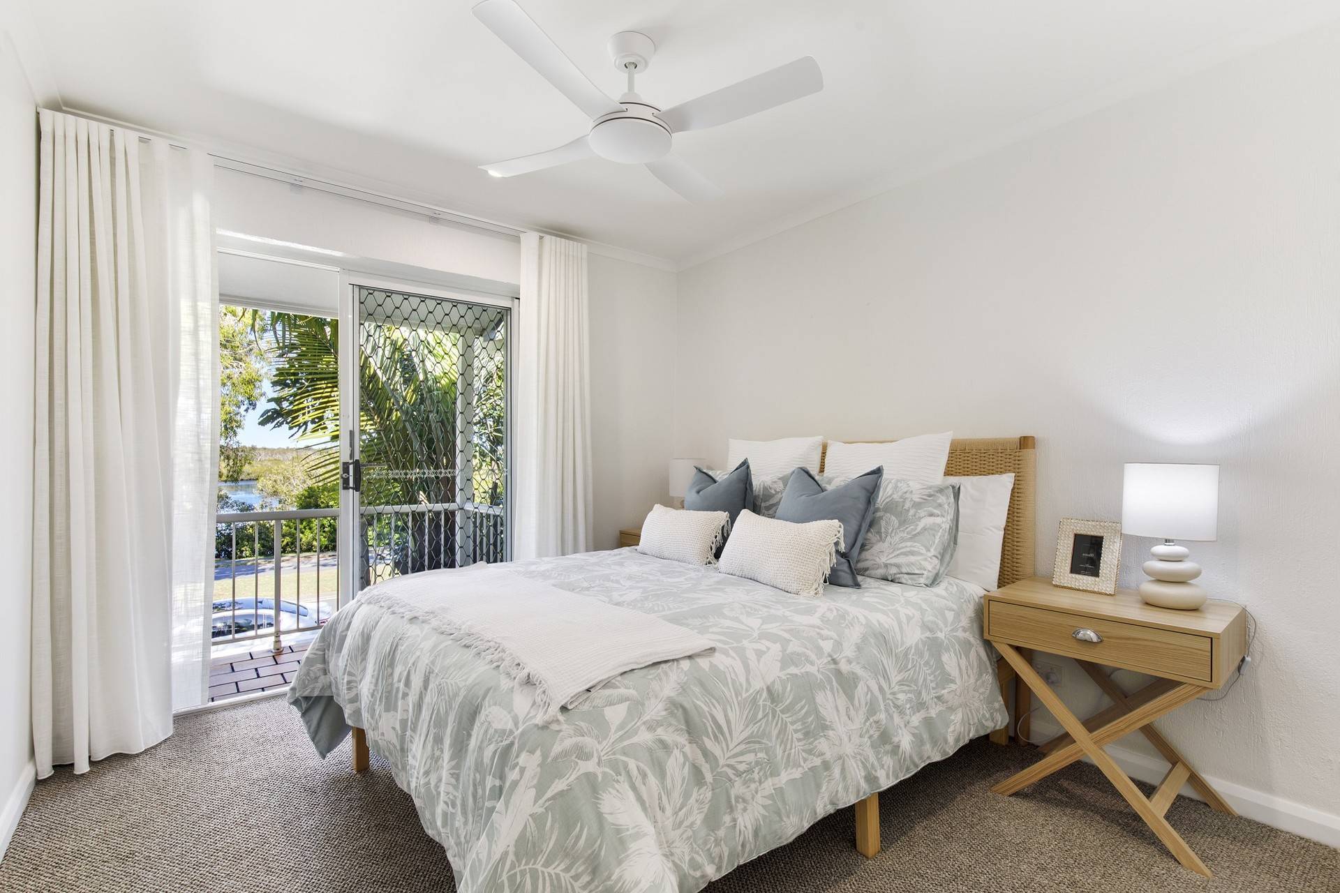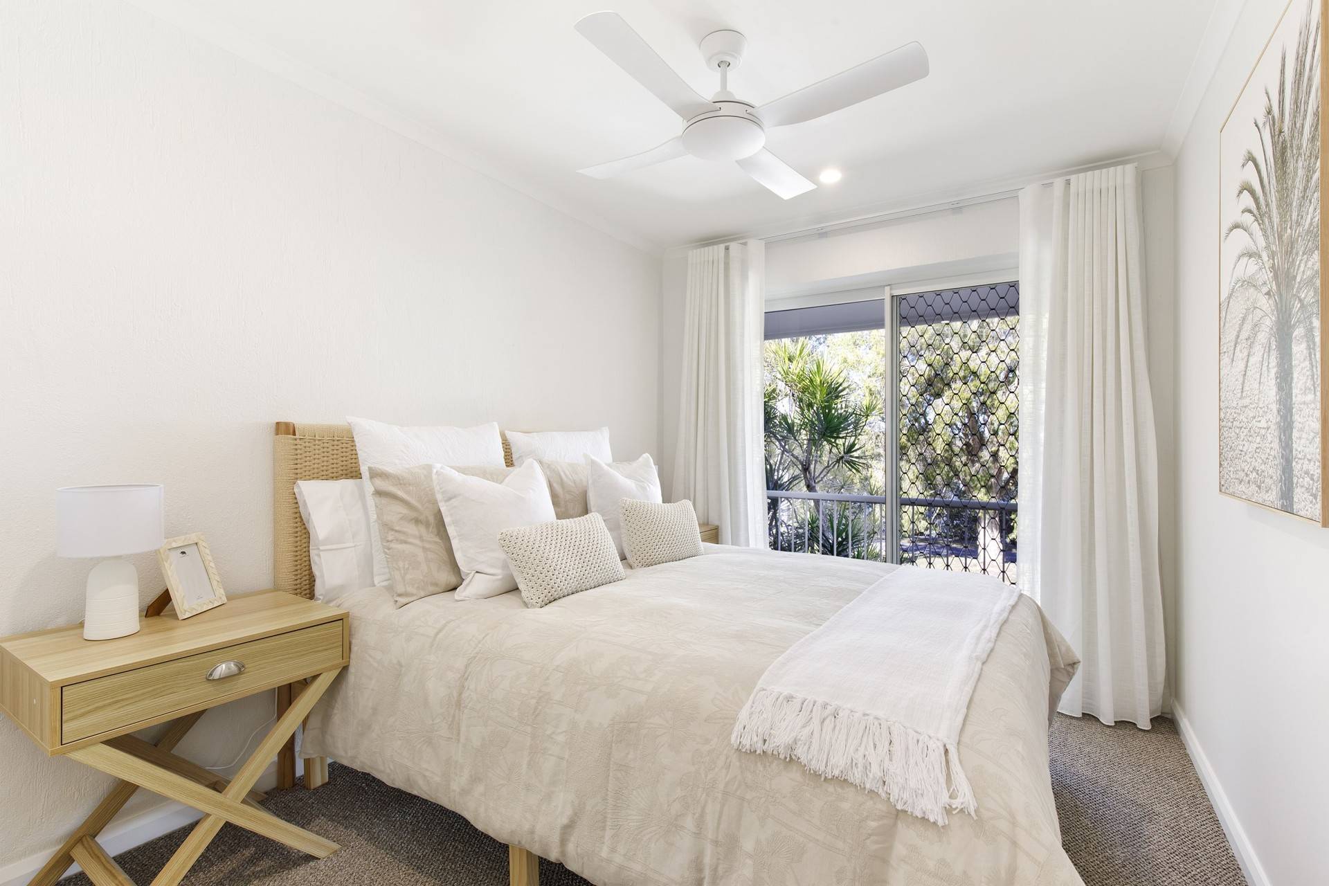Let the good times roll knowing there is nothing like being spoilt for choice, whether a barbeque lunch under the gazebo, catching a few rays on the sun lounges, sharing sundowners with friends or cooling off with a splash in the resort pool. Step inside. It is quiet and the beachy aesthetic melds perfectly with the glam renovation. Wispy sheers float with the breeze, the glass topped dining table has complementary white bucket chairs, there are light timber accents and sumptuous neutral sofas with green palm inspired soft furnishings. Every element combines to create a sunny state of mind with function and flair, while the clever & spacious open-plan design is calibrated to climate and the great outdoors–the everyday-is-a-holiday contemporary lifestyle. Extending from the dining space is a terrace overlooking the Weyba Creek Conservation Reserve. The internal staircase takes you to the bonus loft space which is currently used as a 3rd bedroom but could be used as a study or activity area for the kids. The central hub is a naturally bright in-vogue kitchen with stone bench tops/breakfast bar, 2-pac cabinetry, and the very latest, high end appliances for those with a serious penchant for entertaining, or just creating a casual dinner party. The carpeted bedrooms also have a coastal designer feel that is bright and fresh.