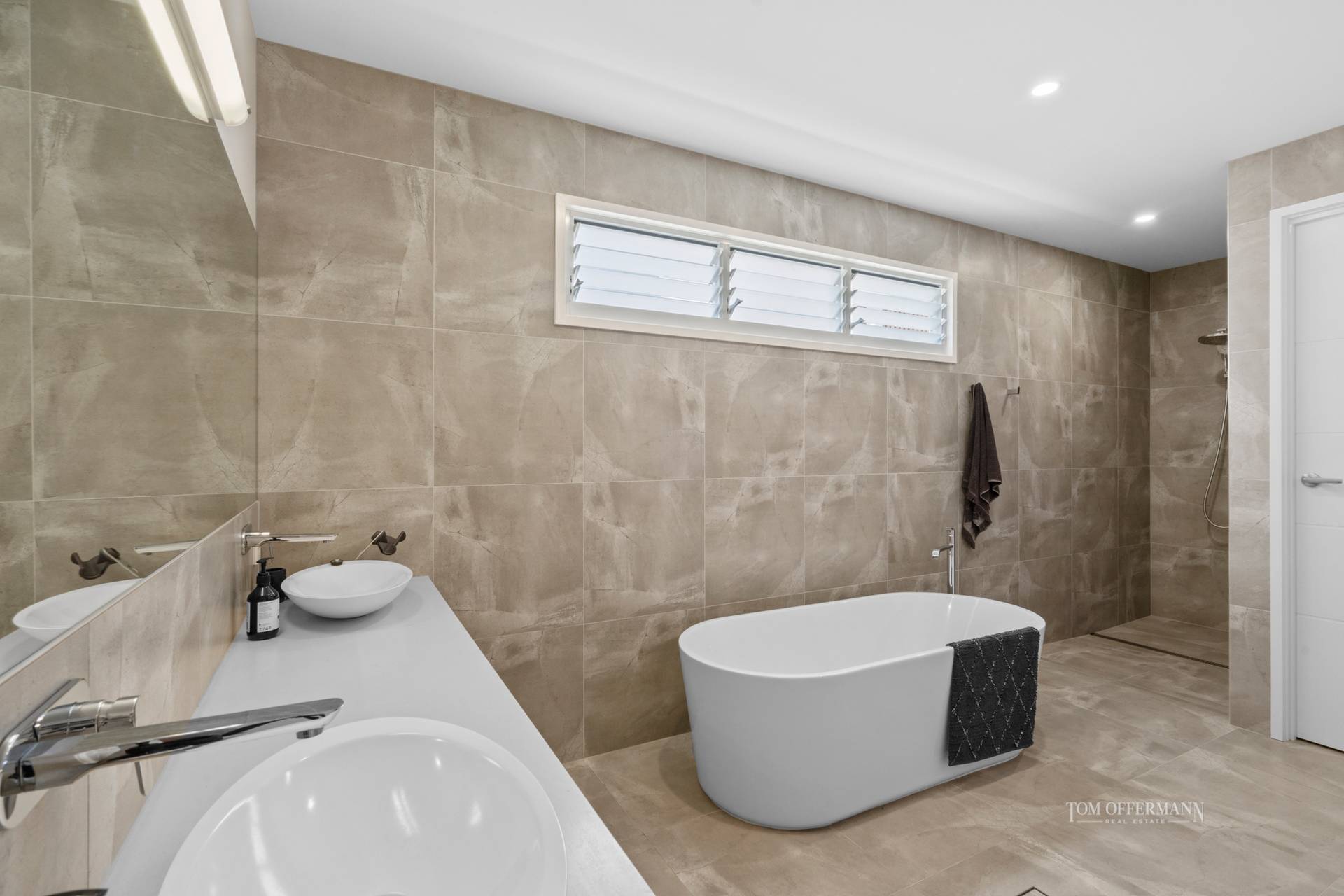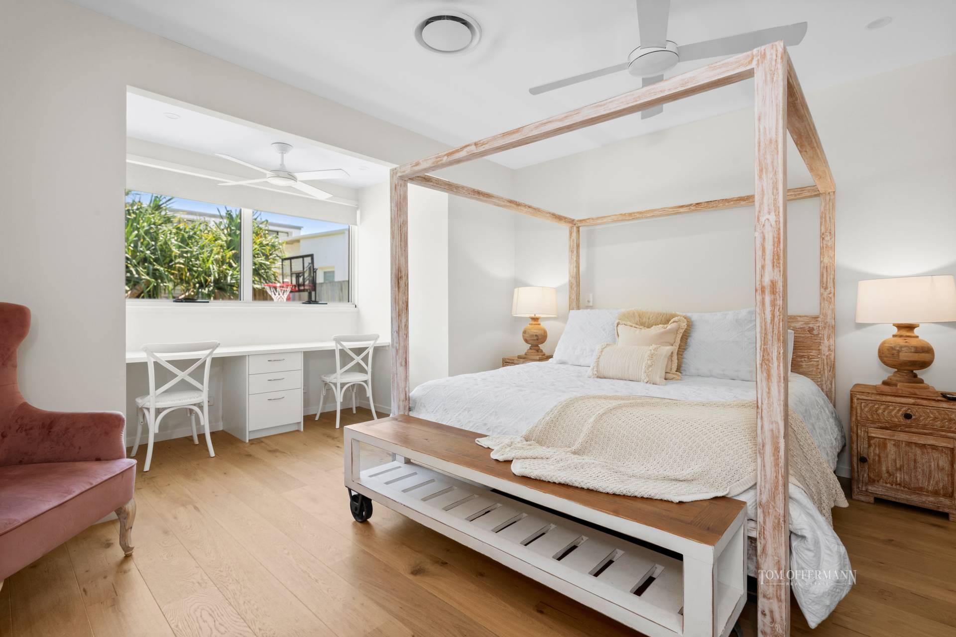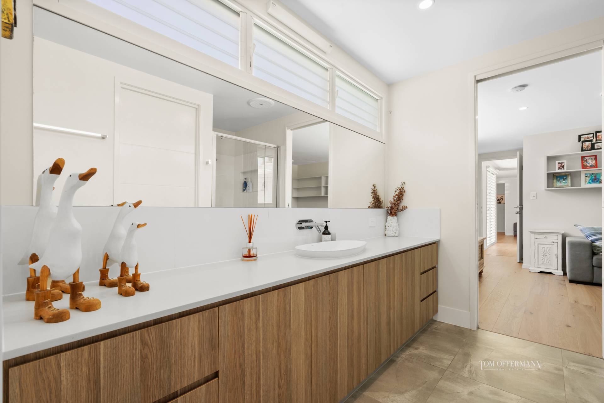 In the south wing it's a four-bedroom teens, tweens and guests retreat to envy. Two queen bedrooms with desk, robes, leisure area with modular lounge and television, share a bathroom. A lockable third queen bedroom with ensuite and walk-in robe has a carpeted lounge area shared by a king bedroom. It is kitted out with a built-in robe, ensuite and opens to the pool.