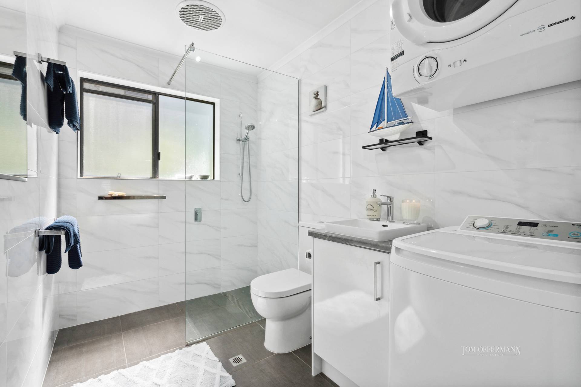 The on-trend L-shaped kitchen has a pastel grey granite-topped island with lip on two sides with four comfy stools for a breakfast/meals area. Cabinetry has soft close drawers, muted grey tiled splash back, all the whizz-bang appliances are there, plus every accoutrement needed to create a culinary masterpiece.