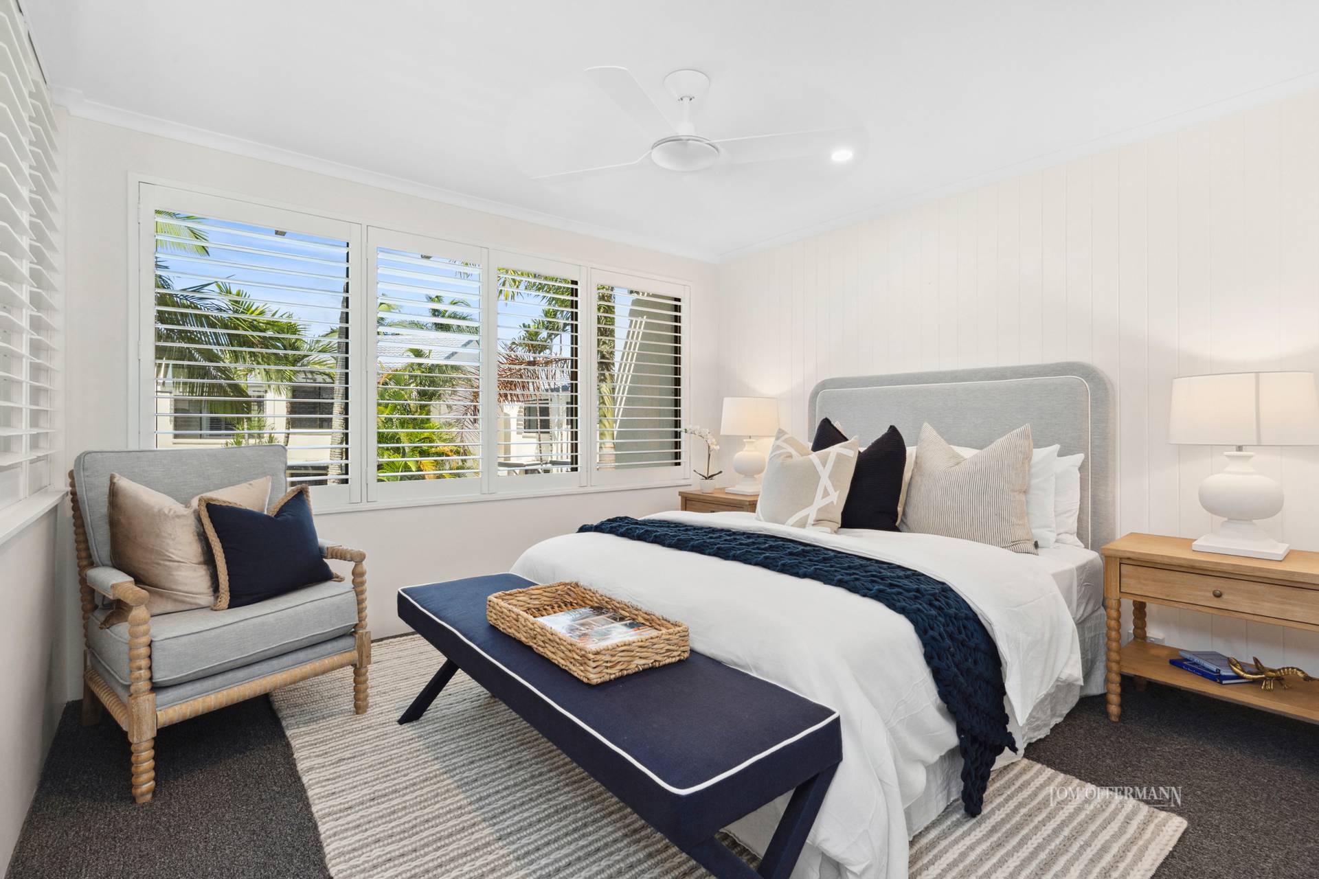 Complementing the location in the Noosa Place II Resort is the knockout contemporary apartment with its fresh new Hamptons-inspired interiors. Admire the monochromatic aesthetic of dove grey, mid blue and white, generous open plan living with white beams, main wall with sensational grey fan-palm wallpaper, all the plantation shutters and the lime-washed timber-look flooring.