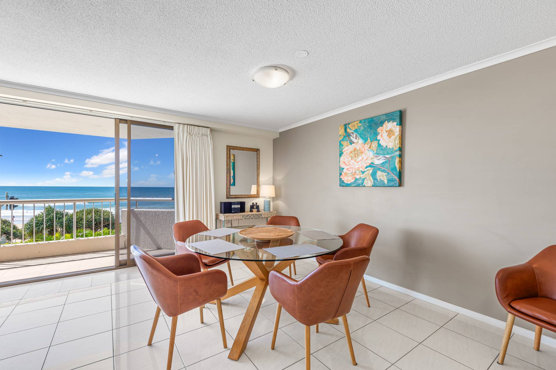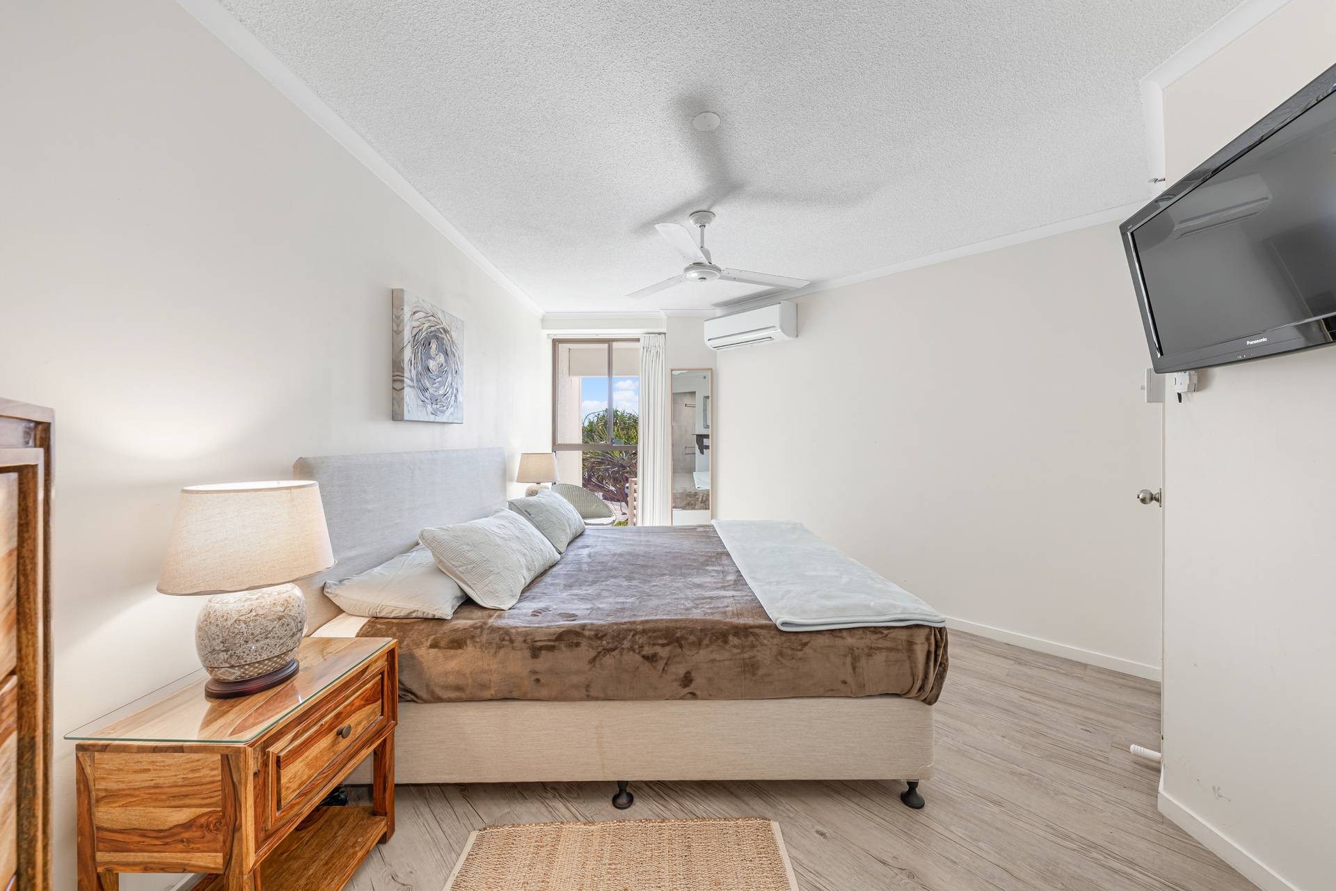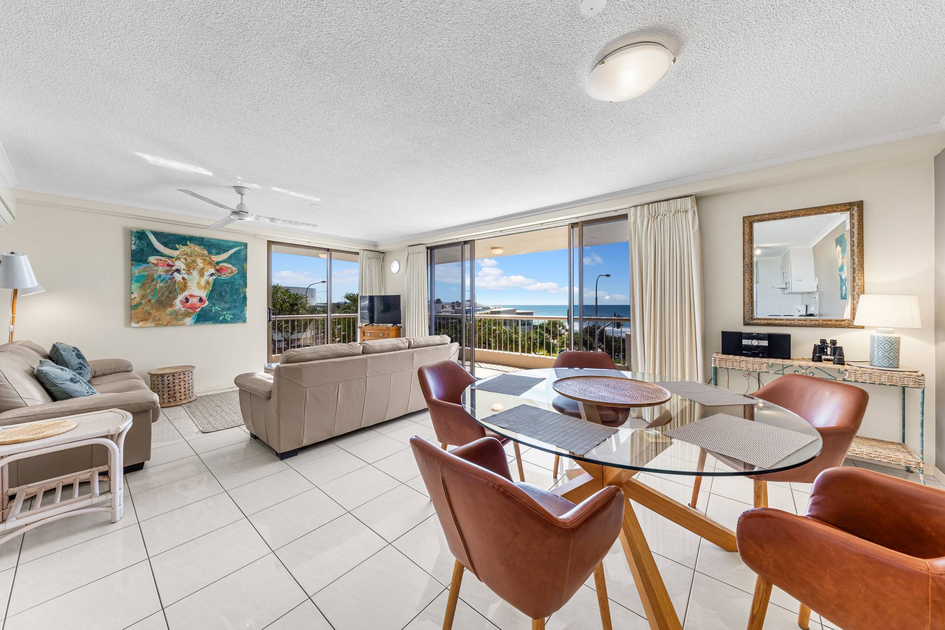 The apartment's layout is cleverly designed so that whether you're in the kitchen, dining area, living room, or even the hallway, you can enjoy the sight of the sparkling blue waters of Coolum's patrolled beach.