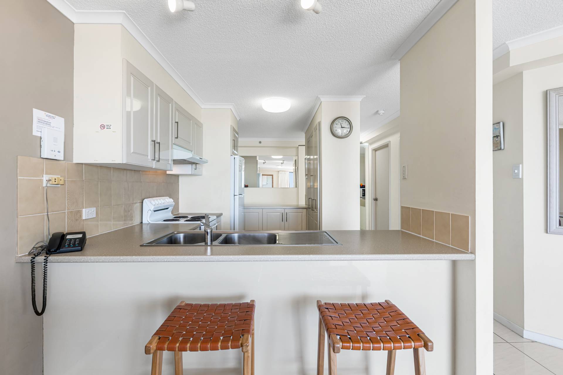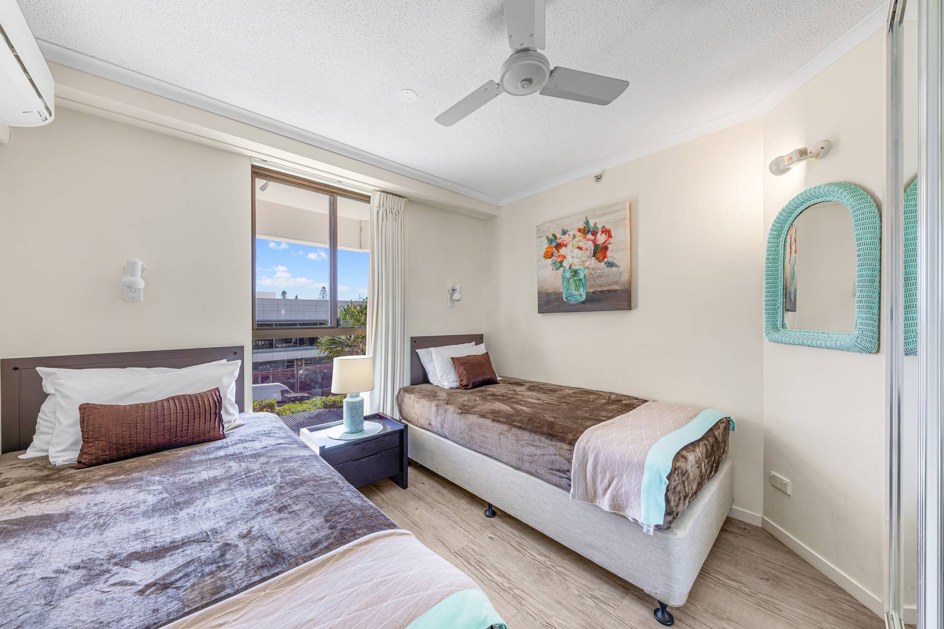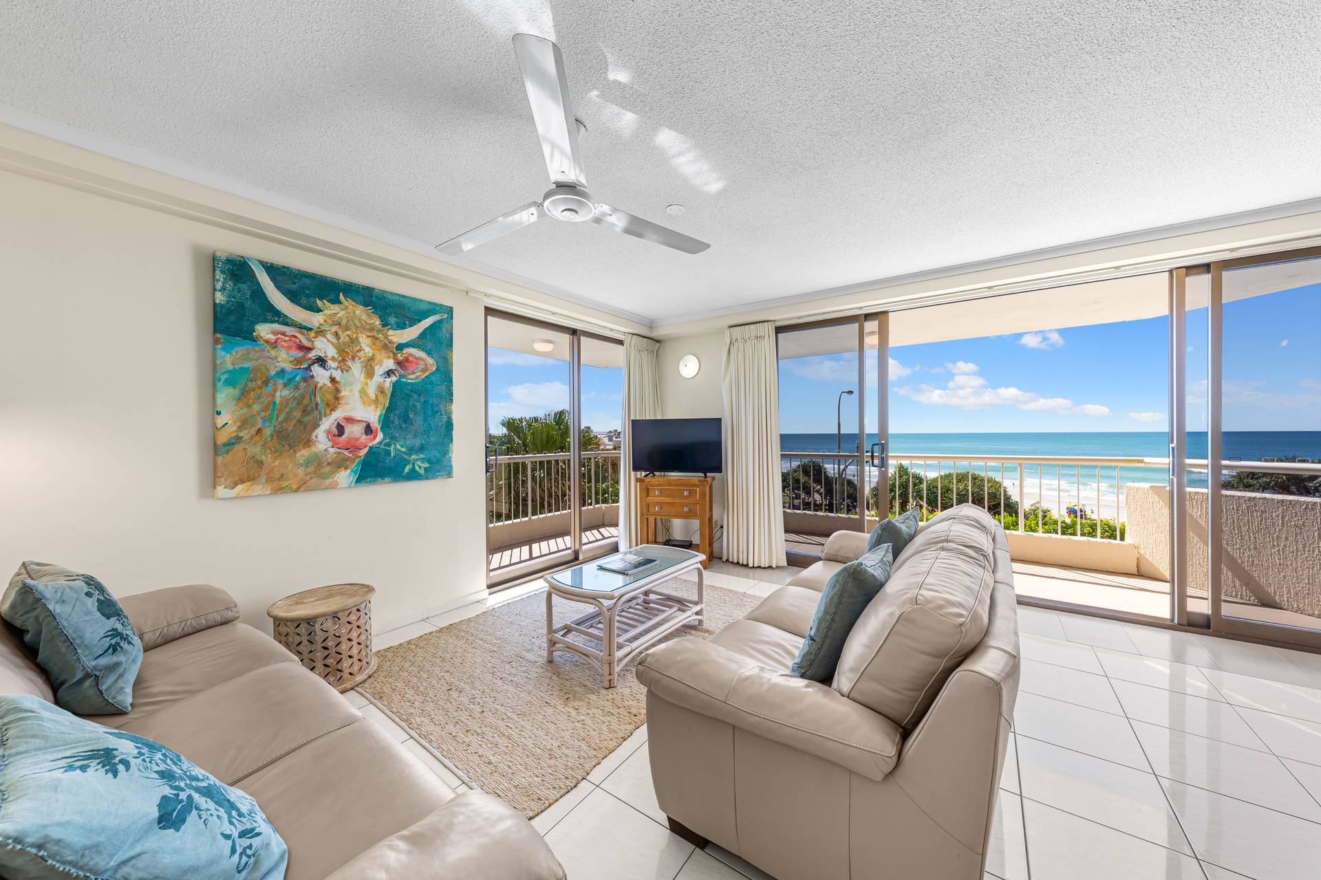 The apartment's layout is cleverly designed so that whether you're in the kitchen, dining area, living room, or even the hallway, you can enjoy the sight of the sparkling blue waters of Coolum's patrolled beach.