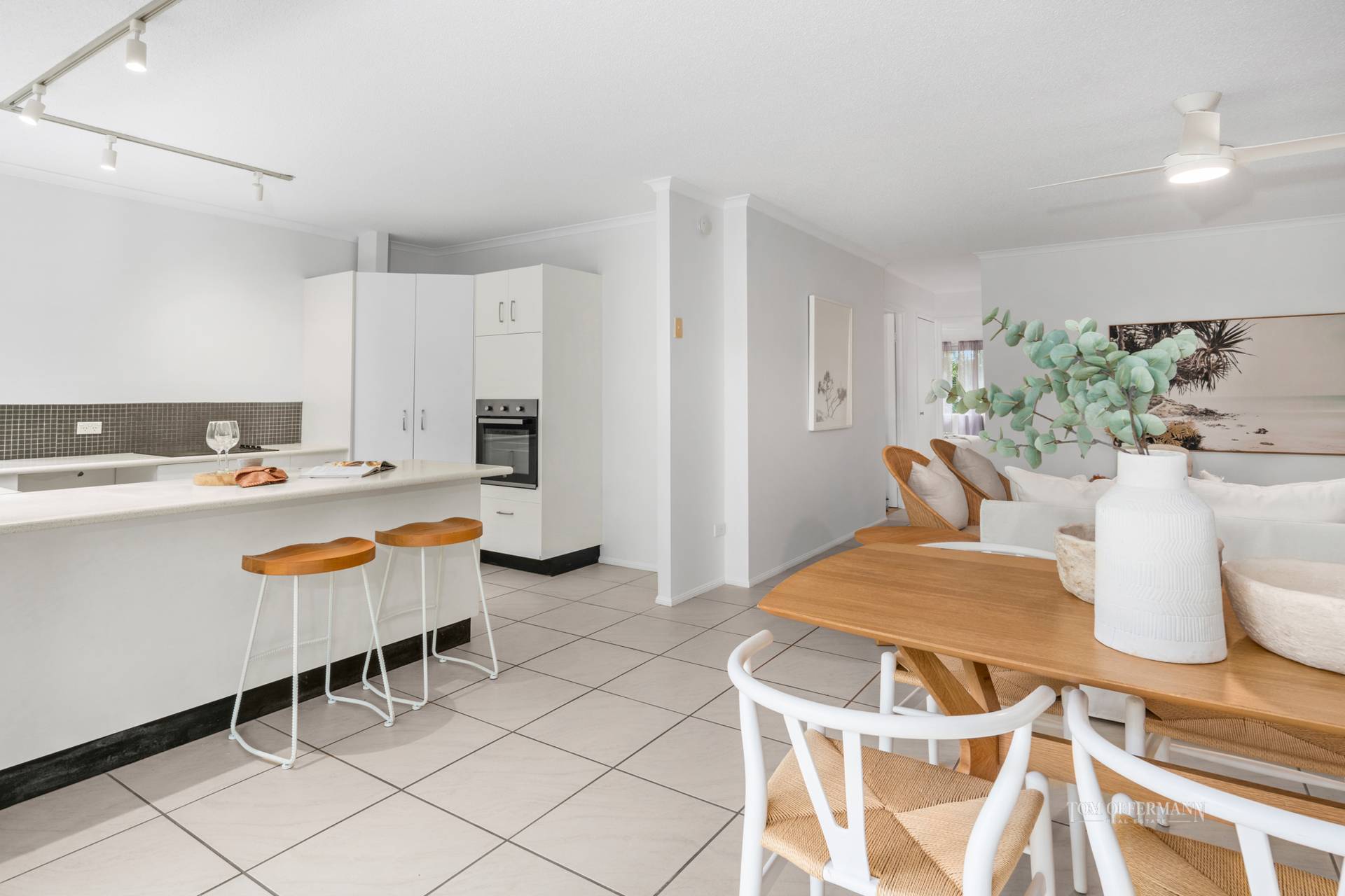 Inside there's a big sunny welcome as natural light from the north-east bounces across the pastel sandy tiles throughout the bright white and generous open plan living and dining space. Slide away the doors for a seamless connectivity to the north-east facing undercover terrace, which has a verdant outlook and adds considerably to entertainment options. It ensures the good life is pleasurable from sunset to sundown … or let's face it, whenever you like, even after a laze on the sun deck and swim in the resident's-only pool, more a private oasis amongst the trees.