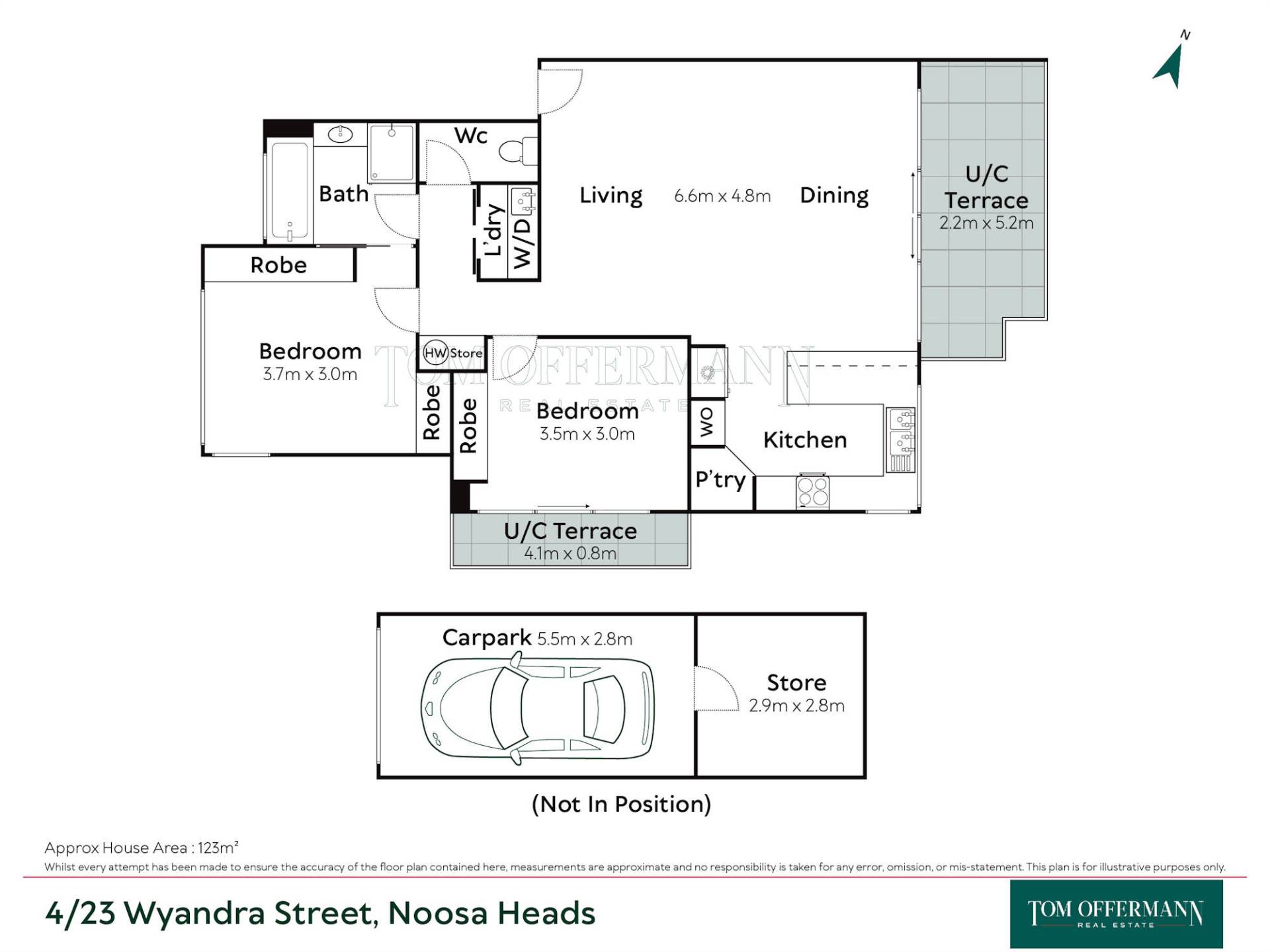 The two carpeted bedrooms have wispy sheers, built-in robes and the one on the southside has an undercover terrace. The bathroom with natural hued tiles has white cabinetry and a bathtub. A separate toilet is next door, and a fully equipped laundry adjoins.