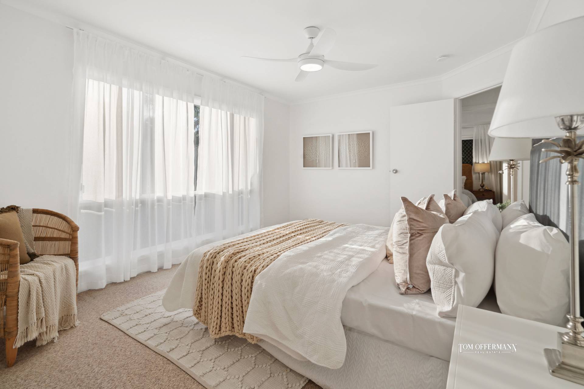 There are four carpeted bedrooms. The premier suite with wispy sheers is on the top floor, opens to the terrace with those captivating views, has a walk-in robe, also an ensuite and separate toilet. Three bedrooms with share bathroom and separate powder room are on the ground floor. Two have access to the northerly terrace.