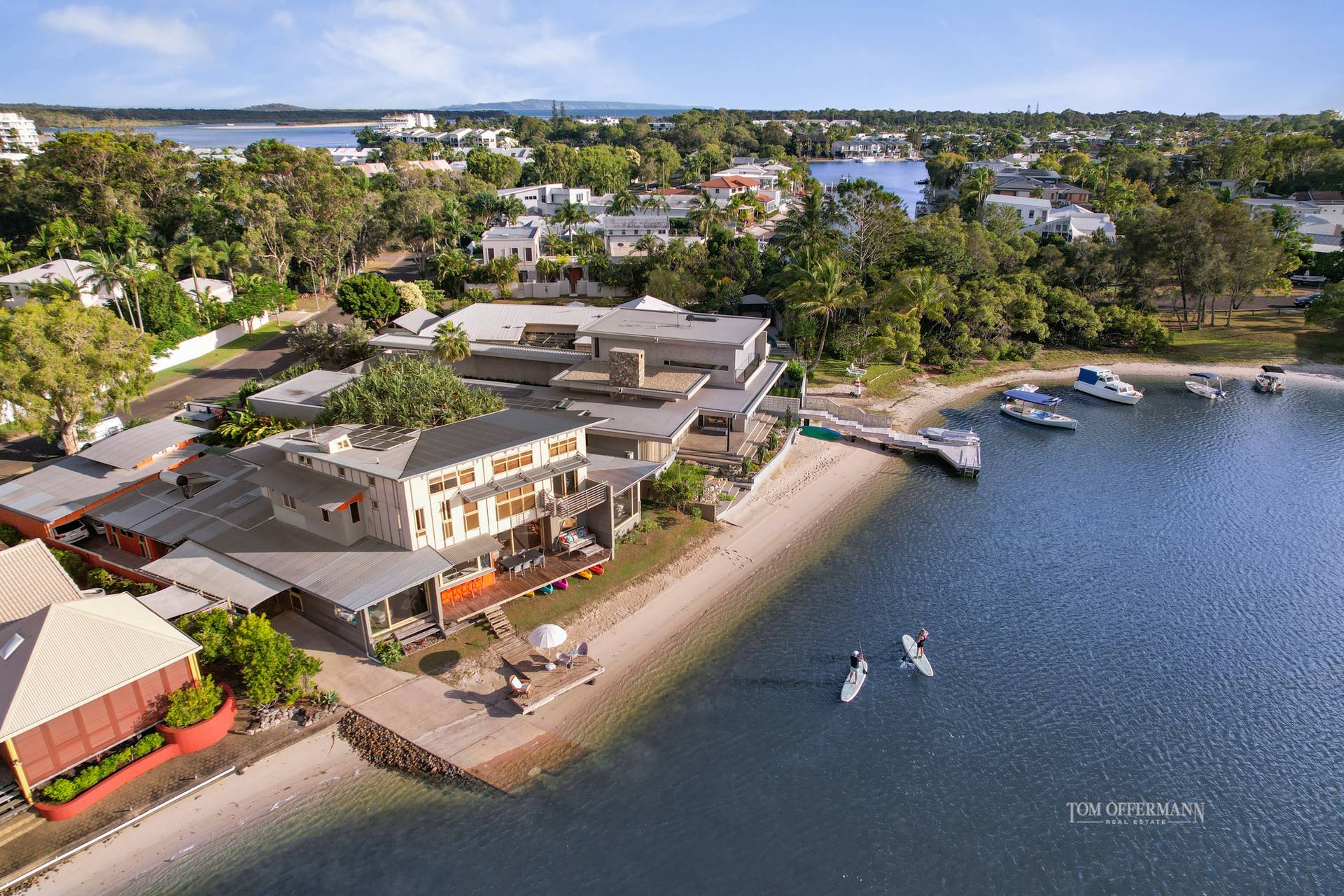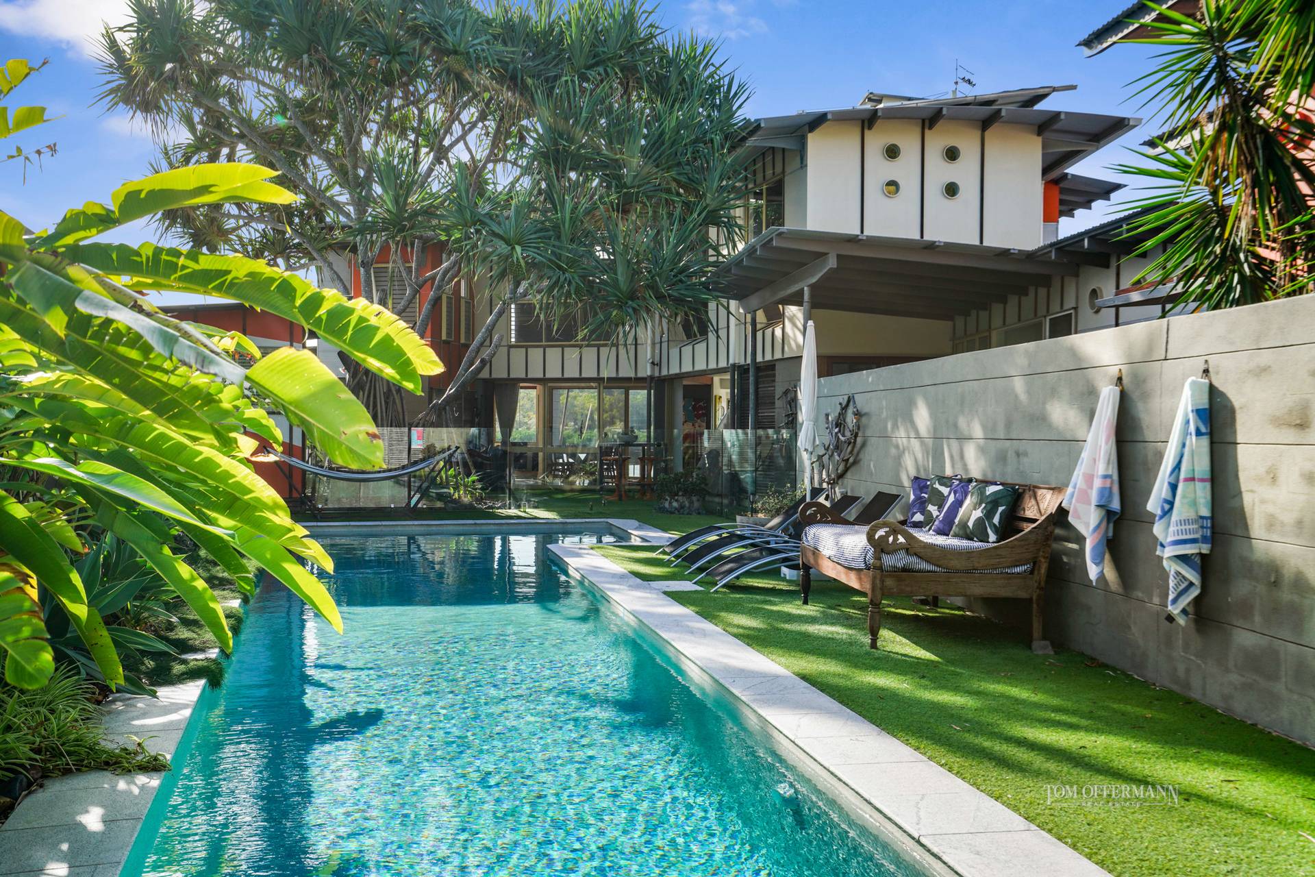 A northerly sun-drenched pool is set within a tropical courtyard, perfect for relaxation and entertaining. A sandy beach along your water frontage invites you to launch a paddleboard or kayak, or simply enjoy a day of fishing.