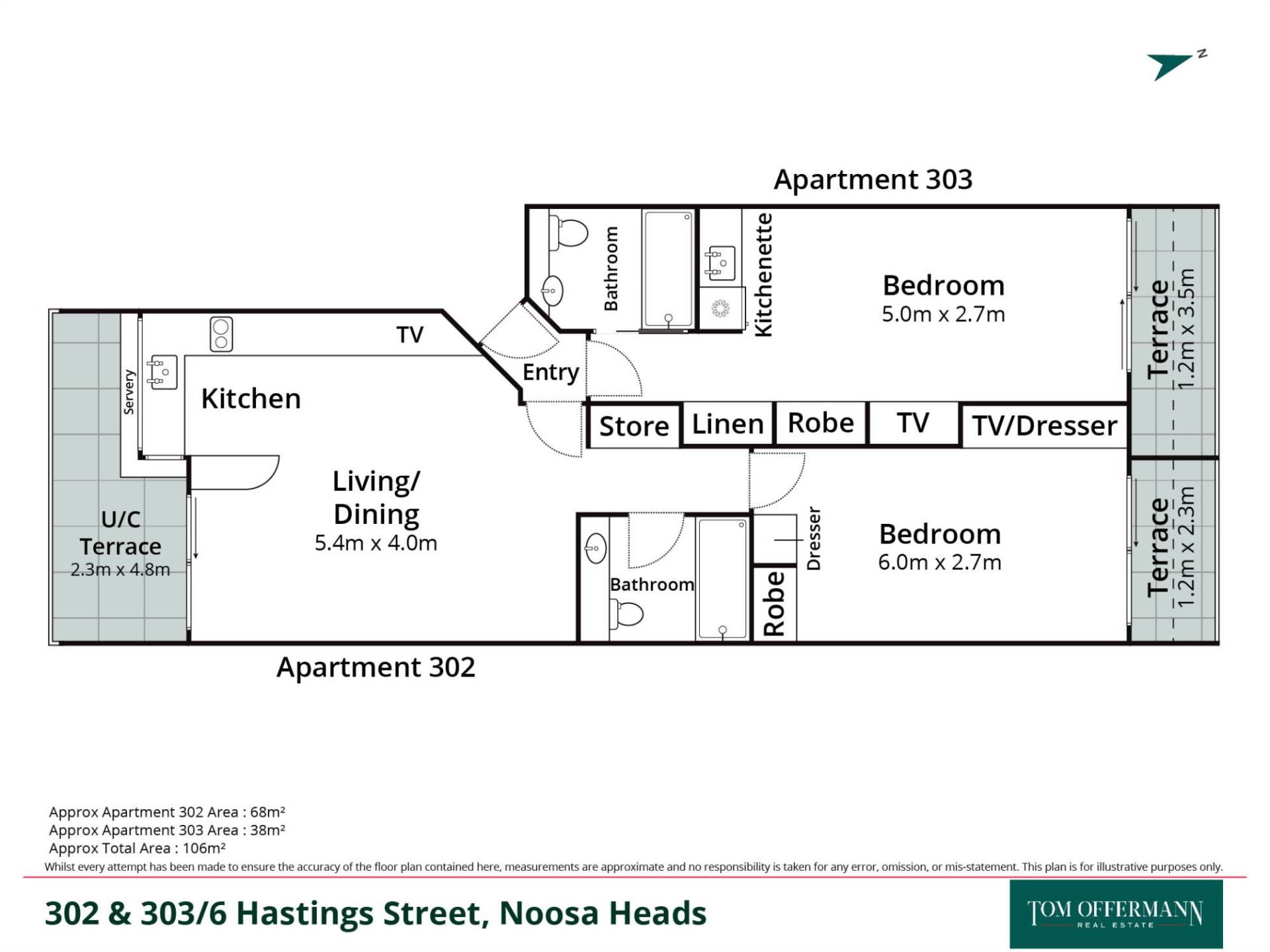 The spacious one-bedroom apartment 202 comprises over-sized bedroom, large kitchen, lounge, and dining area, plus bathroom and two balconies. The adjacent larger than average studio apartment 303 includes a large bedroom with king bed, kitchenette, ensuite and balcony. An entirely separate front entrance can be closed off allowing for additional privacy and the versatility of opening both apartments into an over-sized two-bedroom apartment.