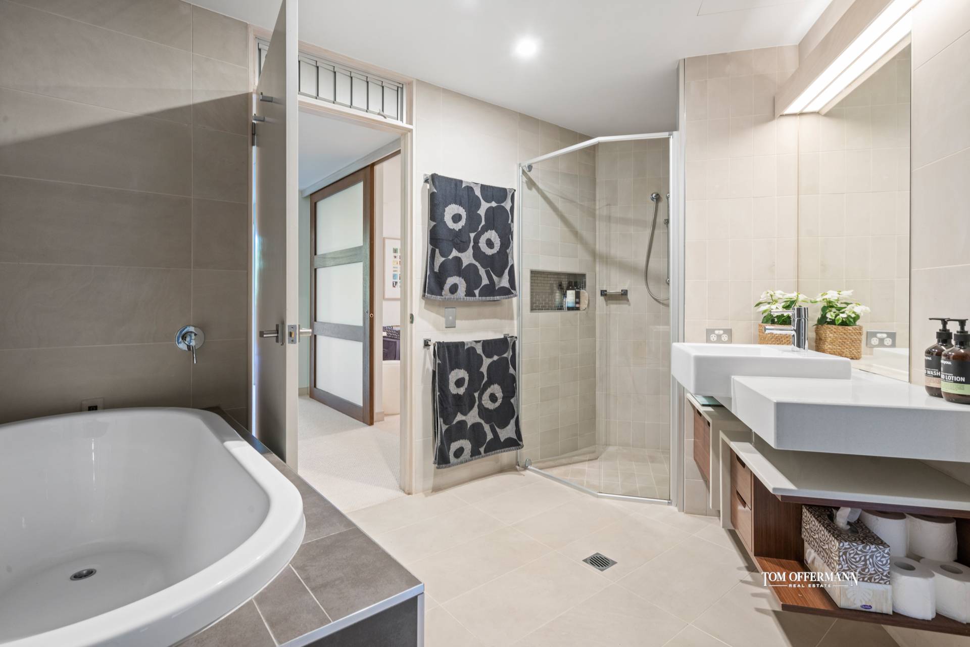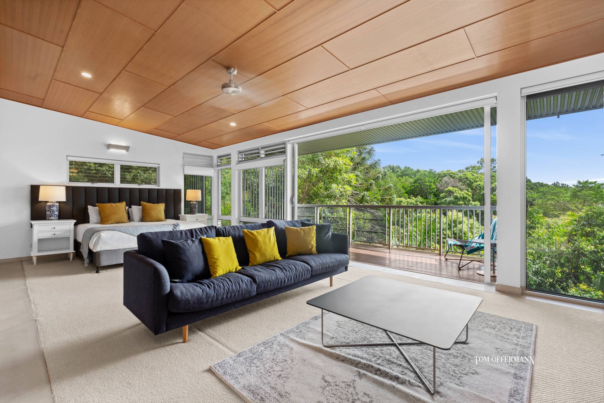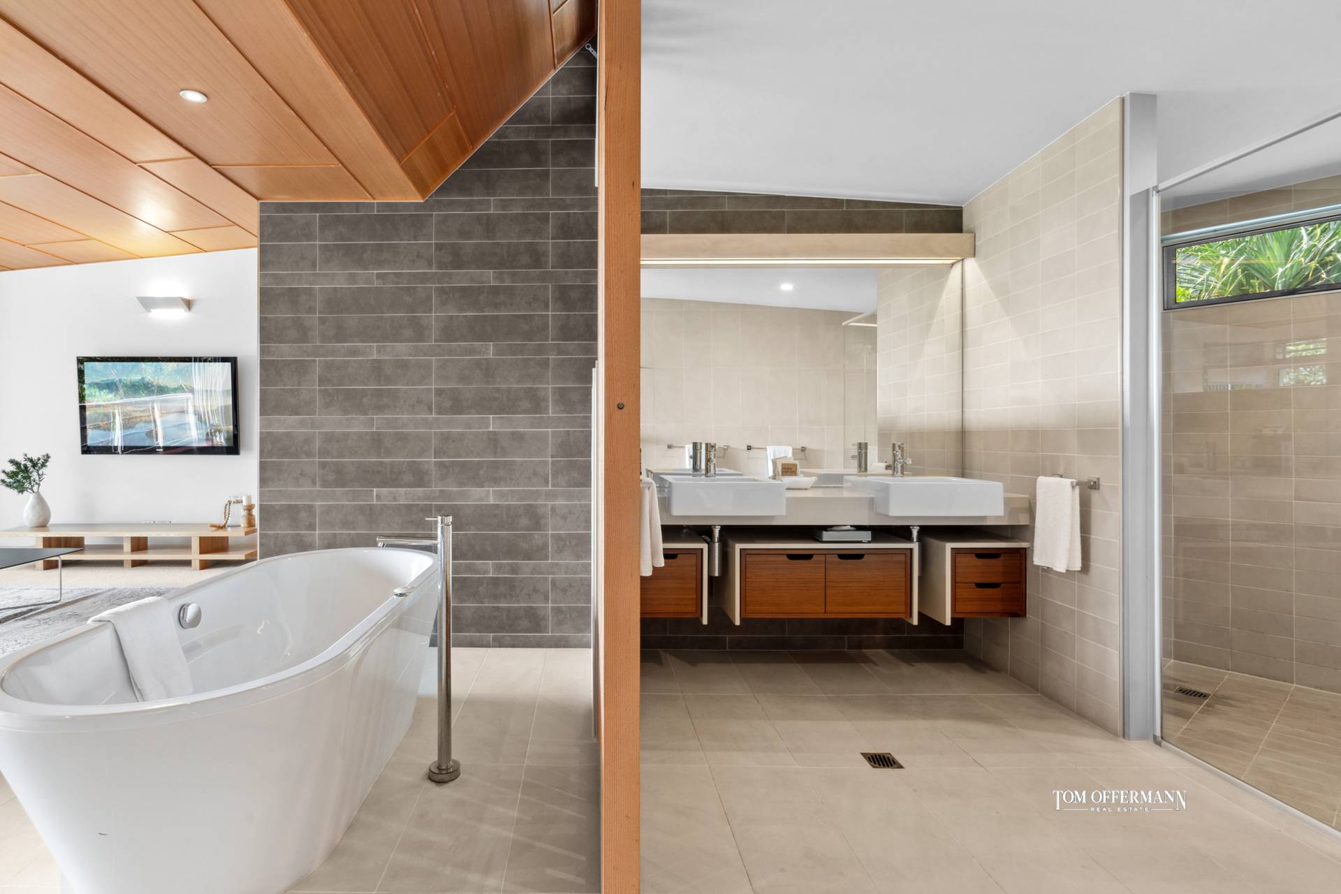 Upstairs open the double doors and expect an awe-inspiring moment. The premier grand bedroom with a lounge area, more like a retreat, spills out to the undercover terrace. Drink in views to the Noosa North Shore, the Coloured Sands and beyond as you soak away in the free-standing oval bathtub. There's a separate ensuite with two-basin stone-topped cabinetry, plus a walk-in robe.