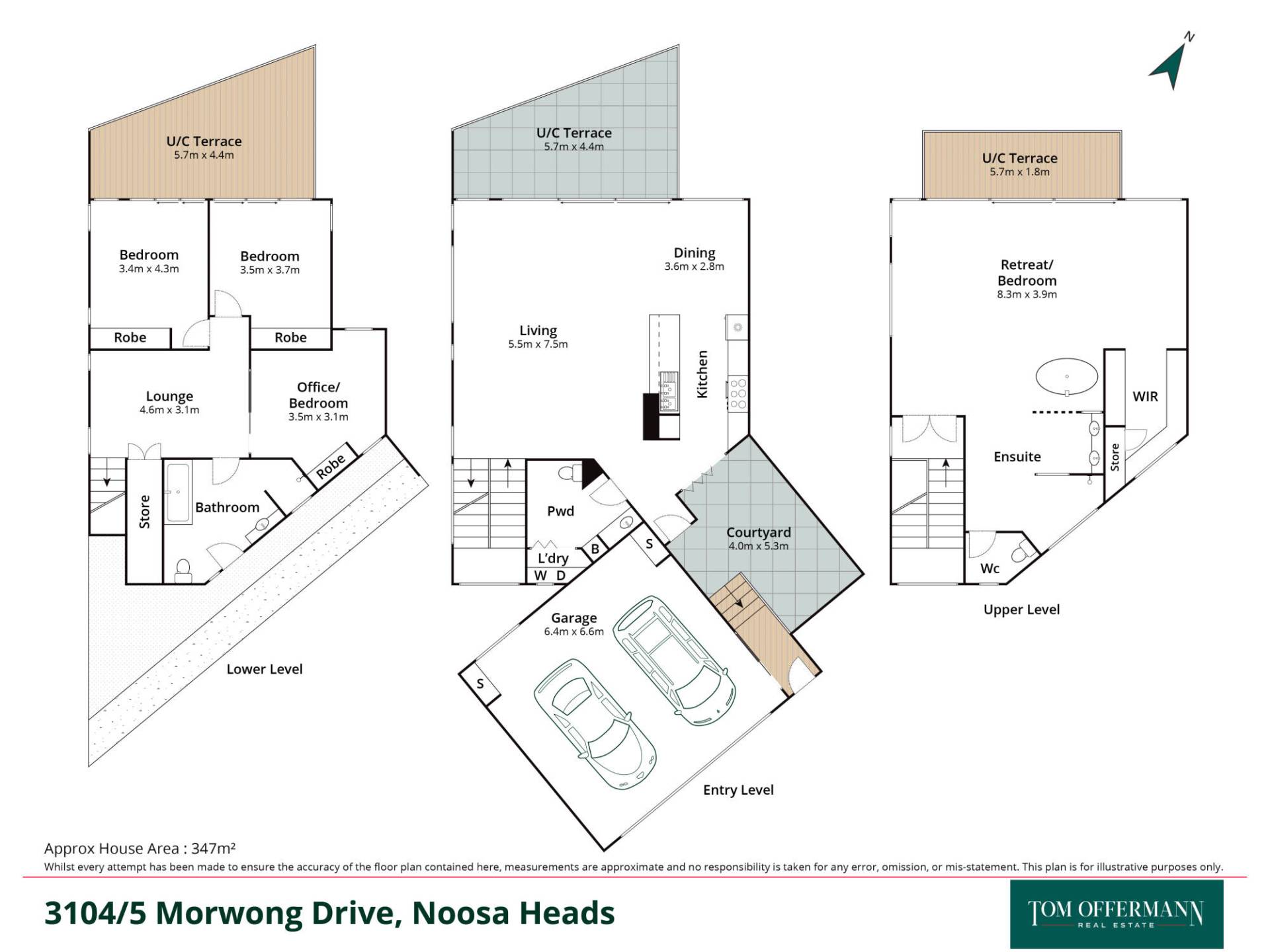 • Terraces & Courtyard: entry level 5.7mx4.4m undercover terrace + 4mx5.3m courtyard; upper level 5.7mx1.8m undercover terrace; lower level 5.7mx4.4m undercover terrace; outdoor leisure lounges, chairs; tables & stools/chairs