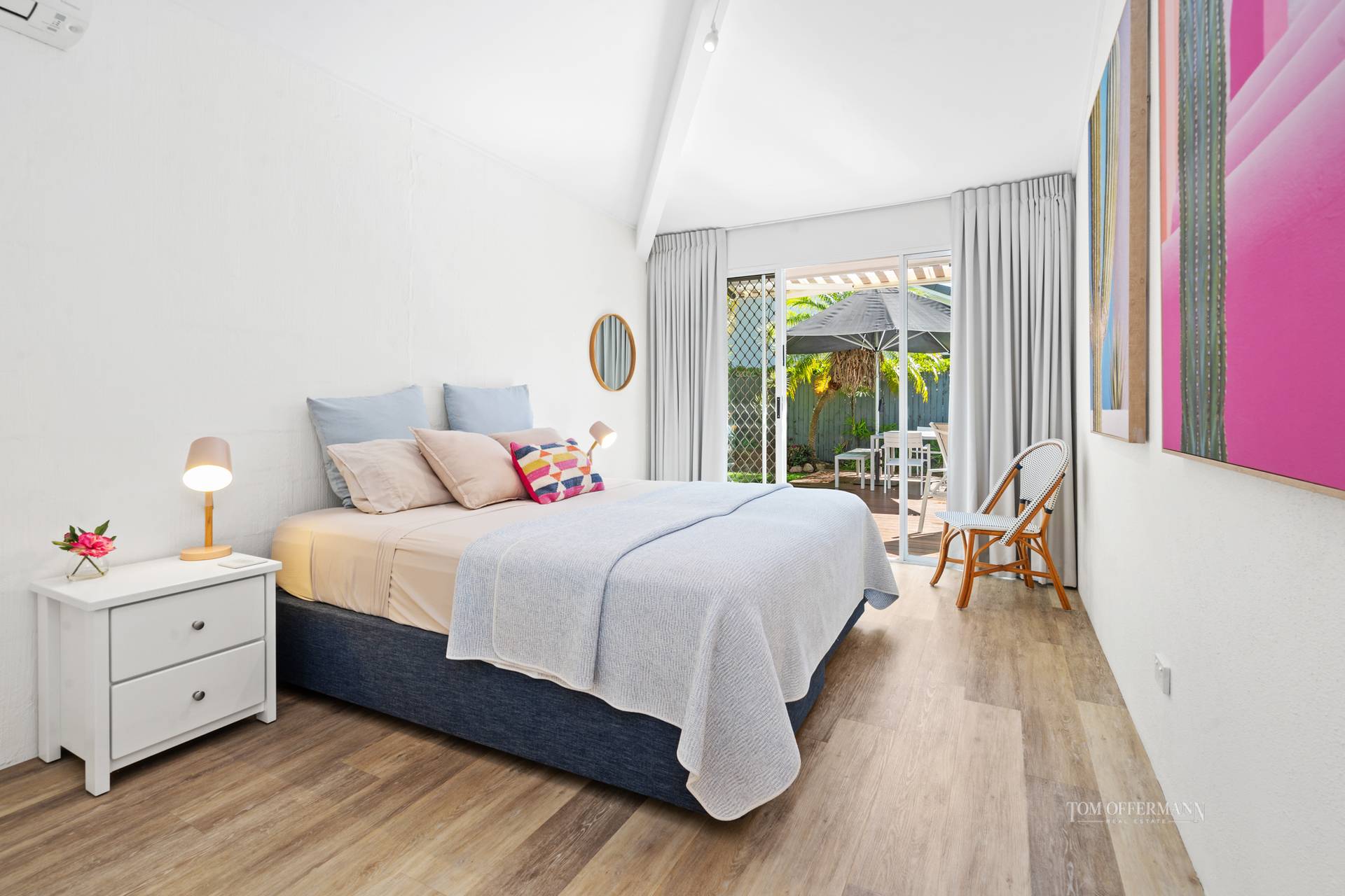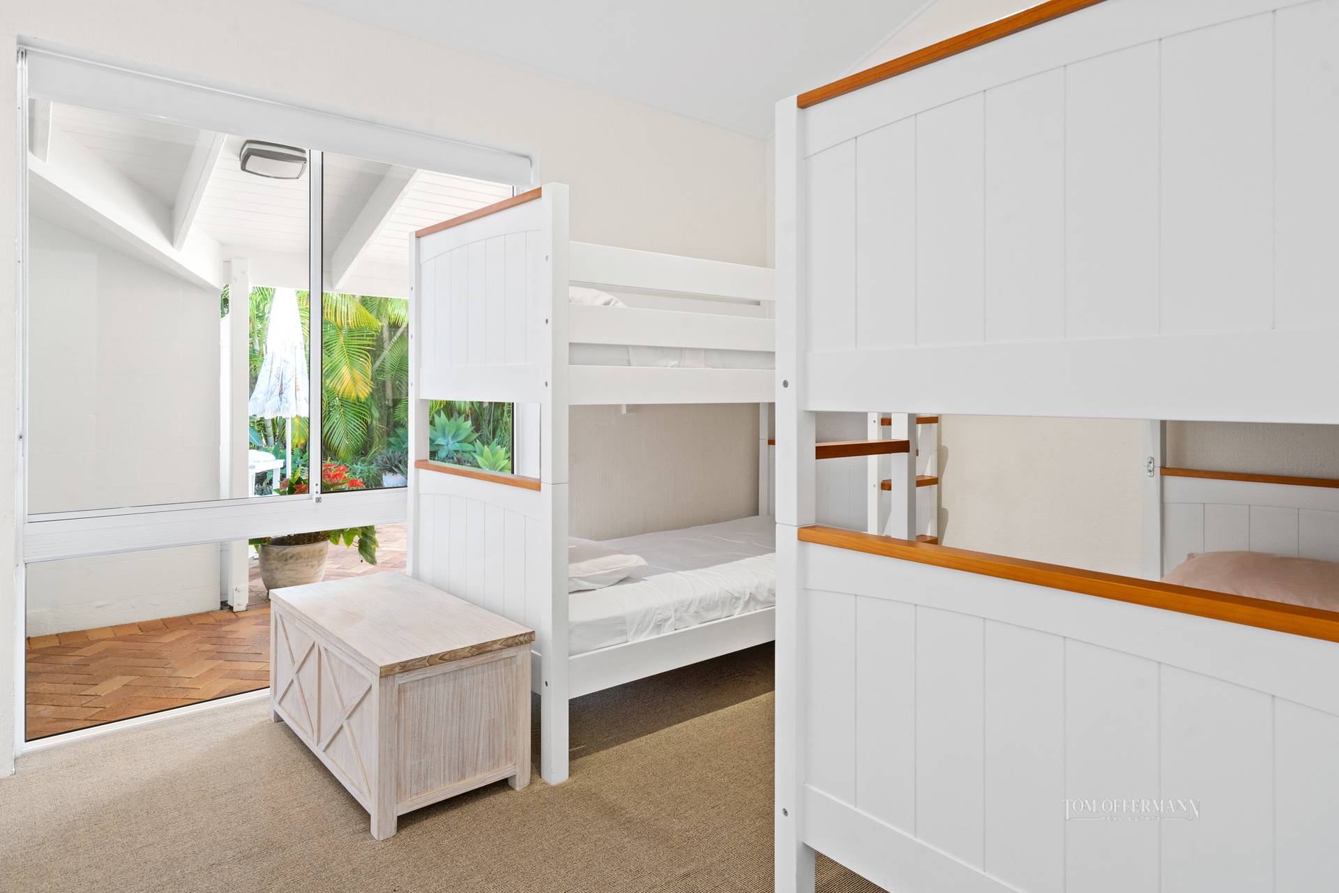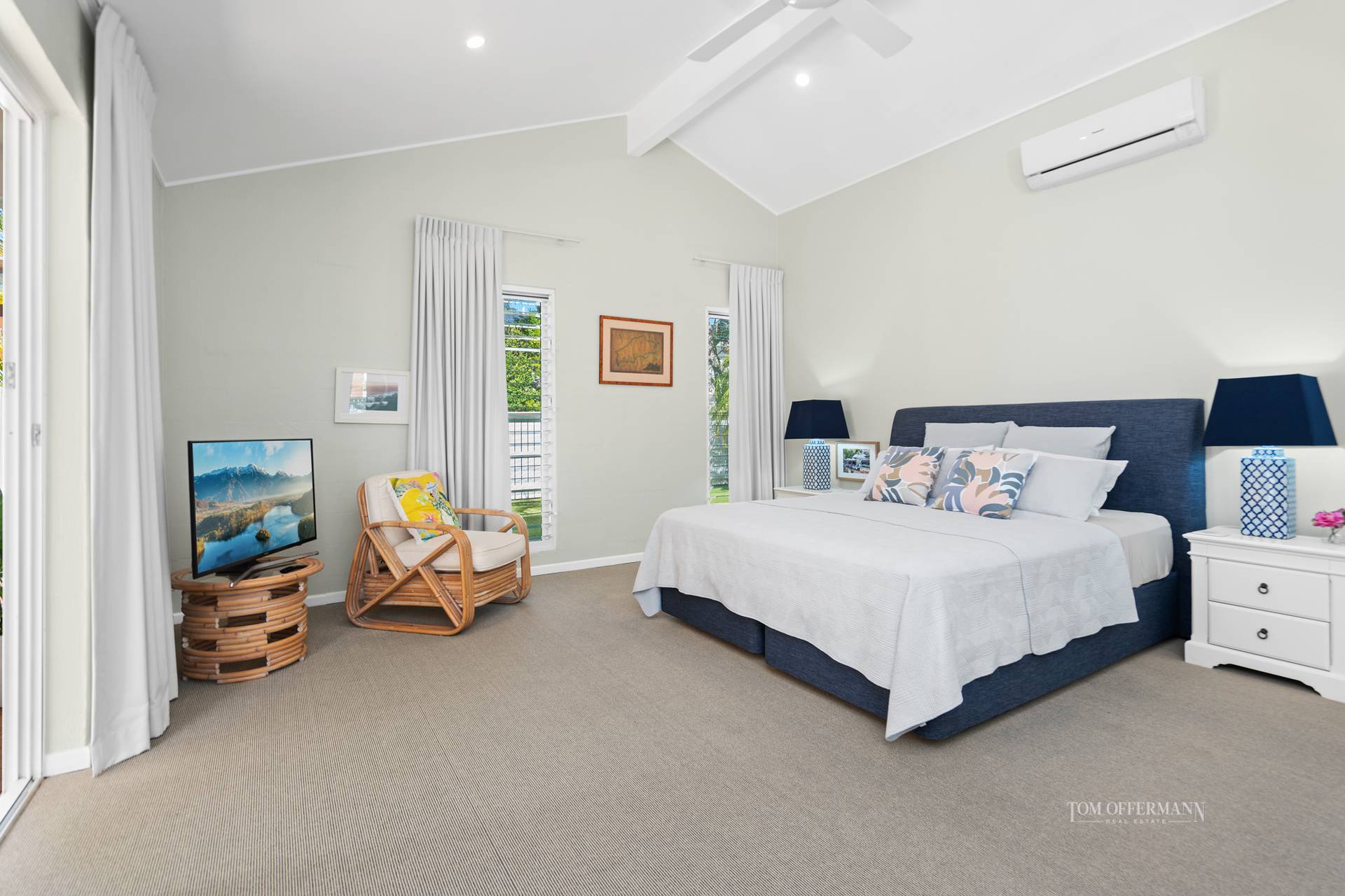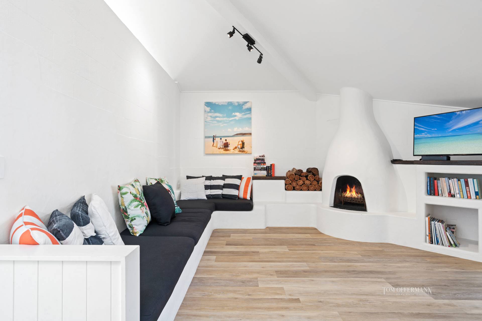• About: named Pineapple House; super high vaulted ceilings; washed oak-toned flooring; VJ- profile wall features & louvres throughout; seaside/creative pieces/artworks incl Slim Aarons; fans/aircon; Crimsafe on windows; 2-car w storage; front w white picket fence, pineapple cutouts & covered walkway to sundrenched courtyard w Adirondack chairs; white front entry door w glass side panels; living w linen covered sofas; art, artifacts & colourful accessories; timber & rattan console table/bar; opens to terrace & pool; dining extends to half hexagonal space w glass & exterior grey & white blinds/awnings; massive timber table, pendant light & 8 rattan/timber chairs; casual lounge w Peter 'Sandbag' Davies custom built wood burning fireplace & seating; big comfy chairs; Smart TV; large VJ barn door to west wing 3-bedrooms w block-out window treatments; premier king suite retreat w WIR, ensuite w natural-hued tiles & white basin & stone-topped 2-pac white cabinetry access to courtyard; 2nd king size w BIR & access to terrace & pool; 3rd carpeted w 2x single bed = king bed & BIR; charcoal-tiled bathroom w glass brick wall tiles & white basin-topped timber cabinetry; adjacent laundry w Fisher & Paykel washer & Hoover dryer + charcoal-topped white 2-pac cabinetry
