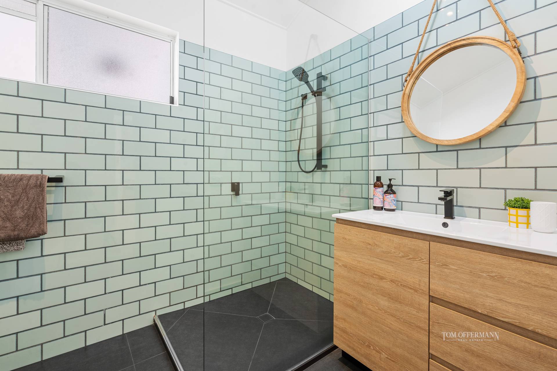 Slide away the large barn door to the west wing's three bedrooms, varying vaulted ceiling heights and block-out window treatments. The premier king suite retreat opens to the courtyard, has a walk-in robe an ensuite with natural-hued tiles and white basin/stone-topped cabinetry. The second king size has access to terrace and pool plus built-in robes, and the third carpeted bedroom has a king bed (two single) and a built-in robe. The charcoal-tiled bathroom with glass brick wall tiles and white basin-topped timber cabinetry, is adjacent to the well-kitted out laundry.