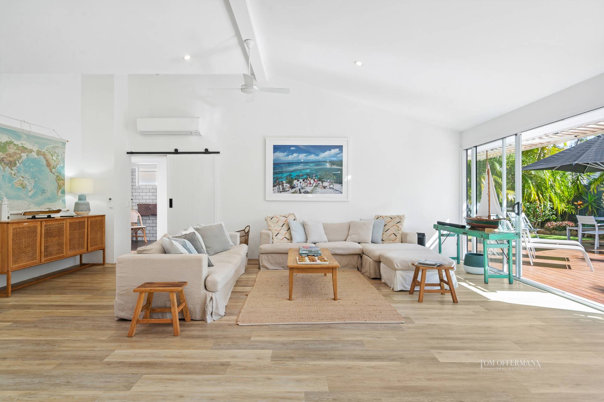Note the open plan living space with sink-into linen covered sofas, timber and rattan console table and doors opening to the totally private north-facing terrace, and luminescent pool fringed with greenery.