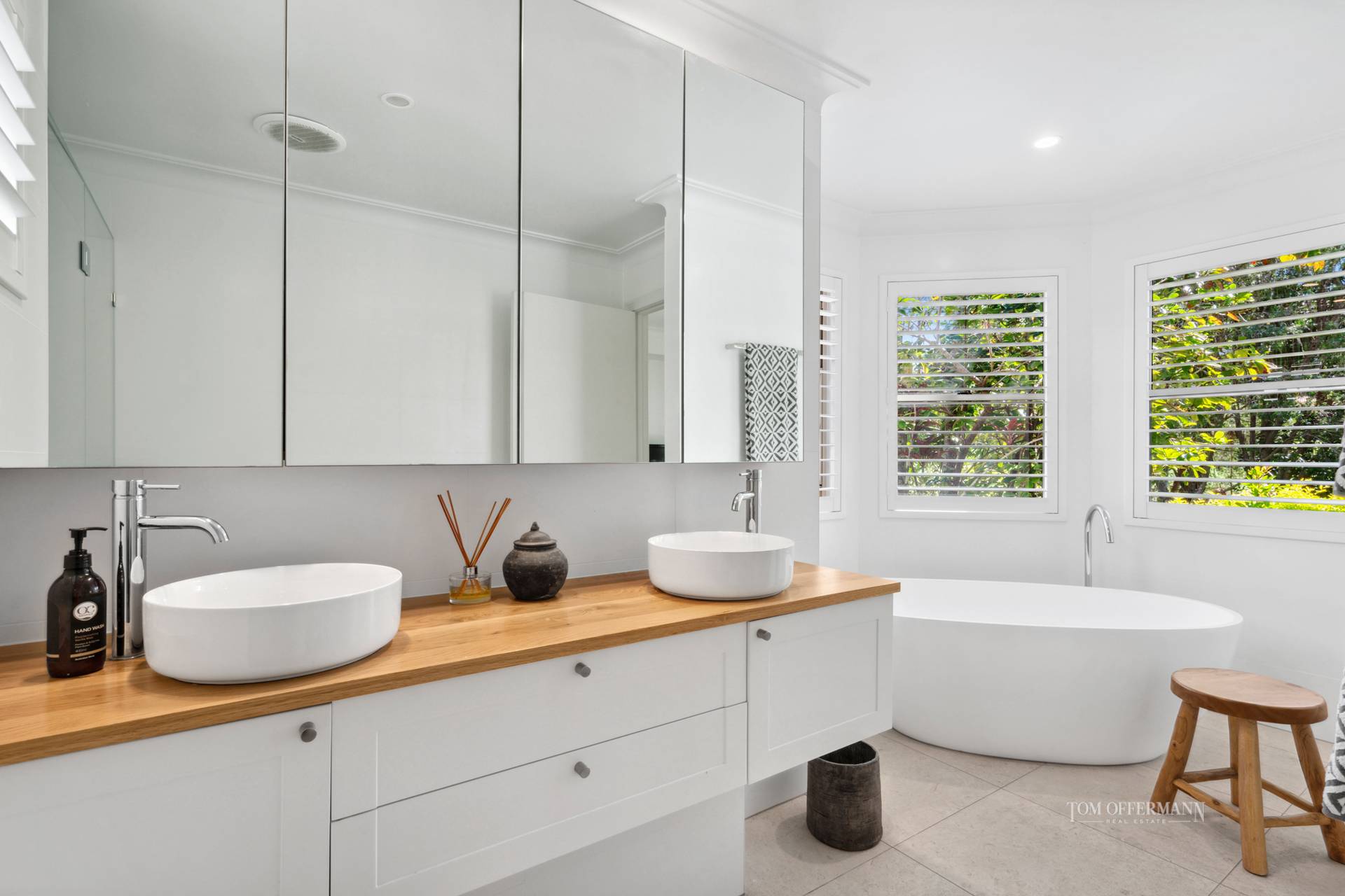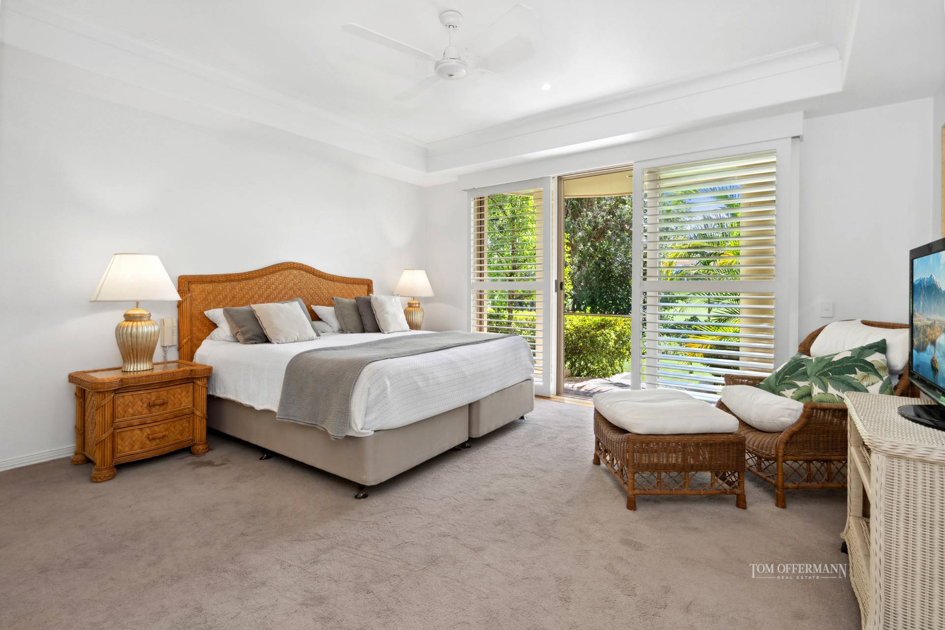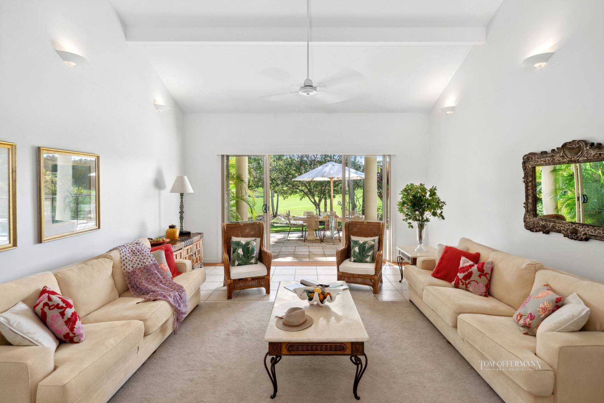 Notice how bright natural light bounces through the vast void to the generous living room with its casual sink-into sofas, the more formal lounge, even stretching to the dining room. Naturally with the idyllic northerly aspect, and doors that seemingly disappear, the living rooms have immediate connectivity to expansive undercover and alfresco terraces with large terracotta pots, manicured expanse of lawn and shimmering turquoise pool. Add a larger-than-most over 30-metre frontage, water and golf course views including the 15th fairway and beyond. Entertaining options are numerous, always a breeze from long lunches to sundowners whilst watching mesmerising local fauna and birdlife on the course. Incidentally, this fairway is a Par 5, and the longest hole at Noosa Springs.