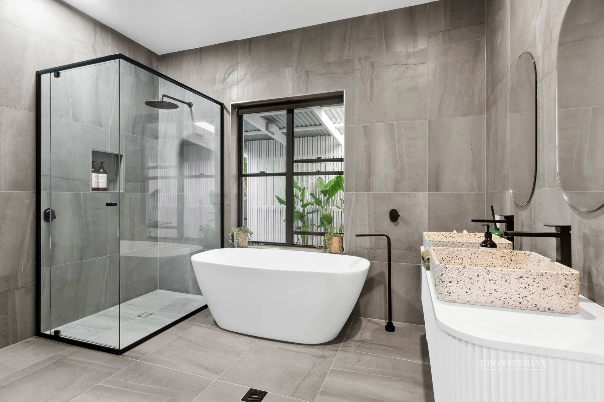 • About: full renovation completed March 2024; monochromatic aesthetic; spotted gum-toned flooring throughout; timber framed glass panelled front door; entry terrace with white fluted timber wall; vaulted ceilings; hall with black fluted timber feature wall; white timber decking terrace; VJ wall; aircon & Big Ass fans; 2 living areas – 1 open plan with dedicated kitchen & dining; 2nd sth side; 4-bedrooms with BIRs; all bathrooms with mushroom-toned tiles & 2-basin stone-topped fluted cabinetry; northside main with open ensuite & wall of unique tiles in brick pattern; 3-bedrooms share bathroom with free standing bath