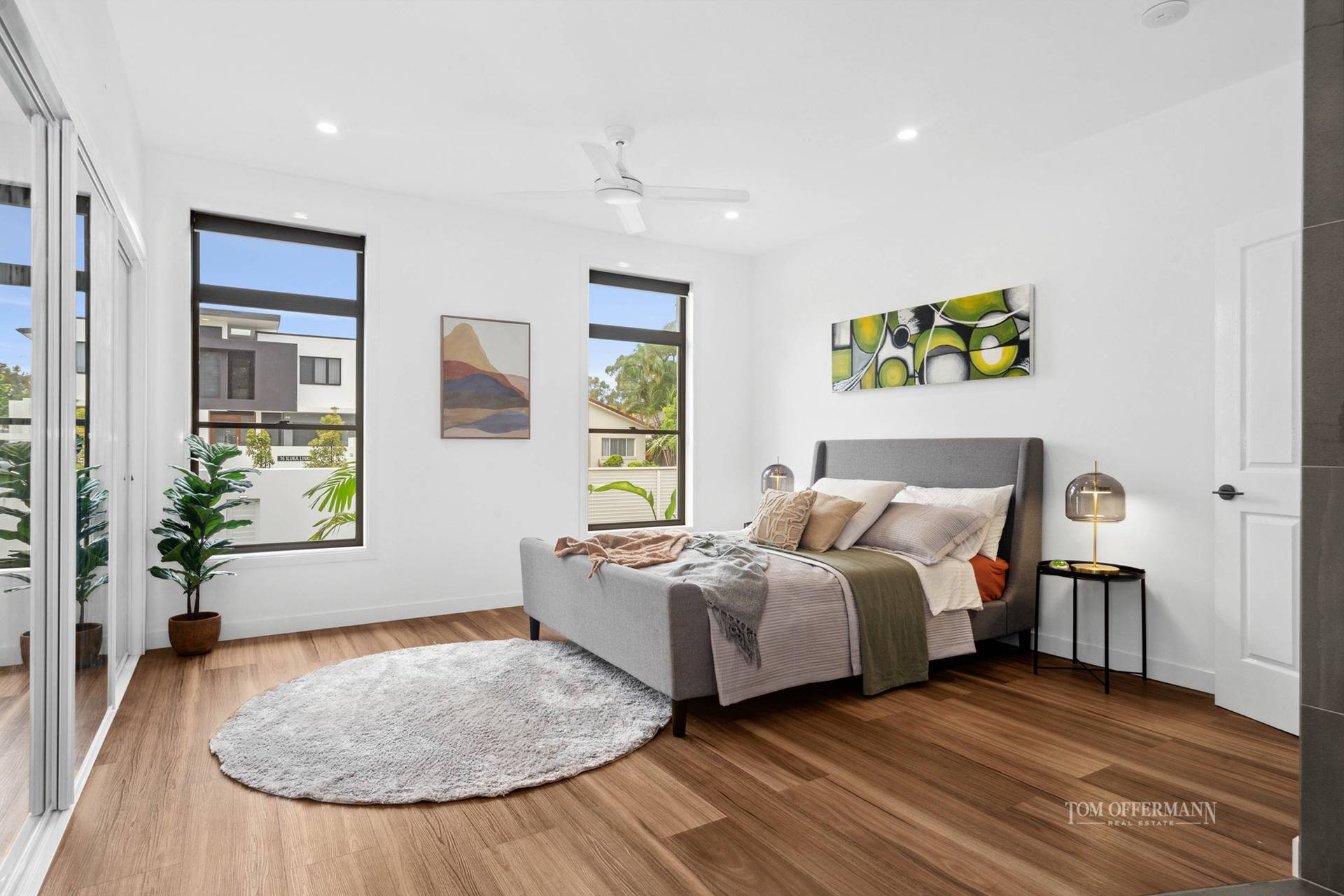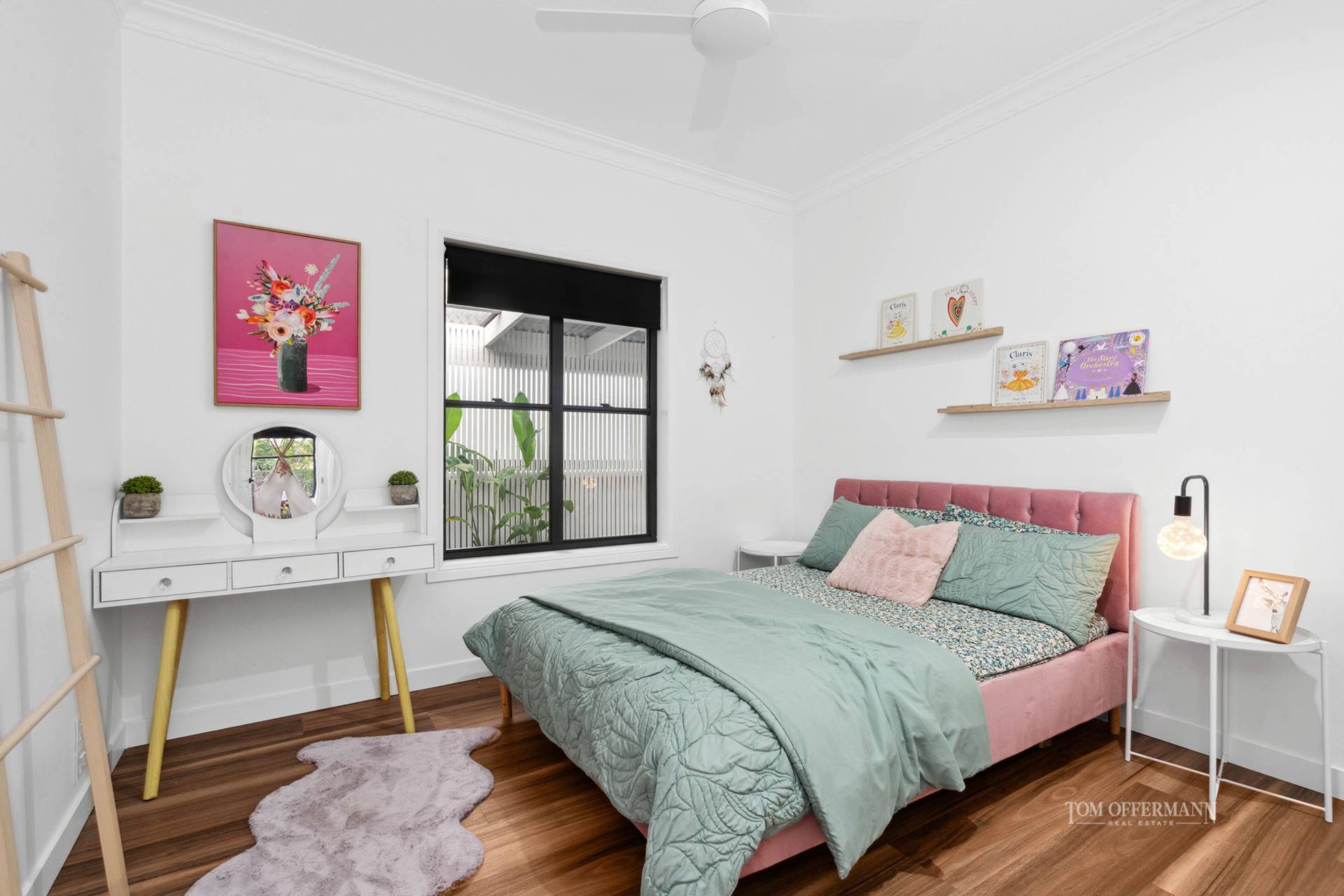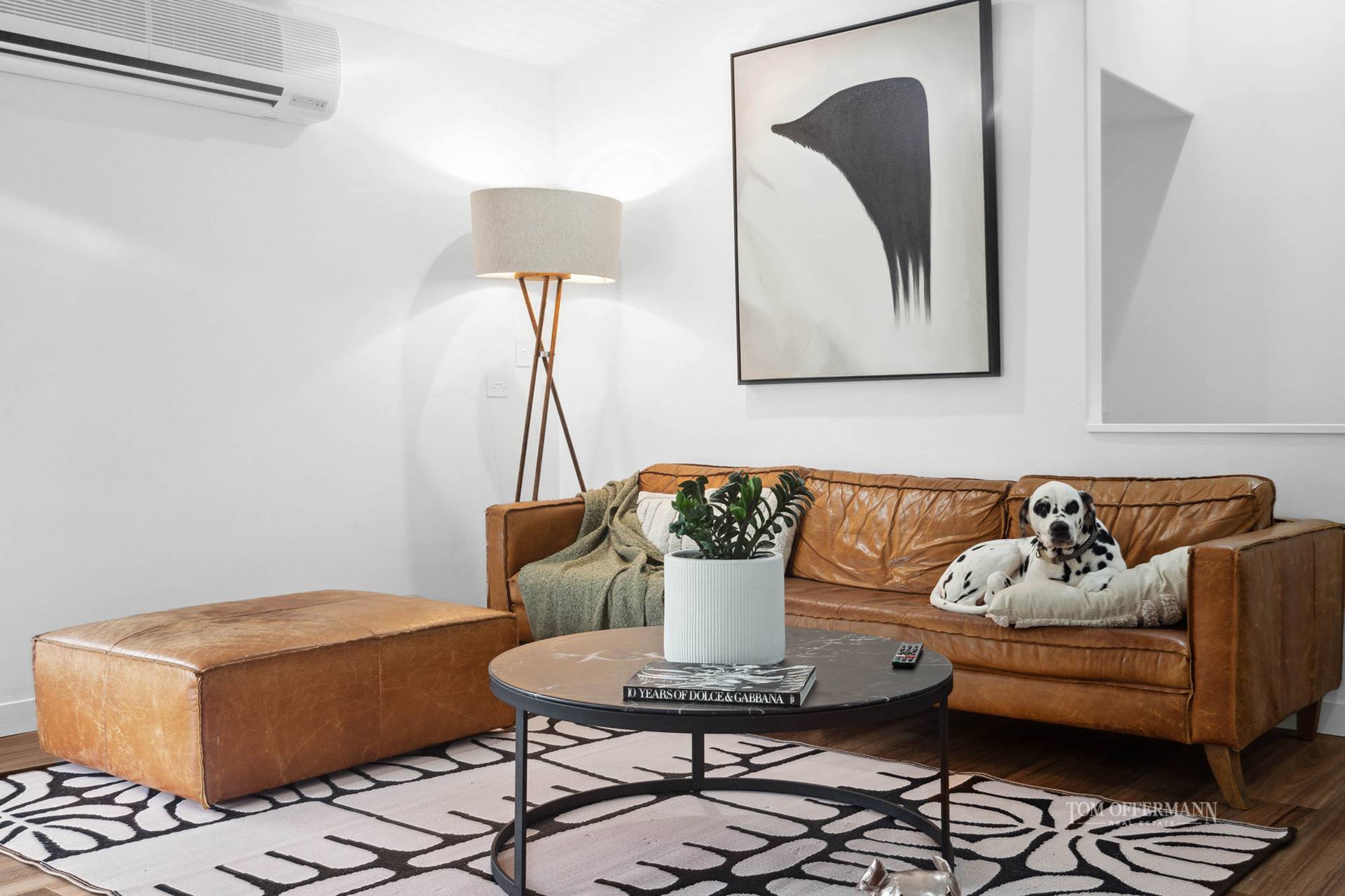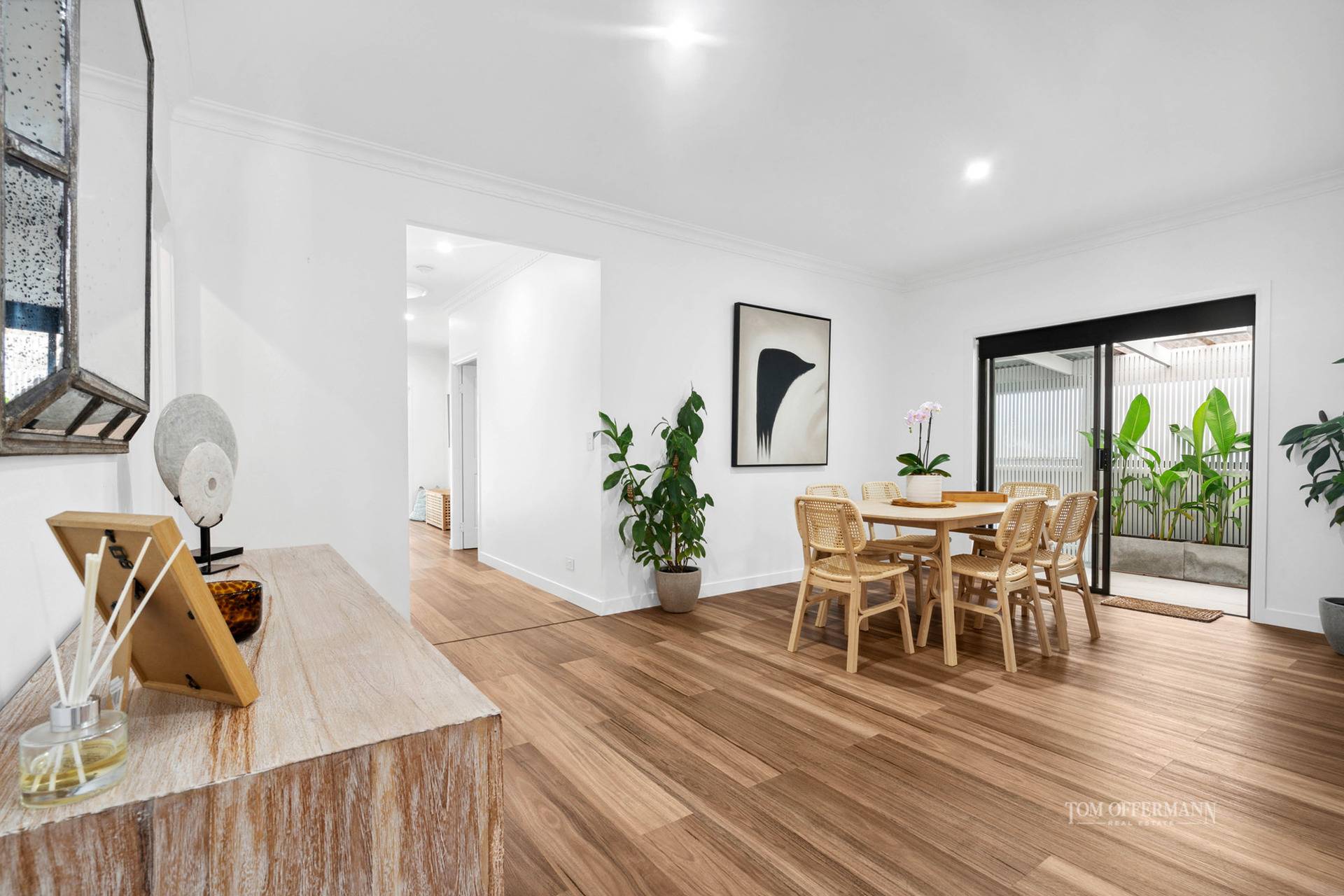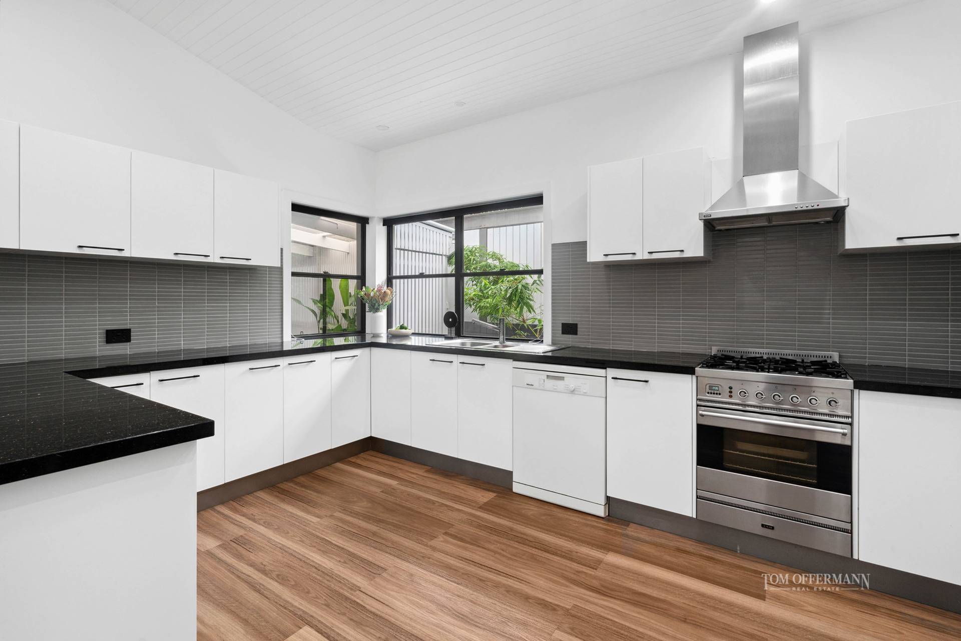 Enjoying the perfect northerly orientation is a lush front garden and terrace. Step inside. Subtle earthiness establishes its roots with vaulted ceilings and natural light shadow dancing over the spotted gum-toned flooring in the bright white spaces, all accented by a monochromatic palette, and features such as fluted and VJ walls in white, and black.