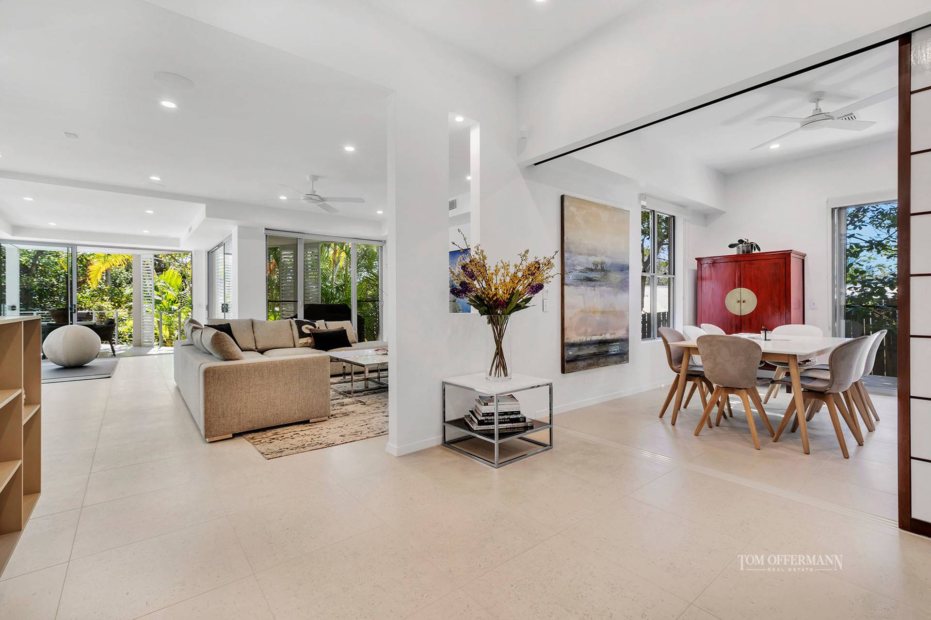 A spectacular glass entry door magically teases, stepping into the gallery-style foyer, divulging design excellence such as a shoji-style wall, and a spectacular albeit cheeky artwork claims the spotlight.