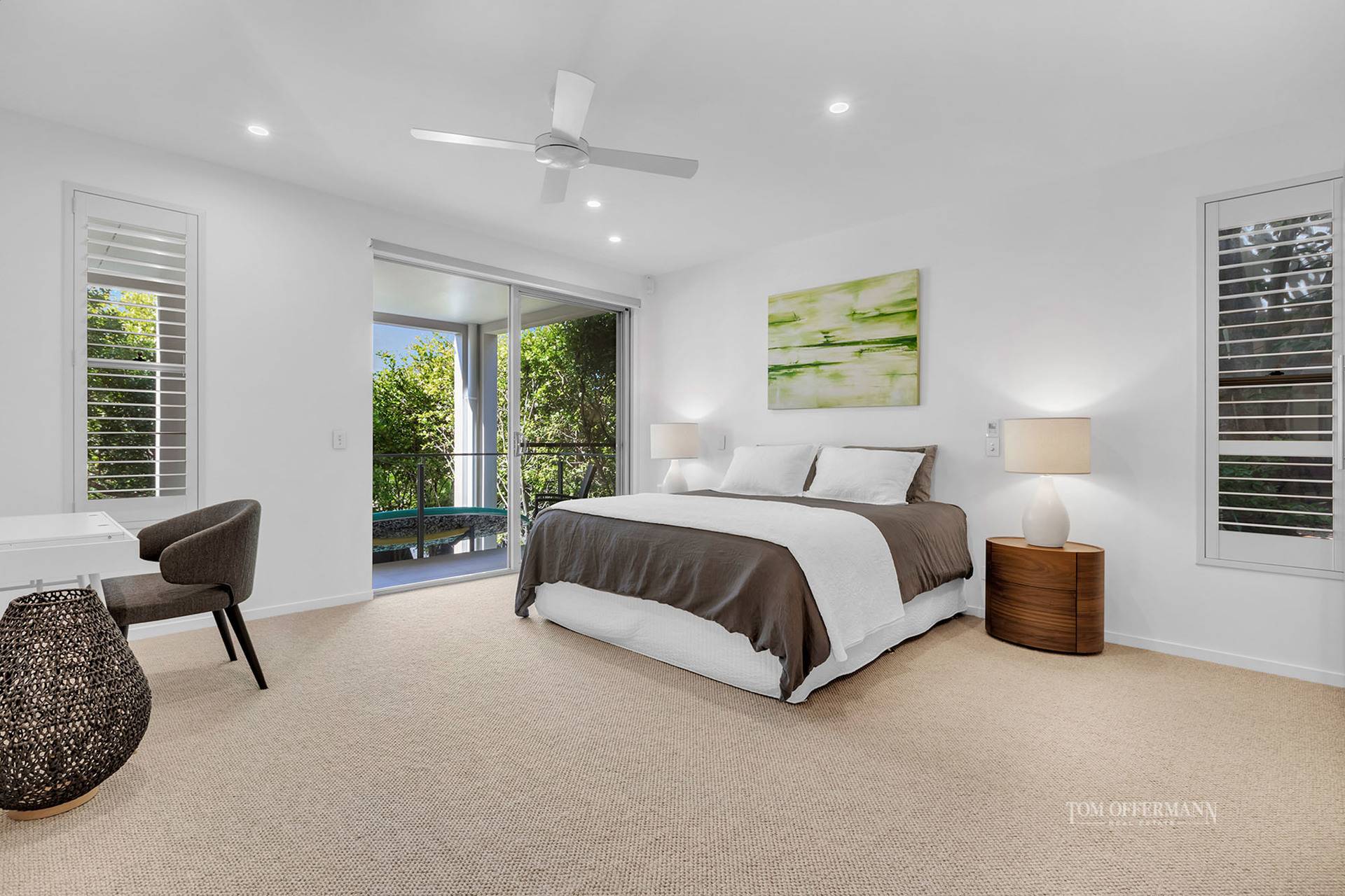 - 5 Bedrooms: entry level premier king w timber floors, plantation shutters, sofa, filtered views thru verdant rainforest & terrace access; WIR + BIR; ensuite w 2-basin stone topped timber-fronted cabinetry, bidet & dble shower opens out to alfresco terrace w Japanese-style bathhouse w grey stone spa bath & gym equipment; 4 bedrooms lower level - king bedroom suite w double door entry to expansive space w bunk bed, WIR + BIR, ensuite w 2-basin stone cabinetry + access to 3 terraces; 3 generous bedrooms w BIR; 2 w access to undercover terrace; share bathroom w designated laundry area