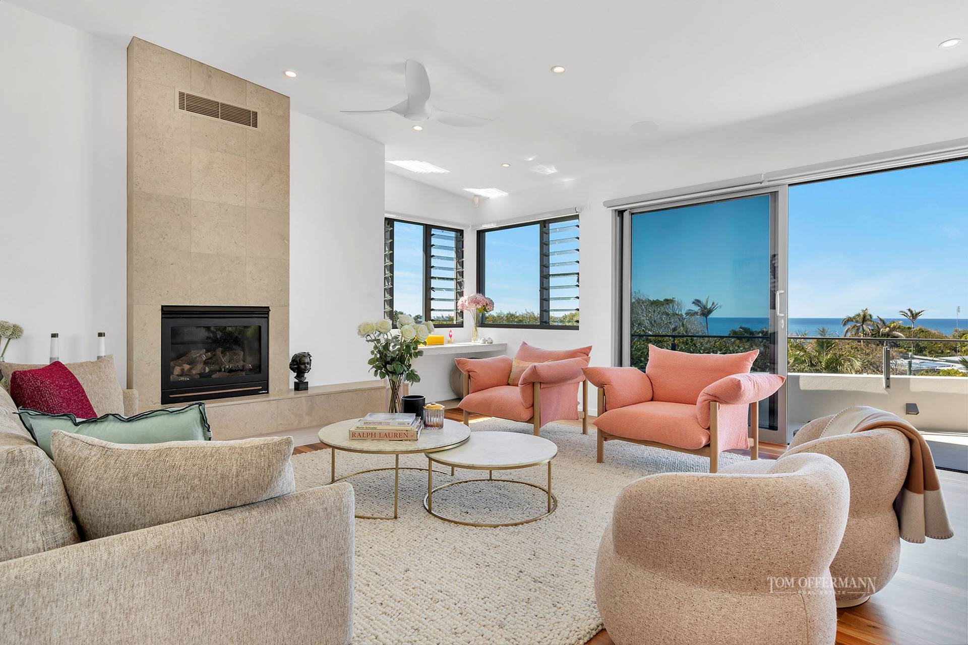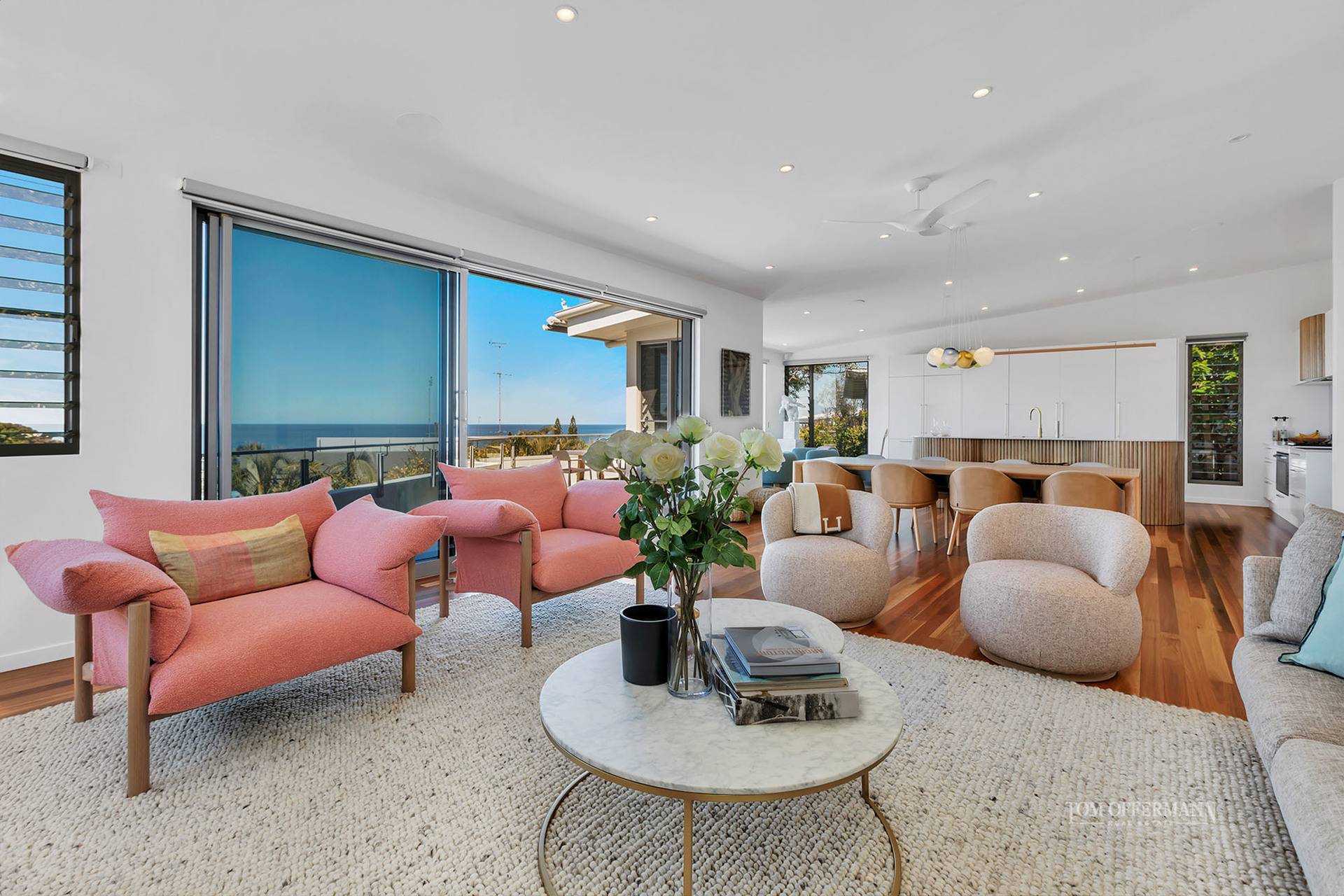 - Living spaces & terraces: entry level w wide NE ocean & headland views; Byron blackbutt flooring; stone feature wall & gas fireplace; designer rugs; pastel modern sofas & chairs; large colourful artworks; timber dining table w 12 ball cluster of hand-blown glass; downstairs open plan living & dining opens to 2 undercover terraces & pool w sun terrace; kitchenette/bar stone-topped w Panasonic convec/micro oven