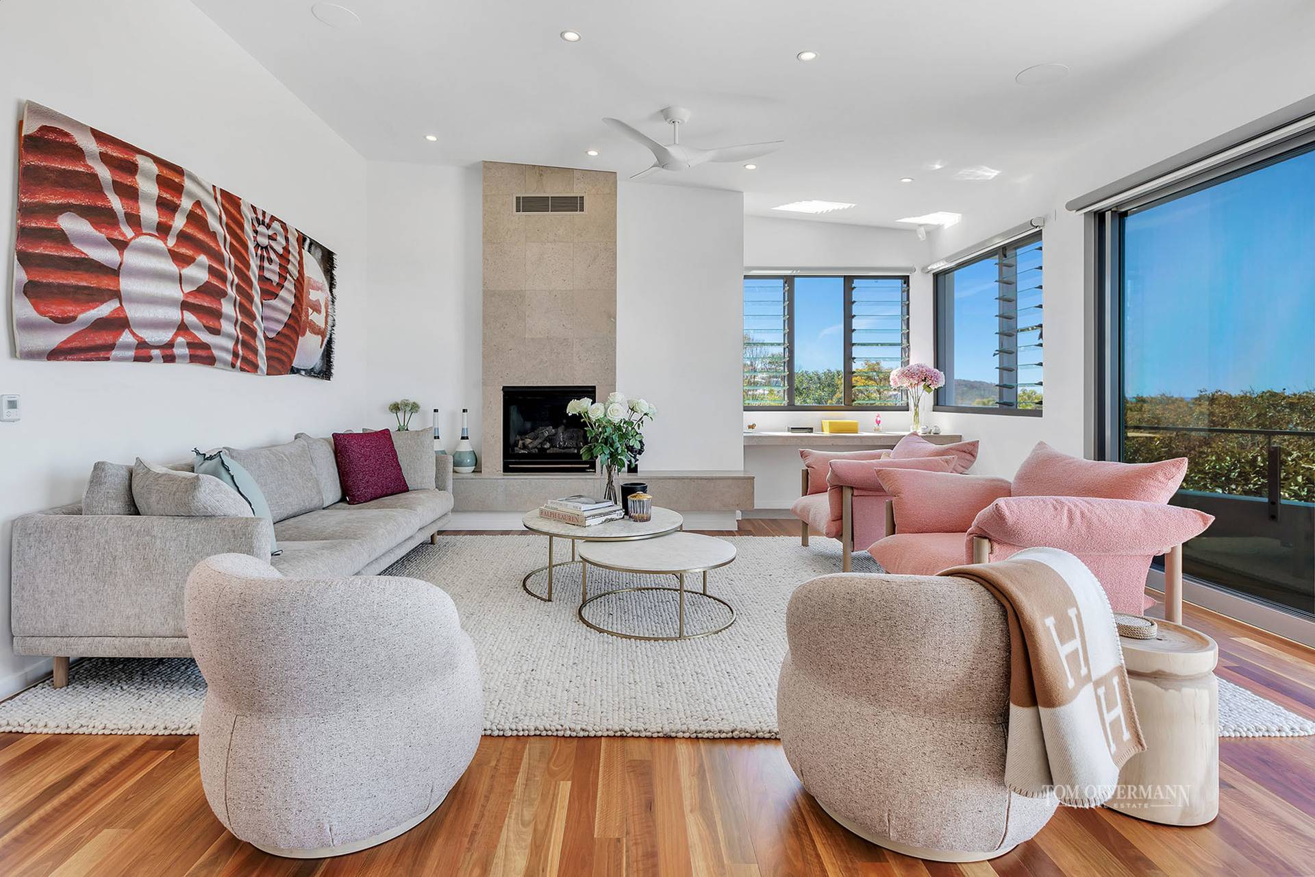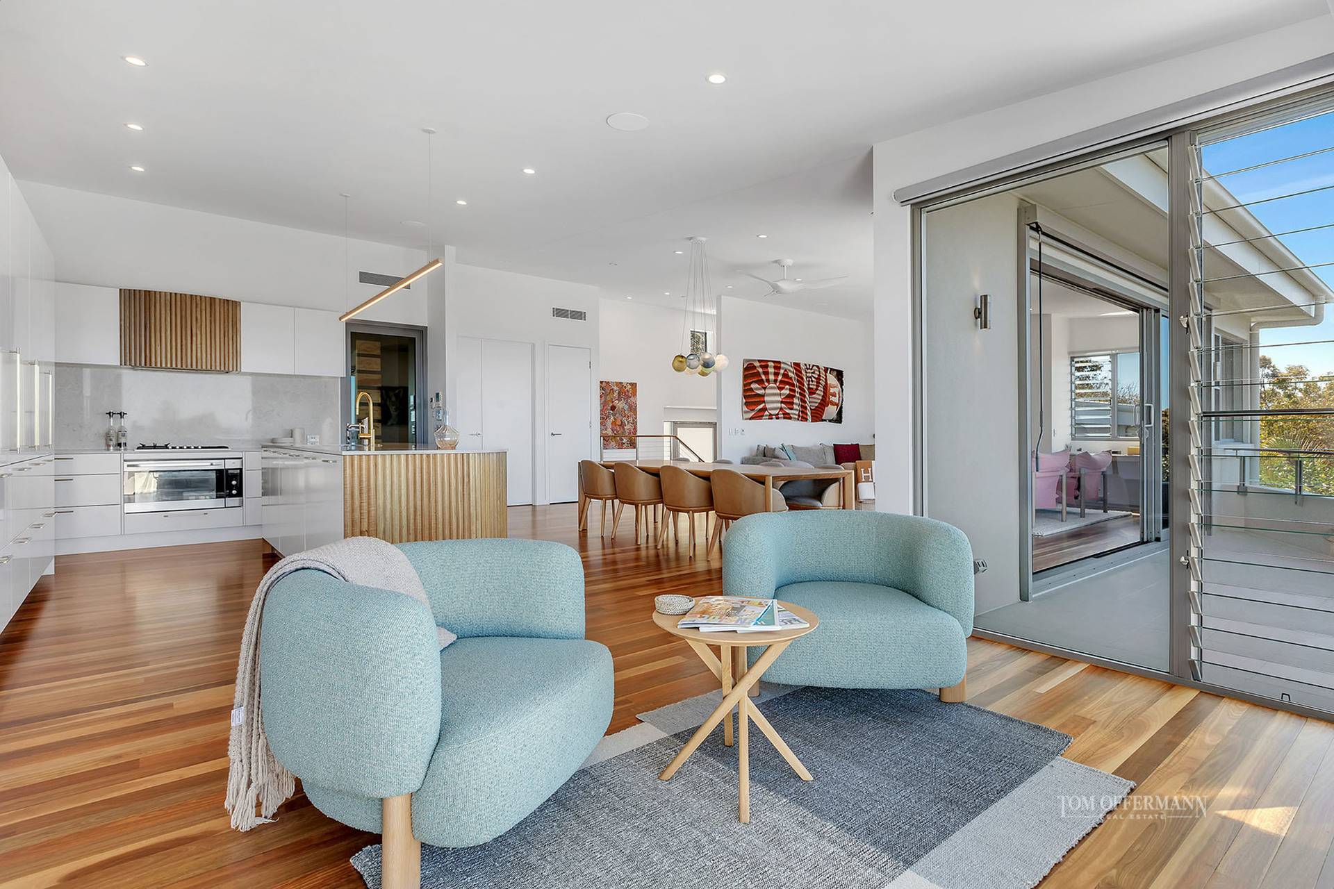 More eye-catching avantgarde art in the prodigious living areas is complemented by uber modern pastel hued armchairs and sofas, designer rugs, chilled coastal accents and accessories, a custom stone feature wall with fireplace, and above the dining table, a striking pendant of twelve hand-blown glass balls.