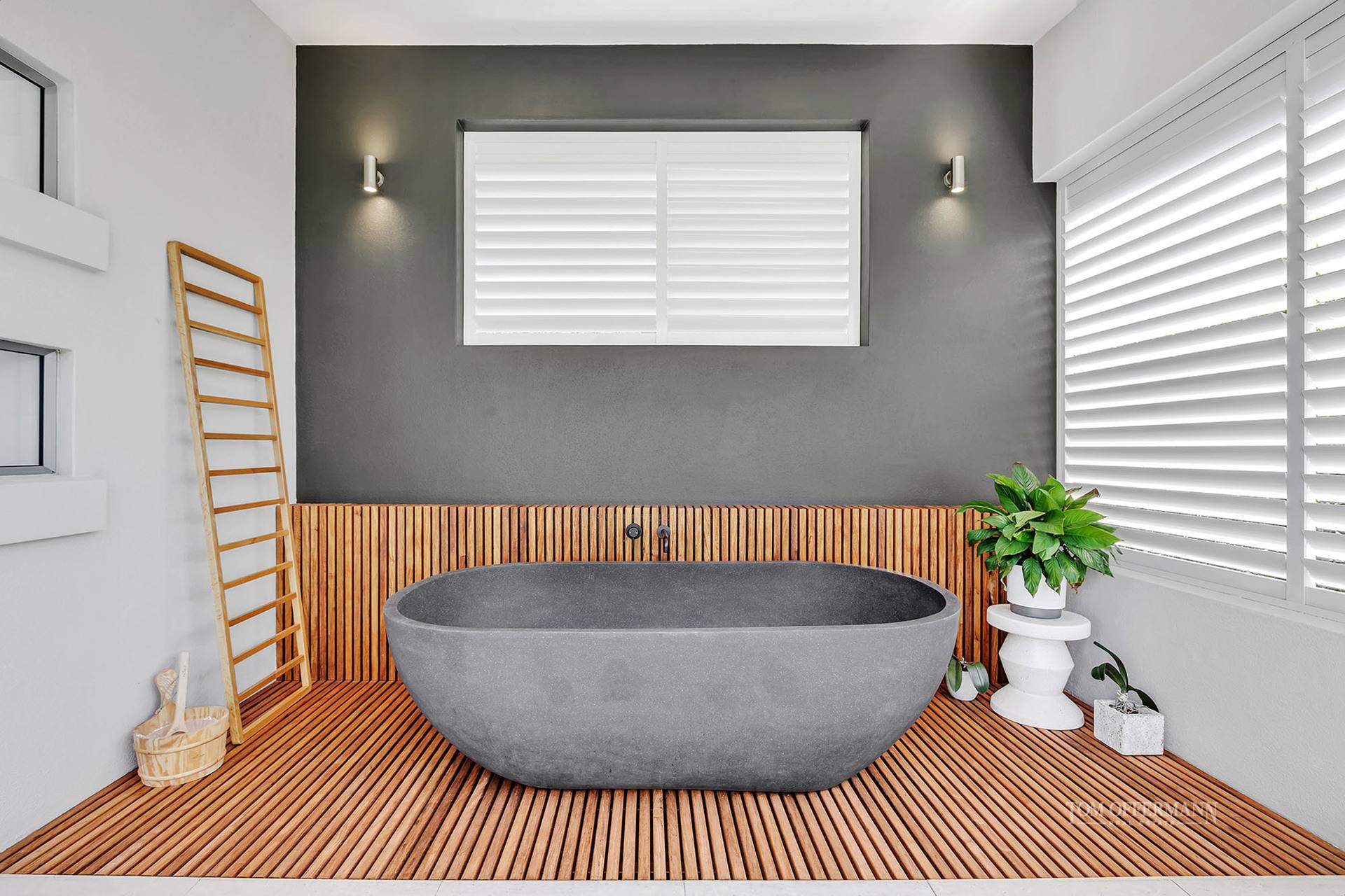 Generous yet serene sculpted architecture, fringed by evergreen pandanus and red bromeliads, is enhanced by layers of grey slatted timber evoking privacy and mystery, defining the lush streetscape, and seducing escapes to a 'salty' life 300-metres from back gate to toes-in-the-sand of Sunshine Beach.