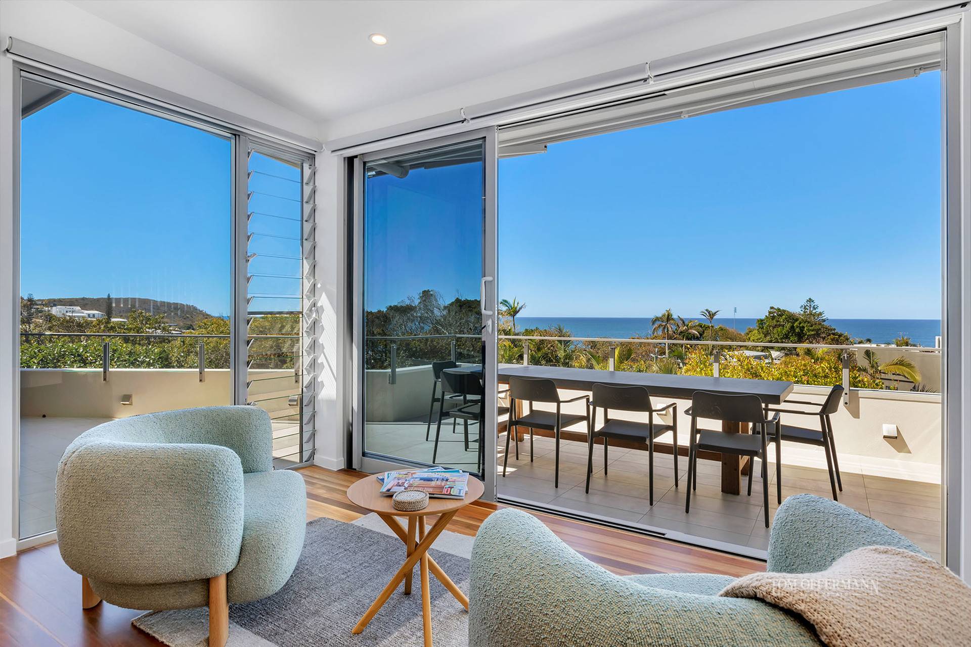 An abundance of natural light, thanks to high ceilings and disappearing doors, shadow prances across ostensibly endless polished timber flooring, and blurs the lines between inside and out to terraces, the length of the three living spaces. Engaging views sweep east across the Coral Sea from the Noosa National Park headland in the north, and alfresco entertaining options, are aplenty.