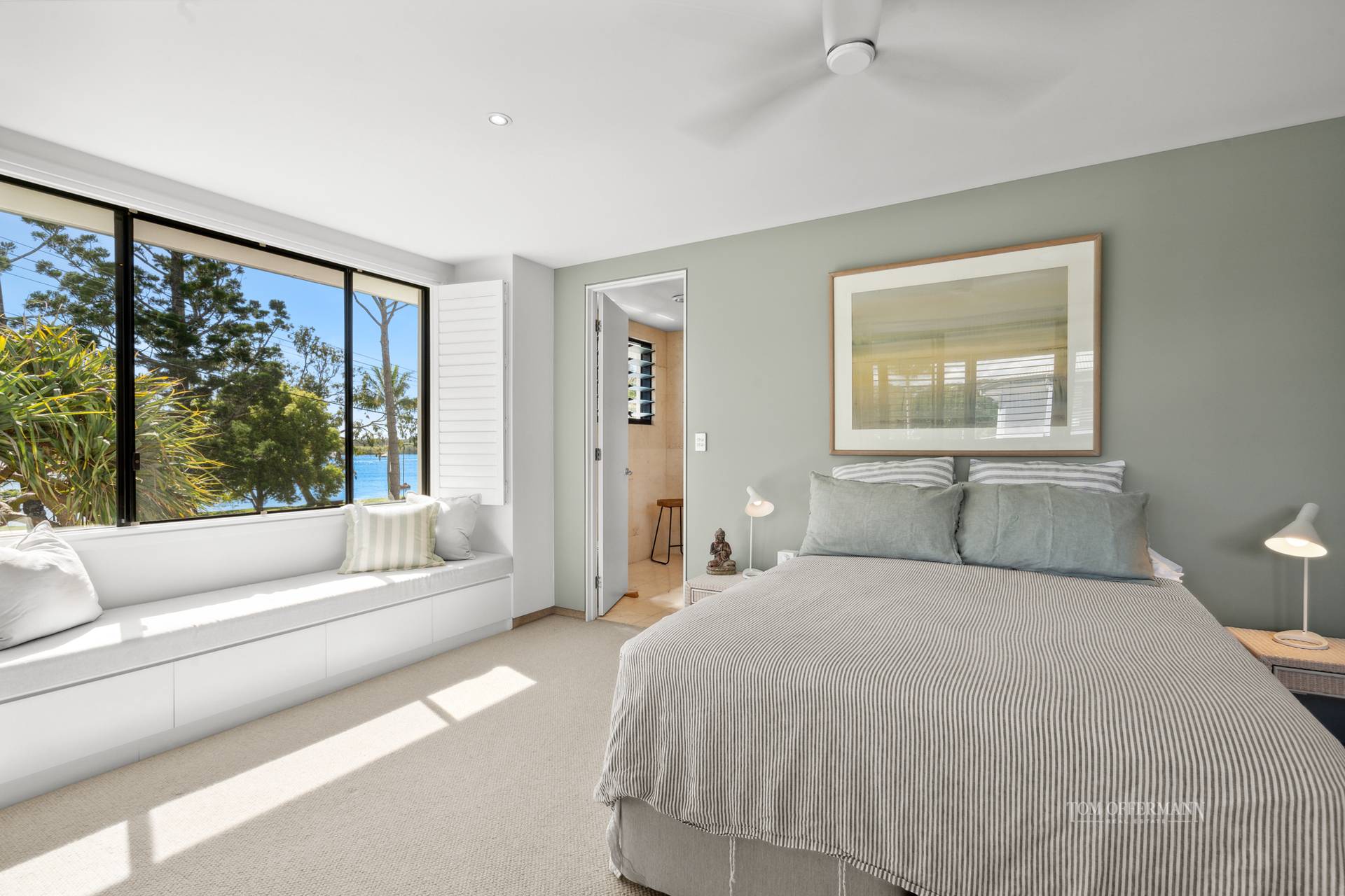 Upstairs are three carpeted bedrooms. The premier retreat suite has a terrace suggesting morning tea whilst watching the parade of people and dogs on the pathway parallel to the Noosa River; a similar scene from a picture window with wispy sheers, custom seating and storage. The ensuite has a double walk-in shower, stone-topped cabinetry and in addition to a dressing room, there's a study.