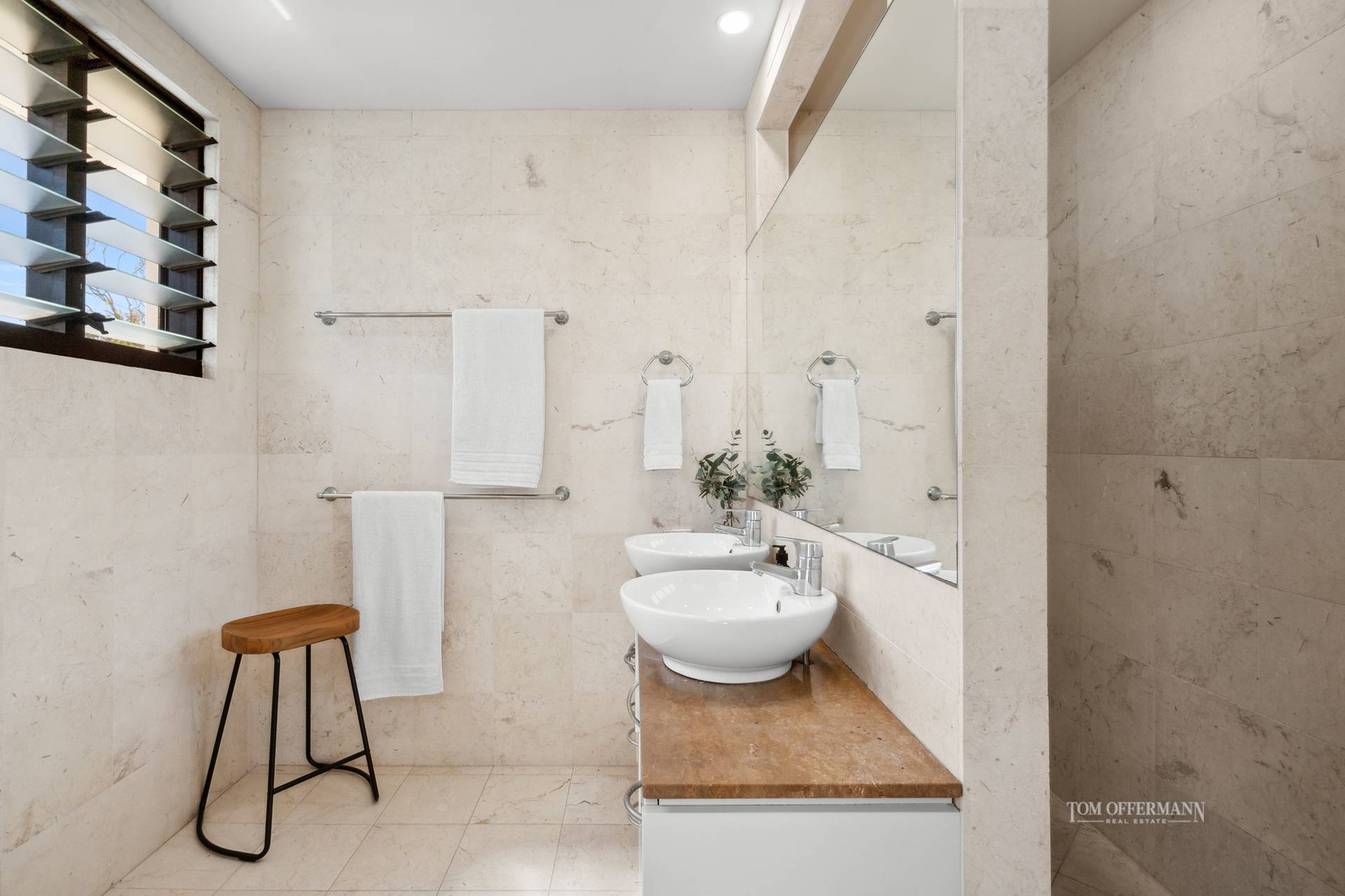 • About: entry w large water feature; custom pivot timber & glass paned door; plantation shutters; high ceilings; louvres; fans/ducted aircon; limestone tiles throughout incl floor to ceiling in bathrooms, powder room & laundry; L-shaped open plan living & dining both open to 4.8mx3.8m undercover terrace which wraps nth, east & sth sides; 3 carpeted bedrooms – premier suite w NW-facing 6mx1.2m terrace; picture window wall to river view w wispy sheers, custom seating & storage; ensuite w dble shower & stone-topped 2-basin cabinetry; dressing room; adjacent study space; 2 bedrooms w BIRs; bathroom w stone-topped single basin cabinetry & bathtub; powder room; laundry; plentiful storage incl under stairs