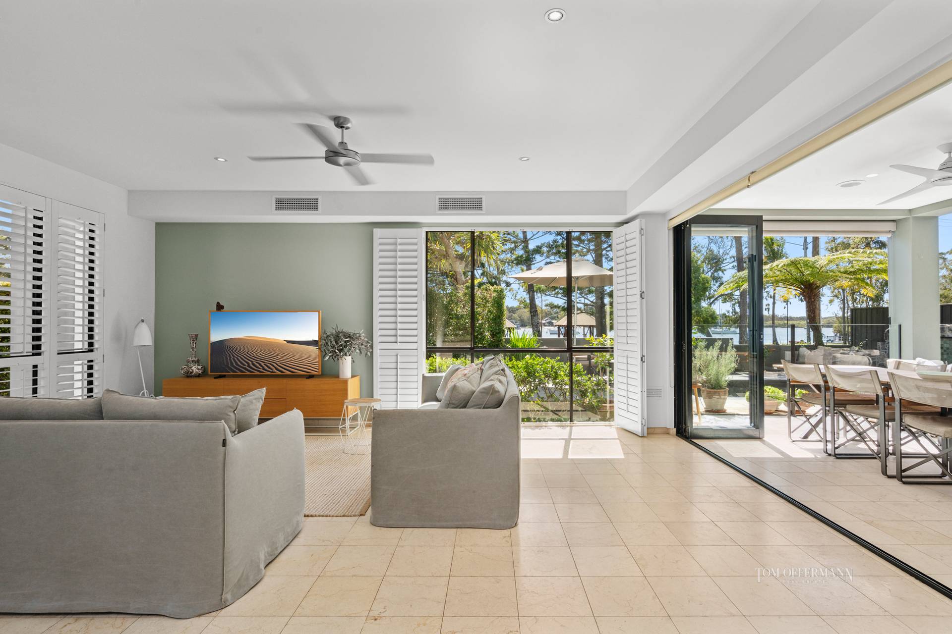 Look more closely. Note the banks of plantation shutters and the almost disappearing doors off the oversized living and dining spaces, spilling out to the undercover terrace. It extends to three sides and becomes the very heart of alfresco entertaining.
